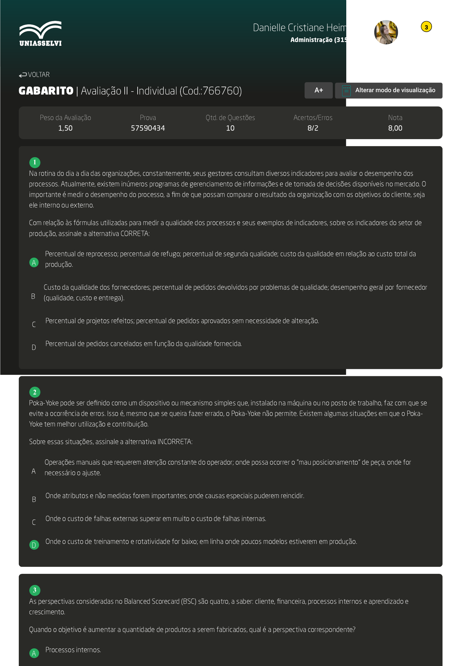 GABARITO | Avaliação II - Individual (Cod.:766760) Peso da Avaliação 1,50 Prova 57590434 Qtd. de Questões 10 Acertos/Erros 8/2 Nota 8,00 Na rotina do dia a dia das organizações, constantemente, seus gestores consultam diversos indicadores para avaliar o desempenho dos processos. Atualmente, existem inúmeros programas de gerenciamento de informações e de tomada de decisões disponíveis no mercado. O importante é medir o desempenho do processo, a fim de que possam comparar o resultado da organização com os objetivos do cliente, seja ele interno ou externo. Com relação às fórmulas utilizadas para medir a qualidade dos processos e seus exemplos de indicadores, sobre os indicadores do setor de produção, assinale a alternativa CORRETA: A Percentual de reprocesso; percentual de refugo; percentual de segunda qualidade; custo da qualidade em relação ao custo total da produção. B Custo da qualidade dos fornecedores; percentual de pedidos devolvidos por problemas de qualidade; desempenho geral por fornecedor (qualidade, custo e entrega). C Percentual de projetos refeitos; percentual de pedidos aprovados sem necessidade de alteração. D Percentual de pedidos cancelados em função da qualidade fornecida. Poka-Yoke pode ser definido como um dispositivo ou mecanismo simples que, instalado na máquina ou no posto de trabalho, faz com que se evite a ocorrência de erros. Isso é, mesmo que se queira fazer errado, o Poka-Yoke não permite. Existem algumas situações em que o Poka- Yoke tem melhor utilização e contribuição. Sobre essas situações, assinale a alternativa INCORRETA: A Operações manuais que requerem atenção constante do operador; onde possa ocorrer o “mau posicionamento” de peça; onde for necessário o ajuste. B Onde atributos e não medidas forem importantes; onde causas especiais puderem reincidir. C Onde o custo de falhas externas superar em muito o custo de falhas internas. D Onde o custo de treinamento e rotatividade for baixo; em linha onde poucos modelos estiverem em produção. As perspectivas consideradas no Balanced Scorecard (BSC) são quatro, a saber: cliente, financeira, processos internos e aprendizado e crescimento. Quando o objetivo é aumentar a quantidade de produtos a serem fabricados, qual é a perspectiva correspondente? A Processos internos. VOLTAR A+ Alterar modo de visualização 1 2 3 Danielle Cristiane Heimburg Administração (3152774) 3 B Financeira. C Aprendizado e crescimento. D Crescimento. O papel dos gestores das empresas é fazer com que as pessoas acreditem que a qualidade é importante para a empresa e para elas próprias. As pessoas precisam entender que qualidade não é responsabilidade de apenas algumas pessoas. Sobre esse tema, assinale a alternativa CORRETA: A A qualidade está na nossa forma de pensar e agir em todas as etapas do processo. B A qualidade está na nossa forma de gerenciar custos e riscos. C A qualidade está na nossa forma de lidar com problemas. D A qualidade está na nossa forma de ter pensamento de dono. No que concerne à Gestão da Qualidade de Produtos e Processos, temos várias questões associadas. Sobre esse tema, assinale a alternativa CORRETA: A Entende-se que uma empresa sem um Sistema de Informações Gerenciais facilmente obterá lucros, já que terá entradas mais altas que saídas. B Entende-se que uma empresa sem um Sistema de Informações Gerenciais dificilmente obterá lucros, já que terá saídas mais altas que entradas. C Entende-se que uma empresa sem um Sistema de Informações Gerenciais sobrevive estavelmente. D Entende-se que uma empresa sem um Sistema de Informações Gerenciais é como fazer um “voo cego”, ou seja, não se saberá para onde se está indo. Podemos verificar o comportamento dos clientes de diversas formas, seguindo alguns critérios. Quais são esses critérios? A Produtos comprados ou não comprados, exigências de opções, exigências especiais, produtos bem-sucedidos ou malsucedidos. B Produtos comprados ou não comprados, exigências de opções, valor do produto, produtos bem-sucedidos ou malsucedidos. C Produtos comprados ou não comprados, exigências de opções, exigências especiais, produtos bem-sucedidos e não malsucedidos. D Produtos comprados ou não comprados, exigências de opções, marketing, produtos bem-sucedidos ou malsucedidos. 4 5 6 Danielle Cristiane Heimburg Administração (3152774) 3 Visando à redução de custos, muitas empresas optam pela formação de parcerias com seus fornecedores, cujo nível ideal de relacionamento é chamado de Comakership. A implantação dessas parcerias pode representar um aumento da competitividade das empresas, porém, ela depende do atendimento a alguns requisitos, obtidos em etapas. Sobre a implantação do sistema Comakership, classifique V para as sentenças verdadeiras e F para as falsas: ( ) Em uma das fases de evolução do processo de implantação da ferramenta Comakership, faz-se necessário selecionar fornecedores, tendo como requisito a qualidade. ( ) Em uma das etapas evolutivas do processo de implantação, cliente e fornecedor interagem com o intuito de estudarem os seus processos de forma mútua, promovendo a integração estratégica. ( ) Em uma das etapas desse processo, busca-se determinar o preço de custo dos materiais fornecidos, somando a estes os custos do produto já produzido. A essa etapa denominamos integração de custos. ( ) A implantação da ferramenta Comakership pode resultar em uma condição de fornecimento sincronizado de insumos. Nesse caso, parte- se da condição de que o fornecedor apresente qualidade assegurada. Assinale a alternativa que apresenta a sequência CORRETA A V - F - V - F. B V - V - F - V. C F - F - V - V. D F - V - F - F. Na atual sociedade industrial, sustentada por um crescente consumo e inserida cada vez mais na corrida pela competitividade mundial, todas as empresas precisam buscar processos estáveis, que consigam altos índices