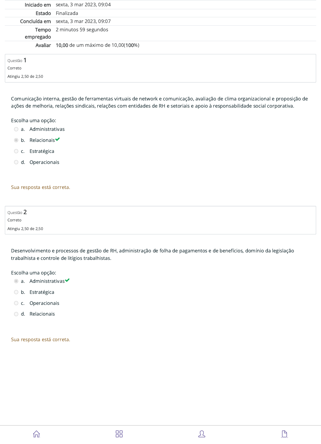 03/03/2023, 08:08 Atividade - Unidade 2: Revisão da tentativa https://eskadauema.com/mod/quiz/review.php?attempt=4533757&cmid=1862 1/2 Iniciado em sexta, 3 mar 2023, 09:04 Estado Finalizada Concluída em sexta, 3 mar 2023, 09:07 Tempo empregado 2 minutos 59 segundos Avaliar 10,00 de um máximo de 10,00(100%) Questão 1 Correto Atingiu 2,50 de 2,50 Questão 2 Correto Atingiu 2,50 de 2,50 Comunicação interna, gestão de ferramentas virtuais de network e comunicação, avaliação de clima organizacional e proposição de ações de melhoria, relações sindicais, relações com entidades de RH e setoriais e apoio à responsabilidade social corporativa. Escolha uma opção: a. Administrativas b. Relacionais c. Estratégica d. Operacionais Sua resposta está correta. Desenvolvimento e processos de gestão de RH, administração de folha de pagamentos e de benefícios, domínio da legislação trabalhista e controle de litígios trabalhistas. Escolha uma opção: a. Administrativas b. Estratégica c. Operacionais d. Relacionais Sua resposta está correta. https://eskadauema.com/my https://eskadauema.com/index.php?redirect=0 https://eskadauema.com/user/edit.php?id= https://eskadauema.com/theme/olm/certificates.php 03/03/2023, 08:08 Atividade - Unidade 2: Revisão da tentativa https://eskadauema.com/mod/quiz/review.php?attempt=4533757&cmid=1862 2/2 Questão 3 Correto Atingiu 2,50 de 2,50 Questão 4 Correto Atingiu 2,50 de 2,50 Termos de uso Política de privacidade Recrutamento e seleção, plano de carreira, compensação e benefícios, programas de desenvolvimento de pessoal, sistemas de avaliação de desempenho, programas motivacionais, saúde e segurança ambiental e apoio aos executivos em suas funções como reais gestores de gente. Escolha uma opção: a. Relacionais b. Operacionais c. Administrativas d. Estratégica Sua resposta está correta. Políticas de RH, entendimento do negócio, plano estratégico de recursos humanos, orientação a gestores para que cumpram o papel de gestão de seu pessoal, gestão de banco de talentos e apoio como agente de mudanças. Escolha uma opção: a. Relacionais b. Administrativas c. Estratégica d. Operacionais Sua resposta está correta. https://eskadauema.com/admin/tool/policy/view.php?policyid=1&versionid=3 https://eskadauema.com/admin/tool/policy/view.php?policyid=2&versionid=2 https://eskadauema.com/my https://eskadauema.com/index.php?redirect=0 https://eskadauema.com/user/edit.php?id= https://eskadauema.com/theme/olm/certificates.php