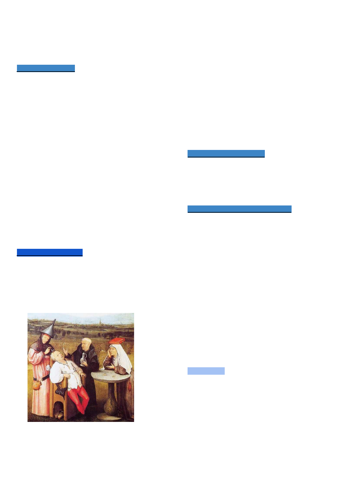 Históri� d� Psiquiatri� PSIQUIATRIA - AULA 3 H2, JOELMA - MED 8 A psiquiatria antiga: - Registrados por toda história através de pintores, escultores, médicos, poetas e historiadores. - Civilizações muito antigas como Egito e Babilônia descrevem alguns transtornos mentais. Anatomia do cérebro e útero (hysteros). - Rei francês Carlos VI, chamado de Carlos o louco o qual acreditavam ser feito de vidro e tinha em suas vestes inseridas hastes para que não se partisse em pedaços. - Na Grécia, os transtornos mentais eram tidos como vinganças dos Deuses, mas no mesmo período (V a.C.) alguns médicos começaram atentar e a tratar. ``Os homens deveriam saber que só o cérebro provém as alegrias, os gozos, as risadas, os jogos, e também as tristezas, as dores, desalentos e lamentações … Com o mesmo órgão ficamos loucos, deliramos, nos assaltam temores e terrores, de dia e de noite …´´ - Hipócrates 4600 a.C. 370 a.C. A psiquiatria medieval: - A idade das trevas e o retrocesso as concepções mágico-religiosas. - Igreja católica e inquisição queimavam os doentes mentais sob a alegação que estariam possessos por dentro. Extração da Pedra da Loucura - Hieronymus Bosh. Pintor holandes 1475 D.C. Progresso científico no século XVIII vem com os estudos do médico francês Phillipe Pinel, o qual instituiu reformas sanitárias para cuidados com os doentes mentais. A psiquiatria acompanhou um ritmo mais lento do que as outras especialidades médicas pela sua mescla científico filosófica até meados do século XIV se firmando décadas mais tarde como ciência médica. O médico alemão Emil Kraepelin foi o primeiro a dividir a psicose em dois grupos: psicose maníaco depressiva e esquizofrenia. Tratamento em psiquiatria: Até aproximadamente o século XVII, os tratamentos consistiam em intermináveis banhos quentes ou chuveirada fria, que se assemelhavam a punições. Métodos mais punitivos eram comuns … Tratamento biológico em psiquiatria: - Influência das substâncias no psiquismo humano: pré-história e história. - Derivados ALCOÓLICOS. O álcool é uma das drogas mais antigas, que se tem notícia, atuando no psiquismo humano. - NOÉ tomou vinho e foi encontrado nu em sua tenda por CAM (Gn 9). - HAXIXE: os assírios o conheciam desde o século 8 a.C. Era usado para suavizar a realidade da vida. - COCA: uma deusa inca teria entregado a folha de coca aos homens para ``saciar os esfomeados e fazer esquecer a adversidade´´. - ÓPIO: dizia a lenda que CERES havia presenteado os mortais com dormideiras para livrá-los dos seus sofrimentos e dos seus males. Os pioneiros: - Albrecht Von Haller, 1773 - 1777: primeira descrição da ação do ópio. Descreveu as virtudes psicotrópicas do ópio para sua ``depressão´´ senil, usou a droga como auto-medicação para provável doença renal. - Emil Kraepelin, 1883: publicação de artigo sobre a ação de medicamentos em determinados fenômenos psicopatológicos. - Em 1892: publicação da obra ``Sobre a influência de alguns medicamentos em determinados fenômenos psíquicos elementares´´. - Fundador da farmaco psicologia. - O trabalho experimental de Kraepelin referia-se a morfina, chá, álcool, éter, cloraldeído e paraldeído. Síntese da mescalina: - Bernardino de Sahagun levou a raiz de Peyote do México para a Europa. A planta era venerada como uma deusa, era preparada e quando consumidas levavam a embriaguez dos indígenas. - Lewin, 1888 houve as primeiras investigações farmacológicas sobre o peyote. - Prentiss e Morgan, 1894. Americanos fizeram os primeiros ensaios com a substância do peyote. Notaram, com as pálpebras fechadas, uma cintilação colorida e sentiram modificação agradável do humor e enfraquecimento na noção de tempo. - E.Spath, 1918 um químico sintetizou a mescalina, extraída do peyote. Descoberta do LSD-25: dietilamida do ácido lisérgico. Albert Hofmann, 1943. Dos laboratórios Sandoz S.A. Descobriu, por acaso, as ações do LSD sobre si mesmo. Descrição de Hofmann: ``Na sexta-feira passada, à tarde, tive de interromper o trabalho e seguir para meu domicílio a fim de aí me tratar, pois sentia-me vítima duma singular agitação acompanhada de leves vertigens. Logo que cheguei a casa deitei-me, sentindo-me mergulhado num estado de embriaguez, que longe de ser desagradável, se caracterizava por uma imaginação muito viva. Num estudo crepuscular, de olhos fechados, porque a claridade me ofuscava, percebia, sem cessar, imagens fantásticas duma plasticidade extraordinária, de cores berrantes, como as dum caleidoscópio´´. - Em 1922, Klaesi em Roma, criou a ``cura pelo sono´´ com derivado de ácido barbitúrico. - 1933 - 1934: M.Sakel, começou a insulinoterapia, nada mais do que um coma insulínico para tratamento de esquizofrenia. - 1934 - 1935: Von Meduna iniciou o choque cardiazólico (metrazol), baseado na suposta exclusão recíproca de esquizofrenia e da epilepsia. - 1935: Egas Moniz iniciou a lobotomia pré-frontal, chegando a ganhar um prêmio nobel por esse feito. - 1952: introdução da clorpromazina em psiquiatria. - Laborit e Huguenard utilizaram-na no ``cocktail´´ para criar a "hibernação artificial´´ anestesia. - Hamon e col. a utilizaram no tratamento da mania. - J.Delay e col. ampliaram o seu emprego em diversas psicoses. - Ainda em 1952 Leonhard Rauwolf importou o arbusto indiano (Rauwolfia serpentina) para a Europa e depois Welber utilizou a droga para tratar psicóticos. - 1952: Edward H. Robitzek e col. afirmaram que o tuberculostático iproniazida teria influência no humor dos pacientes. - Descoberta a ação inibidora da enzima mono amino-oxidase pela iproniazida. - 1958: a APA classificou a inoproniazida como physich energizer. ** Em 1957 Rolan Kuhn reconheceu a ação antidepressiva de um derivado do iminodinenzilo. A imipramina confirmada um ano mais tarde por P.Kielholz e Battegay. - 1957: Rolan Kuhn estudava as propriedades anti