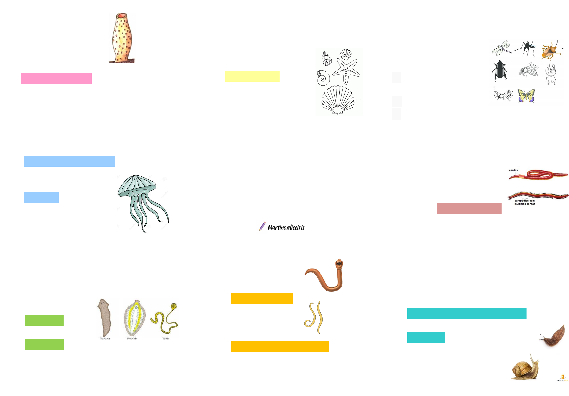 ANIMAIS INVERTEBRADOS PORÍFEROS ▪ Esponjas ▪ Assimétricas ▪ Acelomadas ▪ Sésseis ▪ Não formam tecidos ▪ Filtradores ▪ Pinacócito, porócito e coanócito ▪ Reprodução sexuada e assexuada CNIDARIOS ▪ Com tecidos diferenciados ▪ Celenterados ▪ Simetria radial ▪ Diblásticos ▪ Acelomados ▪ Forma nadante: medusa ▪ Forma fixa: pólipo ▪ Cnidócitos ▪ Ovo oligolécito/isolécito PLATELMINTOS ▪ Vermes achatados ▪ Simetria bilateral ▪ Triblásticos ▪ Blastóporo ▪ Acelomado ▪ Excreção: células flama ▪ Sistema nervoso ganglionar ▪ Ovo heterolécito/mesolécito NEMATELMINTOS ▪ Vermes cilíndricos ▪ Pseudocelomados ▪ Simetria bilateral ▪ Triblásticos ▪ Protostômios ▪ Sistema digestório completo ▪ Excreção: amônia ▪ Ovo oligolécito/isolécito MOLUSCOS ▪ Animais de corpo mole ▪ Simetria bilateral ▪ Protostômios: boca surge primeiro ▪ Triblásticos ▪ Celomados ▪ Cabeça, pés e massa visceral ▪ Rádula e manto ▪ Excreção: metanefrídeos ▪ Ovo heterolécito EQUINODERMOS ▪ Endoesqueleto ▪ Simetria bilateral e pentaradial ▪ Triblásticos ▪ Celomados ▪ Deuterostômios ▪ Sistema ambulacrário ▪ Pedicelária ▪ Digestão extracorpórea ARTROPODES ▪ Presença de exoesqueleto (quitina) ▪ Ecdise (muda) ▪ Aracnídeos → quelíceras ▪ Crustáceos ↪ Cefalotórax e abdômen ▪ Insetos ↪ Respiração traqueal ↪ Excreção →túbulos de Malpighi ANELIDEOS ▪ Corpo segmentado ▪ Simetria bilateral ▪ Triblásticos ▪ Protostômios ▪ Circulação fechada ▪ Celomados ▪ Respiração cutânea e branquial ▪ Excreção: metanefrídeos