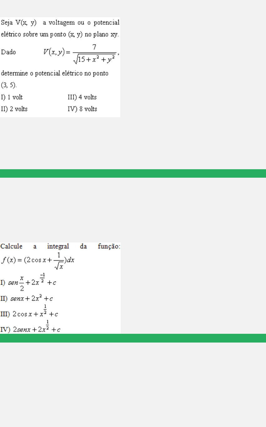 1Existem várias aplicações que podem ser feitas utilizando o conceito de funções. Desta forma, leia a questão a seguir e assinale a alternativa CORRETA: A A opção II está correta. B A opção IV está correta. C A opção III está correta. D A opção I está correta. Formulário - Equações Diferenciais (Saulo) Clique para baixar o anexo da questão 2No cálculo, a integral de uma função foi criada originalmente para determinar a área sob uma curva no plano cartesiano e também surge naturalmente em dezenas de problemas de Física. Resolva a questão a seguir e assinale a alternativa CORRETA: A Somente a opção IV está correta. B Somente a opção III está correta. C Somente a opção I está correta. D Somente a opção II está correta. Formulário - Cálculo Diferencial e Integral (MAD) - Paulo Clique para baixar o anexo da questão 3Uma das aplicações do conceito de integração é o cálculo da área entre curvas. Este procedimento permite que sejam calculadas áreas que antes, com a utilização da geometria clássica, eram inacessíveis. Sendo assim, determine a área entre as curvas y = x² e y = x: I- A área entre as curvas é 1/3. II- A área entre as curvas é 1/2. III- A área entre as curvas é 1/6. IV- A área entre as curvas é 1/4. Assinale a alternativa CORRETA: A Somente a opção IV está correta. B Somente a opção III está correta. C Somente a opção II está correta. D Somente a opção I está correta. 4O estudo da derivação parcial permite que estendamos os conceitos estudados no Cálculo Diferencial e Integral para duas dimensões, para o espaço tridimensional. Com isto, podemos generalizar vários casos existentes e que antes não eram acessados. Baseado nisto, dada a função f(x,y) = 4x² + y², analise as sentenças a seguir: I- f(x,y) é diferenciável em todos os pontos do plano. II- A soma de suas derivadas parciais é 8x + 2y. III- A soma de suas derivadas parciais é x² - y². IV- O limite da função quando (x,y) tende a (0,0) é zero. Assinale a alternativa CORRETA: A As sentenças I e III estão corretas. B As sentenças II e III estão corretas. C As sentenças I, II e IV estão corretas. D As sentenças III e IV estão corretas. 5Calculando a área da região limitada pelas curvas y = 9 - x² e y = 0, obteremos: A Área igual a 24 u.a. B Área igual a 27 u.a. C Área igual a 32 u.a. D Área igual a 36 u.a. 6As operações inversas: adição e subtração, multiplicação e divisão, potenciação e radiciação, exponenciação e logaritmação, já são bastante conhecidas. A integração indefinida é basicamente a operação inversa da diferenciação. Assim, dada a derivada de uma função, o processo que consiste em achar a função que a originou, ou seja, achar a sua primitiva denomina-se de antiderivação. Baseado nisso, analise as opções que apresentam f(x), sendo que f'(x) = x² - 4x +3 para todo x e f(3)=5 e assinale a alternativa CORRETA: A Apenas I. B Apenas II. C Apenas III. D Apenas IV. 7Para encontrar o domínio de uma função, você precisa analisar as restrições da função original. Deste modo, determine o domínio para a função a seguir e assinale a alternativa CORRETA: A A opção III está correta. B A opção II está correta. C A opção I está correta. D A opção IV está correta. 8No cálculo, a integral de uma função foi criada originalmente para determinar a área sob uma curva no plano cartesiano e também surge naturalmente em dezenas de problemas de Física. Resolva a questão a seguir e assinale a alternativa CORRETA: A Somente a opção III está correta. B Somente a opção I está correta. C Somente a opção IV está correta. D Somente a opção II está correta. 9Vamos analisar uma situação prática. Leia a questão a seguir e assinale a alternativa CORRETA: A A opção II está correta. B A opção III está correta. C A opção IV está correta. D A opção I está correta. 10O teorema fundamental do cálculo é a base das duas operações centrais do cálculo, diferenciação e integração, que são considerados como inversos um do outro. Isto significa que, se uma função contínua é primeiramente integrada e depois diferenciada (ou vice-versa), volta-se na função original. Sobre as integrais imediatas, classifique V para as opções verdadeiras e F para as falsas, e depois assinale a alternativa que apresenta a sequência CORRETA: A V - V - F - F. B F - V - V - F. C V - F - V - V. D V - V - F - V. 11(ENADE, 2011). A II, apenas. B I e II, apenas. C III, apenas. D I e III, apenas. 12(ENADE, 2014) No estudo de funções de variáveis reais, buscam-se informações sobre continuidade, diferenciabilidade, entre outras. Considere uma função de duas variáveis f: R²-->R, definida por A I e III, apenas. B I e II, apenas. C II, apenas. D III, apenas.