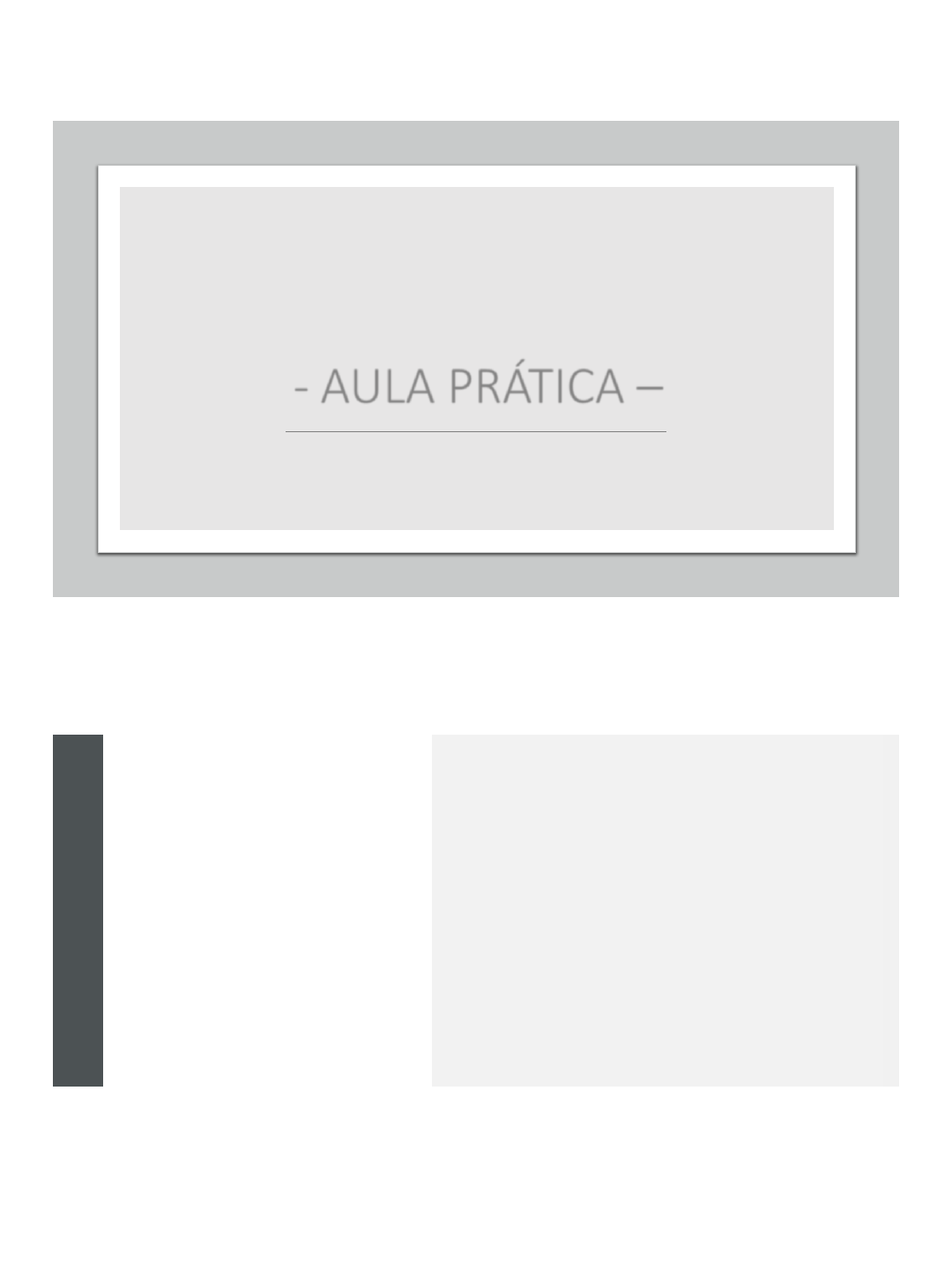 05/02/2023 1 BASES DA BIOLOGIA MOLECULAR, CELULAR E TECIDUAL - AULA PRÁTICA – Profa. Jessyka Galvão O que veremos hoje? • Microscopia óptica • Métodos empregados no estudo das células e tecidos • Bioenergética e metabolismo • Especializações de superfície livre • Organelas envolvidas na síntese de moléculas 05/02/2023 2 MICROSCOPIA ÓPTICA Objetivos da prática: • Instrumentalizar o discente no uso do microscópio óptico; • Identificar os componentes da parte mecânica e óptica do microscópio, bem como, suas respectivas funções e forma de utilização; • Dominar os conhecimentos fundamentais para operar de maneira adequada o microscópio óptico. 05/02/2023 3 Para que serve um microscópio óptico? MICROSCÓPIO (do grego micron = pequeno e scopein = examinar) 05/02/2023 4 05/02/2023 5 MÉTODOS EMPREGADOS NO ESTUDO DAS CÉLULAS E TECIDOS 05/02/2023 6 05/02/2023 7 05/02/2023 8 Observação de células da mucosa bucal no microscópio 05/02/2023 9 Procedimentos: Procedimentos: 05/02/2023 10 Procedimentos: Procedimentos: 05/02/2023 11 Procedimentos: Procedimentos: 05/02/2023 12 Procedimentos: Procedimentos: 05/02/2023 13 Procedimentos: Procedimentos: 05/02/2023 14 Procedimentos: BIOENERGÉTICA E METABOLISMO 05/02/2023 15 Corte de fígado. Mitocôndrias (setas): grânulos pequenos corados em negro (aspecto de areia fina) dispersos no citoplasma (corado pela eosina) dos hepatócitos. Por causa da pequena dimensão, não é possível identificar perfeitamente a estrutura; são identificadas pela coloração negra. As mitocôndrias são organelas diferenciadas, encontradas nas células dos eucariontes, auxiliando no processo de produção de energia. Coloração: Polak / Contra-coloração: Eosina. Barra = 40µm. ESPECIALIZAÇÕES DE SUPERFÍCIE LIVRE 05/02/2023 16 Corte de intestino delgado (jejuno-íleo). Borda estriada: Na superfície apical das células, voltada para a cavidade do órgão, observa-se um tipo de espacialização de membrana, denominada de borda em escova ou borda estriada (setas) na microscopia de luz, na microscopia eletrônica essa mesma estrutura recebe a denominação de microvilosidade, e tem como característica ser imóvel e aumentar área de absorção. Coloração: Hematoxilina e Eosina (HE). Barra = 40µm. Corte de epidídimo. Estereocílios: Revestindo o ducto, células epiteliais com especializações de membrana plasmática denominadas de estereocíclios (setas). Eles são imóveis, aumentam a área de absorção e mantém o espermatozóide na luz central do ducto. Coloração: Tricrômico de Gomori. Barra = 40µm. 05/02/2023 17 Corte de traqueia. Cílios: Observa-se uma modificação da membrana plasmática das células denominados cílios (seta). Os cílios são móveis, possuem movimento unidirecional e auxiliam no transporte de partículas. Coloração: Hematoxilina e Eosina (HE). Barra = 40µm. Corte de testículo. Flagelos: Esta imagem mostra espermatozóides, que apresentam modificações na membrana denominadas de flagelos (setas). Estes são móveis e auxiliam na locomoção desse gameta. Coloração: Tricrômico de Gomori. Barra = 40µm. 05/02/2023 18 ORGANELAS ENVOLVIDAS NA SÍNTESE DE MOLÉCULAS 05/02/2023 19 Corte de epidídimo. Complexo de Golgi: Corados em negro, na região apical das células epididimárias aparentando em conjunto a um colar em torno do lume. Por causa da pequena dimensão, não é possível identificar perfeitamente a estrutura; são identificados pela coloração negra (setas). Coloração: Aoyama e Verde Luz. Barra = 40µm. 05/02/2023 20 Corte de gânglio nervoso espinhal. Retículo Endoplasmático Rugoso (ou Granular): granulações observadas no citoplasma de neurônios ganglionares (setas). Coloração: Tricrômico de Gomori. Barra = 40µm.