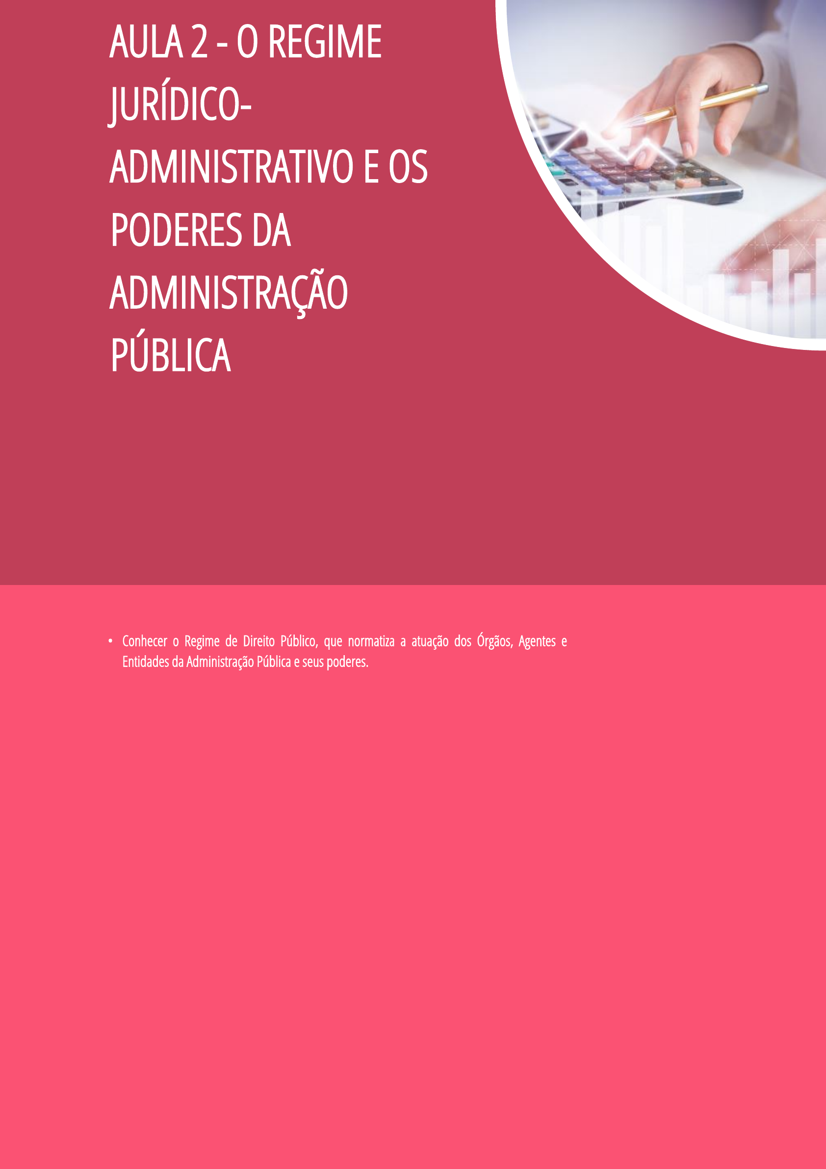 AULA 2 - O REGIME JURÍDICO- ADMINISTRATIVO E OS PODERES DA ADMINISTRAÇÃO PÚBLICA • Conhecer o Regime de Direito Público, que normatiza a atuação dos Órgãos, Agentes e Entidades da Administração Pública e seus poderes. CONTEXTUALIZANDO A APRENDIZAGEM Prezado(a) Aluno(a)! Na Aula 1, estudamos as três funções do Estado Democrático de Direito Contemporâneo; destacando, dentre elas, a função administrativa, objeto de nossa Disciplina. Como vimos, a função administrativa é exercida com preponderância, mas não com exclusividade, pelo Poder Executivo, seus Órgãos, Agentes Públicos e Entidades Estatais. Mas aí, eu pergunto: Quais as atividades estatais que constituem a função administrativa; as características do Regime Jurídico Administrativo e a noção de Direito Administrativo? Quais os poderes da Administração Pública? Não se preocupe, nesta Aula estudaremos o Regime Jurídico de Direito Público, suas prerrogativas e limitações legais; bem como, os poderes inerentes ao exercício da função administrativa. Vamos iniciar nossos estudos? Empenhe-se e lembre-se: o seu sucesso só depende de você. Então, seja bem-vindo(a) a mais uma Aula e bons estudos! Mapa mental panorâmico Para contextualizar e ajudá-lo(a) a obter uma visão panorâmica dos conteúdos que você estudará na Aula 2, bem como entender a inter- relação entre eles, é importante que se atente para o Mapa Mental, apresentado a seguir: O REGIME JURÍDICO-ADMINISTRATIVO E OS PODERES DA ADMINISTRAÇÃO PÚBLICA 1 O REGIME JURÍDICO ADMINISTRATIVO 1.1 O ESTUDO SOBRE A FUNÇÃO ADMINISTRATIVA 1.2 AS ATIVIDADES ESTATAIS QUE CONSTITUEM A FUNÇÃO ADMINISTRATIVA 1.3 DIREITO ADMINISTRATIVO COMO SUBDIVISÃO DO DIREITO PÚBLICO 1.4 O QUE SIGNIFICA A EXPRESSÃO REGIME JURÍDICO ADMINISTRATIVO? 2 PODERES DA ADMINISTRAÇÃO PÚBLICA 2.1 PODER VINCULADO E DISCRICIONÁRIO 2.2 PODER DISCIPLINAR 2.3 PODER HIERÁRQUICO 2.4 PODER REGULAMENTAR 2.5 PODER DE POLÍCIA O REGIME JURÍDICO-ADMINISTRATIVO E OS PODERES DA ADMINISTRAÇÃO PÚBLICA 1 O REGIME JURÍDICO ADMINISTRATIVO 1.1 O ESTUDO SOBRE A FUNÇÃO ADMINISTRATIVA O Estudo sobre a Função Administrativa consiste na defesa concreta dos interesses públicos, nos limites legais de atuação da Administração Pública. Assim, a Função Administrativa se refere à execução das Normas Jurídicas, que visam ao atendimento direto e imediato dos interesses da Coletividade; mediante comportamentos infralegais, submetidos a um Regime Jurídico próprio (o Regime Jurídico Administrativo, como veremos a seguir); o que exige que seja realizada por uma estrutura hierárquica de Órgãos e Agentes Estatais; e, se sujeita ao controle de legalidade pelo Poder Judiciário e pelos Tribunais de Contas. No desempenho da Função Administrativa, Estado, por meio de um conjunto de Órgãos e Pessoas Físicas (Agentes Públicos) e Jurídicas (Entes Federados - União, Estados e Municípios; - e, Entes Administrativos - Autarquias, Fundações Públicas e Empresas Públicas), ordenados, juridicamente, deve atender, imediatamente, os interesses da Coletividade. Por isso, é correto dizer que a Função Administrativa é concreta, direta e imediata, posto que a Administração Pública age em situações concretas, mediante Regulamentações e Ordens diretas, sem intermediários; tomando providências em favor do Administrado; prestando os serviços públicos; estabelecendo limites aos Direitos Individuais; fomentando atividades privadas de interesse público; controlando a legalidade da atuação dos Agentes Públicos e Particulares; entre tantas outras formas de provimentos administrativos; aplicando as disposições da Lei aos casos concretos. Como visto, na Aula anterior, a Função Administrativa é exercida, predominantemente, pelo Poder Executivo. 1.2 AS ATIVIDADES ESTATAIS QUE CONSTITUEM A FUNÇÃO ADMINISTRATIVA No Estado Democrático de Direito Contemporâneo, uma série de atribuições foram sendo assumidas pela Administração Pública, frente às demandas por prestação de inúmeros serviços públicos, a fim de concretizar os direitos sociais constitucionais; e, pela necessidade de atuação mais incisiva do Estado, na Economia e no campo das limitações à propriedade e à liberdade dos indivíduos; e, sempre com o objetivo de atender aos interesses coletivos. Podemos reuni-las em quatro tarefas principais, que expressam a gama de interesses coletivos, tutelados pelo Estado, ao exercer a Função Administrativa: a) Prestação de Serviços Públicos: Serviço Público é todo aquele, prestado pela Administração, ou, por seus delegados, sob Normas e Controles Estatais; a fim de satisfazer às necessidades essenciais ou secundárias da Coletividade; ou, simples conveniências do Estado. A atribuição primordial da Administração Pública é oferecer utilidades aos cidadãos; aliás, a justificativa maior para a existência da estrutura administrativa estatal é a prestação de serviços à Coletividade. Esses serviços podem ser essenciais, ou, apenas, úteis à Coletividade; daí a necessária distinção entre Serviços Públicos e Serviços de Utilidade Pública. Mas, em sentido amplo e genérico, quando se faz alusão a Serviços Públicos, o termo abrange todos os tipos de serviços oferecidos, diretamente, pelo Estado ou por delegação a Particulares. A Constituição Federal dispõe, expressamente, que incumbe ao Poder Público, na forma da Lei, direta ou indiretamente, a prestação de serviços públicos. Dessa forma, cabe à Legislação pertinente dispor sobre o regime de delegação desses serviços aos Particulares, os direitos dos Usuários, a política tarifária, a obrigação de manter serviço adequado e as reclamações relativas à prestação (Art. 175, Parágrafo Único, e, Art. 37, § 3º). Como exemplos, podemos citar o serviço de coleta domiciliar de lixo; os serviços de telefonia; os correios; os serviços prestados à pop