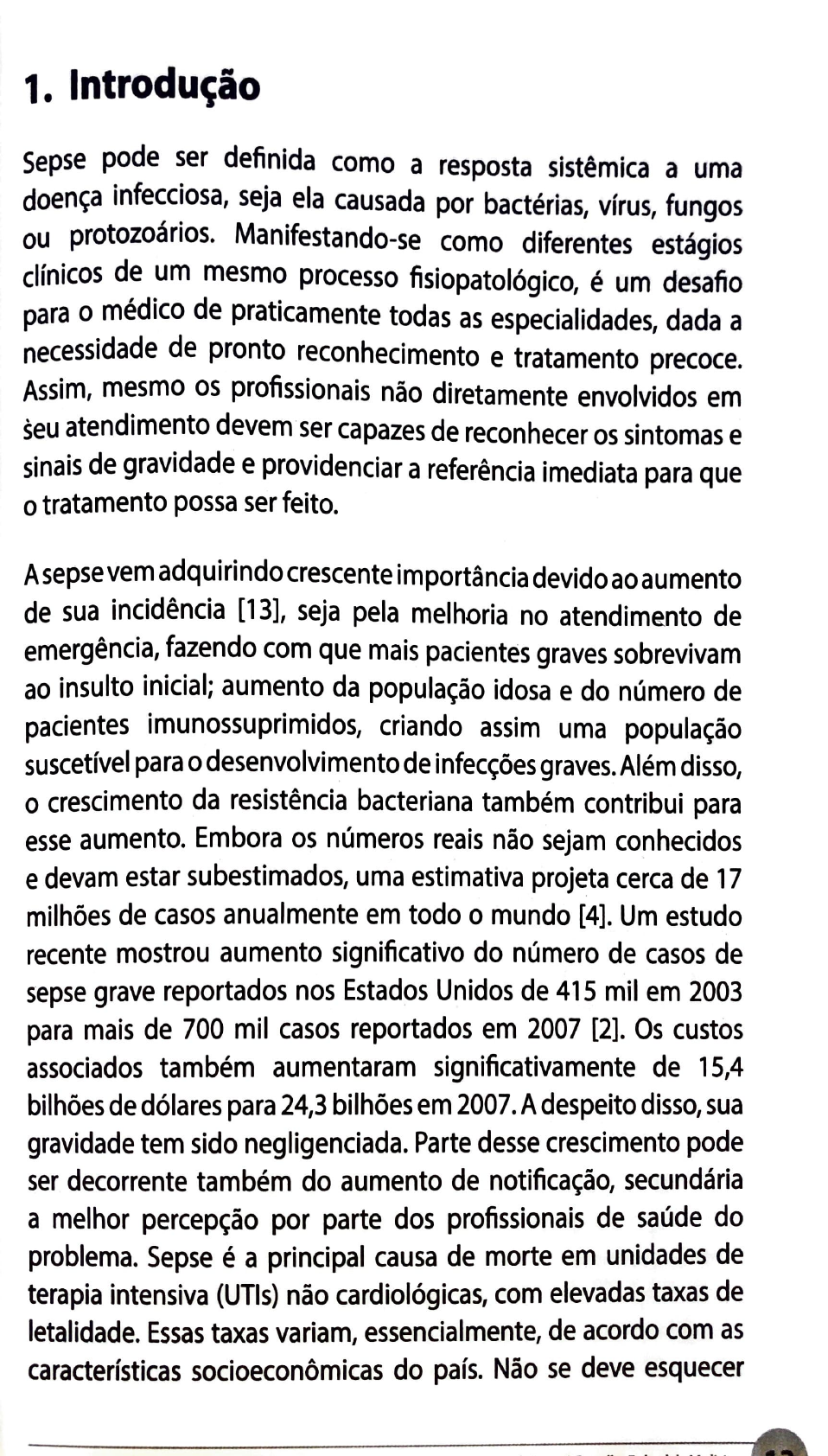 1. Introdução Sepse pode ser definida como a resposta sistémica a uma doença infecciosa, seja ela causada por bactérias, vírus, fungos ou protozoários. Manifestando-se como diferentes estágios clínicos de um mesmo processo fisiopatológico, é um desafio para o médico de praticamente todas as especialidades, dada a necessidade de pronto reconhecimento e tratamento precoce. Assim, mesmo os profissionais não diretamente envolvidos em seu atendimento devem ser capazes de reconhecer os sintomas e sinais de gravidade e providenciar a referência imediata para que o tratamento possa ser feito. A sepse vem adquirindo crescente importância devido ao aumento de sua incidência [13], seja pela melhoria no atendimento de emergência, fazendo com que mais pacientes graves sobrevivam ao insulto inicial; aumento da população idosa e do número de pacientes imunossuprimidos, criando assim uma população suscetível para o desenvolvimento de infecções graves. Além disso, o crescimento da resistência bacteriana também contribui para esse aumento. Embora os números reais não sejam conhecidos e devam estar subestimados, uma estimativa projeta cerca de 17 milhões de casos anualmente em todo o mundo [4]. Um estudo recente mostrou aumento significativo do número de casos de sepse grave reportados nos Estados Unidos de 415 mil em 2003 para mais de 700 mil casos reportados em 2007 [2]. Os custos associados também aumentaram significativamente de 15,4 bilhões de dólares para 24,3 bilhões em 2007. A despeito disso, sua gravidade tem sido negligenciada. Parte desse crescimento pode ser decorrente também do aumento de notificação, secundária a melhor percepção por parte dos profissionais de saúde do problema. Sepse é a principal causa de morte em unidades de terapia intensiva (UTls) não cardiológicas, com elevadas taxas de letalidade. Essas taxas variam, essencialmente, de acordo com as características socioeconômicas do país. Não se deve esquecer que estes dados podem estar subestimados, pois muitas causa da morte é atribuída à patologia de base e não propri:eies a à sepse. mente Os dados nacionais disponí~ei~ a~o~tam. para uma elev letalidade, mormente em hospItaIs pubhcos vinculados aos· ªda . , d '~~ Unico de Saúde [5]. Infelizmente, o numero e casos de se ·•,a Brasil não é conhecido. Um estudo de prevalência de urn Pse tio em cerca de 230 UTls brasileiras, aleatoriament~ seleciona~ó dia forma a representar de maneira adequada o conjunto de U~s de País, aponta que 30% dos leitos de UTI do Brasil estão ocu I do . h , . Pados por pacientes com sepse grave ou c oque septIco. Esse . . . estud conduzido pelo Instituto Lat1no-Amencan_o _d~ ~ep:e (ILAS) ain ° não foi publicado,. mas seus resultados inIcIaIs sao alarrn da com letalidade próxima dos 50%. Esses dois achados nos ;ntes, perceber o custo elevado da sepse em nosso país, tanto do :en, de vidas perdidas como do ponto de vista econômico. rito Isso, por si só, justifica o planejamento de ações voltadas à redu _ l .d d E d , . t , çao dessa morta I a e. stu os prevI_os em ou ros paIses e no Br . & • • 1 t • d - as11 mostram que a e,etIva Imp emen açao e protocolos assistenc· . . · . , _ IaIs gerenciados e capaz de melhorar a evoluçao desses pacientes [6. 9]. Assim, ~sse text~ tem como objetivo prover ao médico e ao demais profissionais de saúde informações que permitam O se: reconhecimento precoce, bem como as noções básicas para seu tratamento adequado dentro das primeiras horas do diagnóstico. 2. Conceitos Por anos, a pluralidade de definições para caracterizar o paciente com infecção grave constituiu importante limitação para o seu melhorconhecimento.Asnomenclaturasanteriormenteutilizadas, como septicemia, síndrome séptica ou infecção generalizada causavam inconvenientes tanto do ponto de vista ·assistencial como do ponto de vista de pesquisa. A não uniformidade do~ critérios de inclusão em estudos clínicos, por exemplo, dificultava a avaliação da eficácia de tratamentos e a comparação entre diferentes estudos. Havia, assim, a necessidade de definições padronizadas para a identificação do paciente. Um esforço foi feito em 1992 no sentido de padronizar essa nomenclatura. Essa reunião de consenso entre a Society Criticai Care Medicine (SCCM) e O American College of Chest Physicians (ACCP), publicada em 1992, gerou uma série de definições que, a despeito de algumas limitações, continuam sendo utilizadas até hoje. Essas definições estão colocadas no quadro 1 [1 O]. Quadro 1 - Definições de síndrome de resposta inflamatória sistêmica, sepse, sepse grave e choque séptico ~ Presença de pelo menos 2 dos seguintes itens: Síndrome da resposta inflamatória sistêmica (SRIS) a) temperatura central> 38,3° C ou< 36oC; b) frequência cardíaca > 90bpm; c) frequência respiratória > 20 rpm ou PaCO 2 < 32 mmHg ou necessidade de ventilação mecânica; d) leucócitos totais > 12.000/mm3 ou < 4.000/mm3 ou presença de > 10% de formas jovens. Sepse - SRIS secundária a processo infeccioso confirmado ou suspeito, sem necessidade da identificação do agente infeccioso. Sepse grave Presença dos critérios de sepse associada à disfunção orgânica ou sinais de hipoperfusão. Hipoperfusão e anormalidades da perfusão podem incluir, mas não estão limitadas a: hipotensão, hipoxemia, acidose láctica, oligúria e alteração aguda do estado mental. Choque séptico Estado de falência circulatória aguda caracterizada pela persistência de hipotensão arterial em paciente séptico, sendo hipotensão definida como pressão arterial ~istólica < 90 mmHg, redução de> 40 mmHg da linha de base, ou pressão arterial média < 60 mmHg, a desp~ito de adequada reposição volêmica, com necessidade de vasopressores, na ausência de outras causas de hipotensão. Essas definições, entretanto, loram alvo de críticas tanto por sua excessiva sensibilidade com