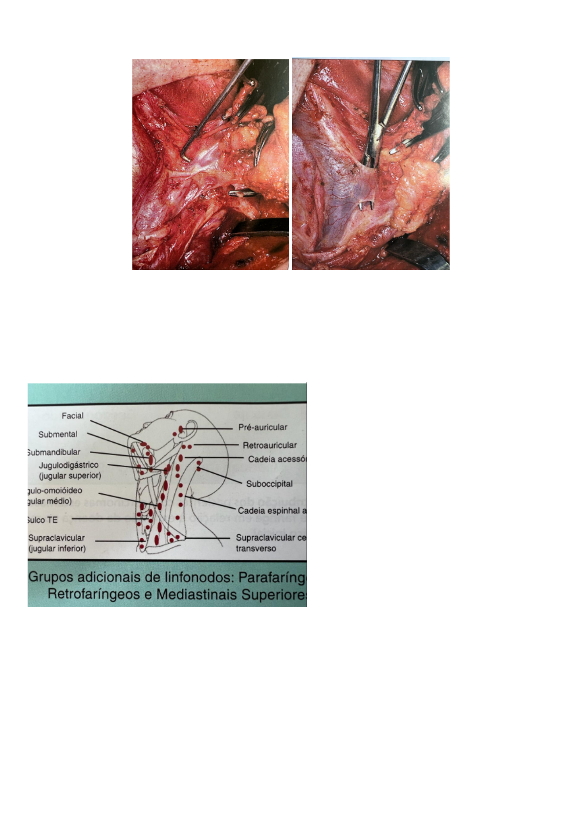 Esvaziamento cervical é a ressecção do tecido gorduroso e linfonodos acometidos ou não da região cervical, expondo totalmente os vasos da região cervical. História • 1906 Crile menos de 1% metástase a distância ressecção em bloco • 1951 Martin • 1950 Robben & ward preservação do nervo acessório • Brasil Barbosa preservação da veia jugular interna , nervo acessório dificilmente • Bocca 1980 esvaziamento funcional modificado envolvendo os mesmos níveis cervicais porém preservado MECM , NEA, VJI No Esvaziamento Cervical Radical, são retirados os linfonodos de 5 áreas laterais, juntamente com a sua gordura adjacente. Assim, todos os linfonodos laterais do pescoço são removidos. O esvaziamento cervical radical é um proce dimento cirúrgico que consiste na remoção em bloco dos grupos de linfonodos e vasos linfáti cos que compõem as principais vias de drena gem da cabeça e do pescoço . Além das estruturas linfáticas, são removidas também outras estruturas anatômicas, como o músculo esternocleidomastóideo, a veia jugular interna, o nervo espinhal acessório, o plexo cervical superficial e a glândula submandibular. Esvaziamento Cervical Radical - É o procedimento em que são removidos os cinco níveis de grupos de linfonodos do mesmo lado em relação ao tumor primário. São também re movidas as seguintes estruturas não linfáticas: nervo espinhal acessório, músculo esternocleidomastóideo e veia jugular interna. Esvaziamento Cervical Radical Modificado - É o procedimento em que são removidas as mesmas estruturas linfáticas retiradas no esvaziamento cervical radical. Os limites da área esvaziada também são os mesmos. - A diferença está na preservação de uma ou mais estruturas anatômicas não linfáticas, isto é, o nervo espi nhal acessório, o músculo esternocleidomastóideo e a veia jugular interna. - Portanto, as estruturas removidas deverão ser sempre citadas, por exem plo: esvaziamento cervical radical modificado com preservação do nervo espinhal acessório. A doença tem baixa recidiva em cima do nervo acessório e por isso caiu a técnica cirúrgica que retirava o nervo acessório. Classificação AHNS Esvaziamento profilático e/ ou terapêutico Profilático : esvaziamento seletivo ou parcial ( ausência de doença macroscópica linfonodal) Terapêutico : Esvaziamento total nos casos de doença ( fazer radical ou radical modificado ) Gravar os níveis de cada esvaziamento = PROVA • Esvaziamento cervical clássico ou radical( sem preservar estruturas tira o esterno cleido,jugular e espinal acessório ) • Esvaziamento cervical radical modificado ( preserva o esterno cleido / preserva uma das estruturas e comenta qual) • Esvaziamento cervical seletivos ou parciais : supra -omo -hióideo ( esvazia os segmentos 1,2,3- feito quando tem linfonodo negativo - doença oncológica com linfonodo negativo, linfonodo sem doença).Ja o esvaziamento cervical ampliado ele é linfonodo positivo. Apenas os parciais são linfonodos negativo • Lateral É o procedimento no qual são removidos os linfonodos dos terços superior, médio e inferior da veia jugular interna, isto é, níveis II, III e IV respectivamente. •Póstero lateral É o procedimento em que são removidos os linfonodos do terço superior, médio e inferior da veia jugular interna, ou seja, níveis II, III e IV respectivamente, e os do triângulo posterior do pescoço que acompanham o nervo espinhal acessório e a artéria cervical transversa, ou seja, nível V; são incluídos ainda os grupos de lin fonodos suboccipitais e retroauriculares. Este procedimento é mais frequentemente usado para tratar metástases provenientes de tumores cutâneos, principalmente melanomas, de localização retroauricular, do couro cabeludo ou da pele que recobre o triângulo posterior do pescoço. •Anterior É o procedimento em que são removidos os linfonodos pré-traqueais, paratraqueais que acom panham o nervo laríngeo inferior bilateralmente, pré-laríngeos e os paratireóideos que juntamente compõem o nível VI. NÍVEIS LINFONODAIS Linfonodos da parte lateral do pescoço • Nível I grupo submentoniano: entre os ventre anterior digástrico e osso hióide grupo submandibular: ventre anterior e posterior do digástrico, borda inferior do corpo da mandíbula. • Nível II : jugular superior base do crânio a bifurcação da artéria carótida (osso hióide ) ponto de referência clínica • Nível III:jugular médio bifurcação da carótida até músculo omo hióideo ou membrana cricotireóidea • Nível IV : jugular inferior borda inferior nível III ate clavícula • Nível V: parte inferior do nervo espinal acessório ao longo dos vasos cervicais transversos - Não se esvazia o nível 1 em doença linfonodal positiva ESTADIAMENTO DE DOENÇA NEOPLÁSICA CERVICAL - Tumor mais comum maligno da Cabeça e Pescoço : CEC - carcinoma espinocelular.