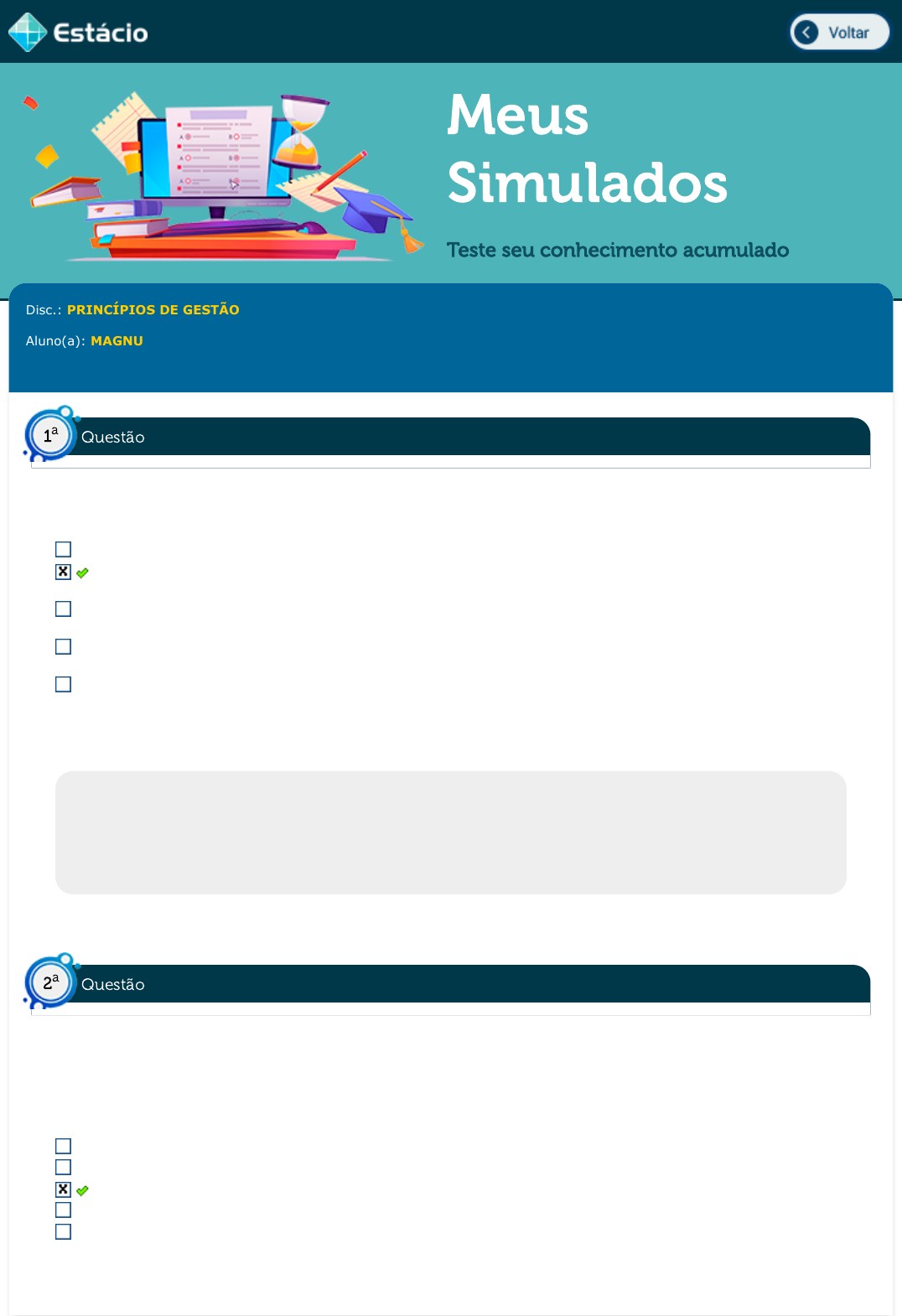 Meus Simulados Teste seu conhecimento acumulado Disc.: PRINCÍPIOS DE GESTÃO Aluno(a): MAGNUN ALMEIDA VIRGINIO 202301043107 Acertos: 10,0 de 10,0 09/03/2023 Acerto: 1,0 / 1,0 A expressão Marketing Mix (composto de marketing) descreve os principais elementos que interferem nas decisões de marketing: produto, preço, praça e promoção. Esses elementos, tradicionalmente, são reconhecidos como os 4 Ps do marketing e, sobre eles, é correto afirmar que: Os fornecedores são os únicos que se relacionam com os clientes. Antes de definir os preços, a organização deve considerar quais são os objetivos de marketing relativos a seu produto e/ou serviço. O preço tem ligação com os aspectos de conveniência, representados por canais de venda, locais estratégicos, estoque e transporte dos produtos. Os profissionais de marketing estão mais interessados em conquistar novos clientes do que fortalecer o relacionamento com os clientes já existentes. Todas as alternativas estão incorretas. Respondido em 09/03/2023 12:43:23 Explicação: De fato, o preço deve levar em conta a relação de custos e envolve preço do produto ou serviço, desconto, bonificações, prazo de pagamento e condições de financiamento. Antes de definir os preços, a organização deve considerar quais são os objetivos de marketing relativos a seu produto ou serviço. As outras alternativas estão incorretas. Acerto: 1,0 / 1,0 ¿Na Southwest Airlines o departamento de recursos humanos é um dos mais importantes da companhia - com 125 membros. O departamento de recursos humanos controla todas as contratações da empresa, tendo estado muito ocupado ultimamente. Em dez anos, o quadro de pessoal da Southwest aumentou 97%. A administração da companhia adota uma abordagem informal para entrevistar candidatos." (Zellner, Business Welk,1995, p.69). Neste caso, o procedimento utilizado pela companhia ocorre no processo de: Promoção Análise de currículo Seleção Avaliação do desempenho Recrutamento Respondido em 09/03/2023 12:44:16 Questão1 a Questão2 a https://simulado.estacio.br/alunos/inicio.asp javascript:voltar(); Explicação: A questão trata de ¿entrevista de pessoas¿ para contratação. Esta atividade é realizada no processo de seleção, quando são avaliadas as qualificações e as competências dos recrutados e sua adequação aos cargos disponíveis para preenchimento. Acerto: 1,0 / 1,0 Com o passar do tempo, diversos modelos de gestão sofrem mudanças. Por isso, os profissionais precisam se atualizar constantemente "No limiar do século XXI, alterações em todos os tipos de ambientes levaram ao surgimento de novos conceitos e técnicas para administrar as organizações. Essas inovações na teoria e na prática são chamadas de novos paradigmas da administração" (MAXIMIANO, 2009). Sendo assim, aponte a alternativa que NÃO apresenta um dos principais paradigmas para o terceiro milênio: Terceirização. Estruturas organizacionais enxutas. Ênfase na eficiência. Empreendedorismo. Ética e responsabilidade social. Respondido em 09/03/2023 12:45:00 Explicação: A resposta aborda paradigmas do terceiro milênio, nas quais a gestão das empresas possui características mais flexíveis, como estruturas enxutas, Terceirização, empreendedorismo, e um forte grau de responsabilidade social. Em contrapartida, empresas com gestão mais tradicional englobam características mais mecanicistas, como estruturas organizacionais amplas, ênfase na eficiência e especialização; e paradigmas Sendo assim, a alternativa que não representa um dos paradigmas do terceiro milênio, por ser um paradigma tradicional é a Ênfase na eficiência. Acerto: 1,0 / 1,0 As certificações podem ser tanto individuais quanto organizacionais. Certificações são cursos oferecidos por uma instituição renomada. um processo de seleção interno. procedimentos burocráticos para conseguir vantagens organizacionais. selos externos de qualidade emitidos por autoridades independentes. processo de avaliação integrativa. Respondido em 09/03/2023 12:45:36 Explicação: As certificações podem ser consideradas atestados formais ou selos externos de qualidade emitidos por autoridades independentes, após uma avaliação de evidências. Acerto: 1,0 / 1,0 Custo de oportunidade é um termo muito empregado na economia. Ao dizermos que um empresário deve estar atento ao custo de oportunidade de seu negócio, é correto afirmar que ele deve: Avaliar se as receitas obtidas cobrem as despesas decorrentes do negócio da empresa. Questão3 a Questão4 a Questão5 a Avaliar se existem alternativas mais rentáveis para investir seu capital. Analisar aquilo que o agente econômico deve ter como recompensa para abrir mão de algum consumo. Contar com sistemas que calcule os custos contábeis da produção de bens e serviços de sua empresa, com a finalidade de apuração dos lucros. Medir a rentabilidade que se ganha em uma aplicação alternativa inesperada. Respondido em 09/03/2023 12:48:48 Explicação: O conceito econômico considera o melhor ganho possível no emprego dos fatores. Ou seja, leva em consideração o custo de oportunidade. Nesse sentido, avaliar alternativas é um conceito correto para o custo de oportunidade. Vale a pena ressaltar que Custo de oportunidade não está atrelado à recompensa, mas sim à perda por tomar uma determinada decisão e não outra. Acerto: 1,0 / 1,0 A correta diferenciação entre os custos, despesas e investimentos de uma empresa se faz extremamente necessária para o bom andamento de um negócio. Inicialmente, para uma pessoa com pouco conhecimento no assunto, esses três itens podem parecer a mesma coisa, porém não é essa a verdade. Cada um desses itens representa uma modalidade diferente nos balanços de uma empresa, com as próprias normas contábeis, sendo classificados de maneiras distintas. Desta forma, marque a opção correta a respeito de custo, despesa ou investimento. Custo está 
