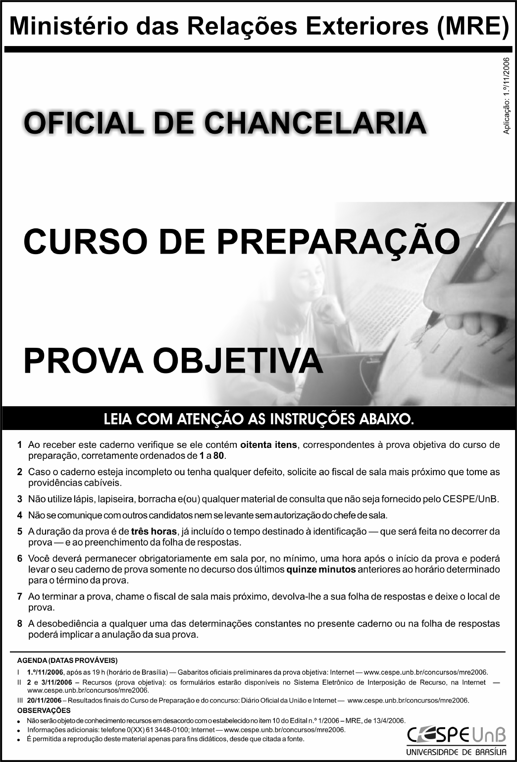 UnB/CESPE – MRE Curso de Preparação – Oficial de Chancelaria – 1 – De acordo com o comando a que cada um dos itens de 1 a 80 se refira, marque, na folha de respostas, para cada item: o campo designado com o código C, caso julgue o item CERTO; ou o campo designado com o código E, caso julgue o item ERRADO. Para as devidas marcações, use a folha de respostas, único documento válido para a correção da sua prova. PROVA OBJETIVA Consciente de que, em um contexto organizacional, a redação deve apresentar correção, clareza, objetividade, coerência, adequação e concisão, considere que o seguinte trecho faça parte de um texto a ser revisto: “Em resposta a seu estimado pedido de 10 de novembro, que lemos com atenção, pedimos-lhe a fineza de dizer a quantidade exata de cada item solicitado.” A respeito dos padrões de qualidade do texto, julgue os itens a seguir. � Nesse trecho, a mensagem pode ser compreendida, mas a linguagem não é objetiva. � O fragmento “Em resposta a seu estimado pedido” estaria mais adequado à comunicação oficial caso fosse reescrito da seguinte forma: Em resposta a sua prezada solicitação. � Retirar a oração “que lemos com atenção” juntamente com a vírgula que a sucede torna o texto mais conciso. � Há erro no emprego da forma verbal em “pedimos-lhe”. O correto seria pedimo-lhes. � No que se refere ao emprego de “dizer”, é correto afirmar que esse verbo, no contexto em que aparece, apresenta o problema de ser genérico. Em seu lugar seria mais adequado o verbo especificar. Um dos mecanismos de concisão textual consiste em eliminar ou em substituir por construções mais curtas vocábulos, expressões e até orações. Com base nessa prática, julgue a adequação e a correção gramatical das reescrituras propostas, na 2.ª parte de cada item, para os trechos apresentados a seguir. � Espero que me respondas, a fim de que seja feito o esclarecimento das dúvidas. — Espero sua resposta, para que sejam esclarecidas as dúvidas. � Será apresentado oportunamente o que programamos. — Será apresentado oportunamente os programas. � Pediu a ele a devolução do documento que fora enviado por ocasião do término da auditoria. — Pediu-lhe a devolução, ao término da auditoria, do documento enviado. Não há qualquer coisa que possibilite a nós proceder ao pagamento que nos foi solicitado. — Não há possibilidade de nosso procedimento do pagamento solicitado. � Na ocasião em que o expediente tiver início, é devido que os memorandos sejam preparados logo em seguida. — No momento que o expediente for iniciado, é devido que os memorandos se preparem logo em seguida. �� Nada mais havendo a tratar, subscrevemo-nos. — Atenciosamente, As palavras de ligação são cruciais como elementos de coesão textual. Por explicitar as relações entre as idéias, tornam o texto mais claro e fácil de ser entendido. Em cada um dos itens a seguir, são apresentadas duas frases, intercaladas por uma proposta de ligação (entre parênteses). Sem se preocupar com outras mudanças a não ser a ligação entre as frases, estando elas em um único período e mantendo-se a ordem em que se encontram, julgue apenas se o elemento de coesão proposto é adequado. �� Chovia torrencialmente. (contudo) O trabalho não pôde ser concluído. �� O funcionário foi despedido. (e) Abandonou o trabalho sem concluí-lo. �� A secretária não se intimidou. (apesar de) O chefe era muito severo. �� O projeto é muito oneroso. (pois) O departamento não pode aceitá-lo. �� Aquela é uma indústria rica. (por isso) A população do bairro local é pobre. Considere que as frases a seguir, que contêm numerais, estejam em textos genéricos, isto é, não estejam ligadas às áreas de matemática ou de cálculo. Com base nesse ponto de vista, julgue os itens abaixo quanto ao emprego dos numerais. �� Os participantes discutiram vinte projetos de lei e apenas nove deles foram aprovados. �� Das 31 propostas, vinte ficaram para a reunião seguinte. � Ao redigir a nota, observe o art. 3.º da Lei Complementar n. 95, de 1998 (LC 95/98). � Naquela região, cerca de 1,2 milhões de pessoas vivem da economia informal. Julgue os itens que se seguem, tendo em vista o uso tecnicamente recomendado para a grafia de números, datas e horas. �� Foram levadas em consideração pesquisas feitas nos anos de 1.991, 1.996 e 2.001. �� O endereço oficial fica na Avenida das Nações, 1.020, ap. 304. �� Já foram gastos 3.450 milhões de reais nessa obra. �� O contrato expira em 1.º de dezembro de 2007. �� Essa fase do projeto vai de 10/8/06 a 9/8/07. �� O intervalo será de 10h15 a 10h30. �� O ponteiro parou às 13 h 20 min. 10 s. UnB/CESPE – MRE Curso de Preparação – Oficial de Chancelaria – 2 – Julgue os seguintes itens, que tratam do uso das siglas em contexto organizacional. �� Na primeira vez em que a sigla é mencionada no texto, o nome correspondente deve aparecer sempre antes, por extenso, seguido da sigla, que deve estar antecedida de traço, como em: Universidade de Brasília – UnB. � As siglas formadas com até três letras devem ser escritas empregando-se maiúsculas, como em GDF, U.N.E., ONU. � Se, em um texto, for escrito “BRB — Banco de Brasília”, a forma como a sigla foi empregada deve ser considerada correta. �� Siglas com quatro letras ou mais têm emprego livre: podem ser escritas com todas as letras maiúsculas ou apenas com a inicial maiúscula, como em Detran e INSS. No que se refere às questões técnicas para uniformidade do texto, julgue os itens subseqüentes. �� A parte final do documento, que o encerra e por vezes contém o endereço do destinatário, denomina-se epígrafe. �� Para sintetizar o conteúdo do documento, o redator redige uma ementa, cuja estrutura é diferenciada em razão da natureza do documento. �� A 