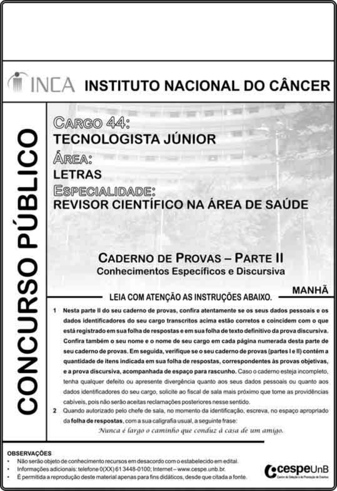 UnB/CESPE – INCA Cargo 44: Tecnologista Júnior – Área: Letras – Especialidade: Revisor Científico na Área de Saúde – 1 – CONHECIMENTOS ESPECÍFICOS Podemos dizer, numa primeira aproximação, que1 textos são resultados da atividade verbal de indivíduos socialmente atuantes, na qual estes coordenam suas ações no intuito de alcançar um fim social, de conformidade com as4 condições sob as quais a atividade verbal se realiza. Poder-se-ia, assim, conceituar o texto como uma manifestação verbal constituída de elementos linguísticos7 selecionados e ordenados pelos co-enunciadores, durante a atividade verbal, de modo a permitir-lhes, na interação, não apenas a depreensão de conteúdos semânticos, em decorrência10 da ativação de processos e estratégias de ordem cognitiva, como também a interação (ou atuação) de acordo com práticas socioculturais.13 É esta também a posição de Schimidt, para quem o texto é “qualquer expressão de um conjunto linguístico numa atividade de comunicação — no âmbito de um ‘jogo de atuação16 comunicativa’ — tematicamente orientado e preenchendo uma função comunicativa reconhecível, ou seja, realizando um potencial ilocucionário reconhecível”.19 Em Marcuschi, encontramos a seguinte ‘definição provisória’ de Linguística Textual e de seu objeto, que também parece ajustar-se bem a essa linha de pensamento: “Proponho22 que se veja a Linguística do Texto, mesmo que provisória e genericamente, como o estudo das operações linguísticas e cognitivas reguladoras e controladoras da produção,25 construção, funcionamento e recepção de textos escritos ou orais. [...] Por um lado deve preservar a organização linear que é o trabalho estritamente linguístico abordado no aspecto da28 coesão e, por outro, deve considerar a organização reticulada ou tentacular, não linear, portanto, dos níveis de sentido e intenções que realizam a coerência no aspecto semântico e31 funções pragmáticas”. Ingedore Villaça Koch. O texto e a construção dos sentidos. São Paulo: Contexto, 2008. p. 26-27. Tendo em vista o conteúdo expresso pelo texto e a forma segundo a qual ele se organiza, julgue os itens de 41 a 51, considerando aspectos da linguística textual. 41 De acordo com a autora, o conceito de texto é atravessado por constantes que podem ser reconhecidas como translinguísticas, envolvendo, por exemplo, a atuação social e os objetivos pragmáticos dos envolvidos no processo textual. 42 Como exemplos dos “elementos linguísticos selecionados e ordenados pelos co-enunciadores” (R.7-8) e que favorecem a coesão textual podem ser citados as conjunções e os advérbios. 43 O termo assim, em “Poder-se-ia, assim, conceituar o texto” (R.6) exerce a função de retomar coesivamente uma ideia anterior, exprimindo, relativamente a ela, um caráter de conclusão ou consequência. 44 A conceituação de texto exposta pela autora tem como característica básica o caráter central da individualidade do autor na concepção e na elaboração do texto, desconsiderando elementos exógenos. 45 Um dos fatores que garante a coerência textual, a meta-regra da repetição, é rigorosamente presente nos parágrafos do texto, os quais tratam, de modo reiterativo, das características da textualidade e do conceito de texto. 46 Infere-se, a partir do conceito de texto exposto pela autora, que a compreensão do texto é uma atividade que considera, sobretudo, a decodificação dos aspectos semânticos dos elementos linguísticos que o compõem. 47 Se considerada a tipologia textual classicamente admitida pela linguística textual, o texto de Ingedore Koch pode ser classificado como predominantemente descritivo, uma vez que pode se verificar a ampla presença da análise crítica, revelando uma fundamental tendência à defesa de um ponto de vista. 48 No trecho “encontramos a seguinte ‘definição provisória’ de Linguística Textual e de seu objeto” (R.20-21), a expressão a seguinte pode ser considerado um termo anafórico, pois apresenta, antecipadamente, o conteúdo que será semanticamente expandido na sequência da frase. 49 Percebe-se no texto o respeito à meta-regra da não- contradição, uma vez que o núcleo temático de cada um dos parágrafos mantém com os demais grande semelhança. 50 A progressão textual desse texto é garantida pela presença de novos elementos informativos a cada parágrafo, os quais agregam dados a antigos elementos informativos. 51 Todas as concepções de texto apresentadas por Ingedore Koch, de alguma maneira, aludem à divisão feita por Marcuschi entre organização linear e organização tentacular, dicotomia que é organizada no texto pelos articuladores “Por um lado” (R.27) e “por outro” (R.29). UnB/CESPE – INCA Cargo 44: Tecnologista Júnior – Área: Letras – Especialidade: Revisor Científico na Área de Saúde – 2 – O nascimento da crônica Há um meio certo de começar a crônica por uma1 trivialidade. É dizer: Que calor! Que desenfreado calor! Diz-se isto, agitando as pontas do lenço, bufando como um touro, ou simplesmente sacudindo a sobrecasaca. Resvala-se do calor aos4 fenômenos atmosféricos, fazem-se algumas conjeturas acerca do sol e da lua, outras sobre a febre amarela, manda-se um suspiro a Petrópolis, e La glace est rompue; está começada a7 crônica. [...] Não posso dizer positivamente em que ano nasceu a10 crônica; mas há toda a probabilidade de crer que foi coetânea das primeiras duas vizinhas. Essas vizinhas, entre o jantar e a merenda, sentaram-se à porta, para debicar os sucessos do dia.13 Provavelmente começaram a lastimar-se do calor. Uma dizia que não pudera comer ao jantar, outra que tinha a camisa mais ensopada que as ervas que comera. Passar das ervas às16 plantações do morador fronteiro, e logo às tropelias amatórias do dito morador, e ao resto, era a coisa mais fácil, natural e possível do