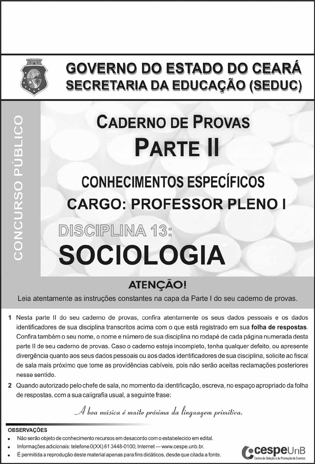 UnB/CESPE – SEDUC/CE Disciplina 13: Sociologia – 1 – CONHECIMENTOS ESPECÍFICOS QUESTÃO 21 Segundo Carlos Benedito Martins, A Sociologia, por meio de seus métodos de investigação científica, procura compreender e explicar as estruturas da sociedade, criando conceitos e teorias a fim de manter ou alterar as relações de poder nela existentes. O século XVIII pode ser considerado um período de grande importância para a história do pensamento ocidental e para o início da Sociologia. A sociedade vivia uma era de mudanças de impacto em sua conjuntura política, econômica e cultural, que trazia novas situações e também novos problemas. Consequentemente, esse contexto dinâmico e confuso contribuiu para eclodirem duas grandes revoluções — a Revolução Industrial, na Inglaterra e a Revolução Francesa. Com relação ao contexto histórico do surgimento da Sociologia, assinale a opção correta. A Pode-se considerar a Revolução Industrial como um acontecimento que agilizou o processo de formação da Sociologia, devido à sua influência política e ideológica. Essa revolução originou as ideias, o vocabulário do nacionalismo e os temas da política liberal para as partes do mundo constituídas no conflito das novas forças ascendentes versus a monarquia absolutista. B A Revolução Industrial não se restringiu à introdução da máquina a vapor e ao aperfeiçoamento dos modos de produção. Ela também representou o triunfo da indústria, comandada por empresários capitalistas, que aos poucos concentraram a propriedade das máquinas, das ferramentas e das terras, transformando populações inteiras em trabalhadores despossuídos. C As mudanças provocadas pela revolução científica e tecnológica, denominada Revolução Inglesa, marcaram profundamente a organização social, alterando-a por completo, criando novas formas de organização e causando modificações culturais duradouras. D Uma das consequências dos avanços tecnológicos resultantes da Revolução Francesa foi o seu efeito catastrófico para a classe trabalhadora, que gerou sentimentos de revolta traduzidos na forma de destruição de máquinas, sabotagens, explosão de oficinas, roubos e outros crimes. QUESTÃO 22 A Sociologia, como uma área do conhecimento científico, constituiu-se mediante o debate constante entre os pensadores e as principais teorias explicativas da sociedade, exigindo aprofundamento, experimentação, desenvolvimento metodológico e comprovação. Assinale a opção correta acerca das ideias que concorreram para a formação da Sociologia. A Uma das tradições sociológicas, que se comprometeu com a defesa da ordem instalada pelo capitalismo, encontrou no pensamento iluminista uma rica fonte de inspiração para formular seus principais conceitos explicativos da realidade. Seus adeptos, chamados de profetas do passado, construíram suas obras contra a herança dos filósofos conservadores. B O objetivo dos conservadores, ao estudar as instituições de sua época, era o de demonstrar que elas eram irracionais, injustas e atentavam contra a natureza dos indivíduos, impedindo a liberdade do homem. Em suas análises, essas instituições constituíam um obstáculo à liberdade do indivíduo e à sua plena realização e deveriam ser eliminadas. C Karl Marx, assim como Émile Durkheim e Max Weber, preocupado em fundar a Sociologia como disciplina específica de forma sistemática, ocupou-se em estabelecer o seu objeto de estudo, assim como indicar o seu método de investigação. D A primeira corrente teórica que buscou sistematizar o pensamento sociológico foi o positivismo, mediante a definição precisa de seu objeto e o estabelecimento de conceitos e de uma metodologia de investigação. Seu primeiro representante e principal sistematizador foi Augusto Comte. QUESTÃO 23 A relação entre indivíduo e sociedade pode ser analisada e explicada a partir de conceitos considerados básicos na sociologia. Assinale a opção correta acerca desse assunto. A Papel social é o processo pelo qual as crianças, ou outros novos membros da sociedade, aprendem o modo de vida de sua sociedade. O papel social é o principal canal para a transmissão da cultura através do tempo e das gerações. B O controle social refere-se aos meios usados por uma sociedade para enquadrar seus membros recalcitrantes. Nenhuma sociedade pode existir sem um controle social. Os métodos de controle variam de acordo com a finalidade e o caráter do grupo em questão. C A expressão estratificação social, que alude à divisão da sociedade em camadas ou estratos, refere-se ao fato de que toda sociedade é composta de níveis inter-relacionados em termos de ascendência e subordinação. No entanto, seus ocupantes têm acesso igual a oportunidades sociais e recompensas. D Socialização é um conjunto de direitos, obrigações e expectativas culturalmente definidos. São expectativas socialmente definidas que a pessoa segue em determinada posição social. UnB/CESPE – SEDUC/CE Disciplina 13: Sociologia – 2 – QUESTÃO 24 No que diz respeito à teoria sociológica elaborada por Max Weber, assinale a opção correta. A Para Weber não são as ideias e os valores que os seres humanos guardam as principais fontes de mudança social. Na sua perspectiva, a mudança social é estimulada principalmente por influência econômica. Nesse sentido, os conflitos de classes proporcionam a motivação para o desenvolvimento histórico. B Para Weber o conceito de poder é, do ponto de vista sociológico, amorfo, pois significa a probabilidade de impor a própria vontade dentro de uma relação social, mesmo contra a resistência e qualquer que seja o fundamento dessa probabilidade. No entanto, a probabilidade de encontrar obediência a certo mandato dentro de um grupo torna os conceitos de dominação e de autoridade de interesse para a Sociologia, já que possibilita a explicação da regularidade do conteúdo da