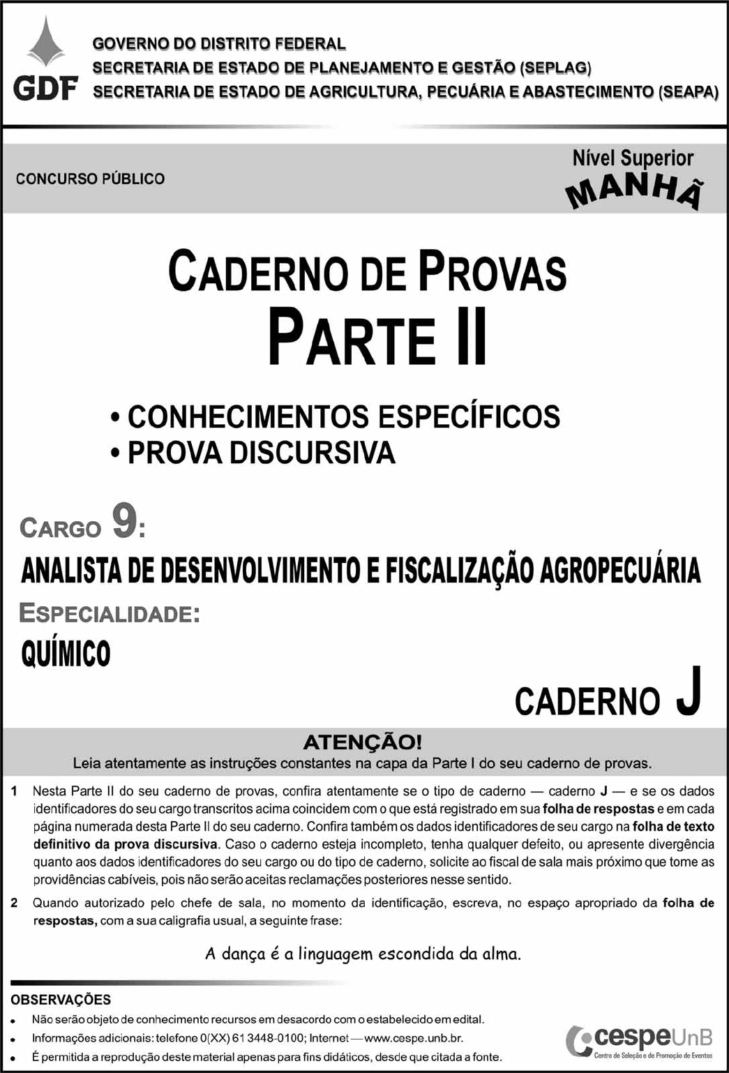UnB/CESPE – SEPLAG/SEAPA/DF Caderno J Cargo 9: Analista de Desenvolvimento e Fiscalização Agropecuária – Especialidade: Químico – 1 – CONHECIMENTOS ESPECÍFICOS O teor de cálcio em uma amostra foi determinado por análise gravimétrica, adicionando-se um excesso de ácido oxálico (H2C2O4) e uma quantidade de uréia [CO(NH2)2] a 200 mL da solução problema. A seguir, a solução foi levada à ebulição, o que causou a decomposição da uréia, segundo a equação CO(NH2)2 + H2O ÷ 2NH3 + CO2. O pH básico atingido proporcionou a precipitação do oxalato de cálcio, que foi filtrado, calcinado e pesado, resultando em 0,140 g de CaO. Considerando as massas molares do Ca, do C, do O e do H como iguais a 40, 12, 16 e 1 g/mol, respectivamente, e de acordo com o procedimento em apreço, bem como os dados fornecidos, julgue os itens a seguir. 61 No procedimento descrito foi utilizado o método da precipitação homogênea, que favorece o crescimento de cristais mais facilmente filtráveis e puros. 62 A calcinação é realizada com o intuito de garantir que haja uma composição bem definida para o precipitado e que este seja isento de água. 63 A pesagem do material calcinado deve ser realizada com o material ainda quente, para evitar a adsorção de água. 64 A concentração de Ca2+ na solução problema é maior que 0,400 g/L. O teor de enxofre em uma amostra de querosene foi determinado por um método que apresenta um desvio padrão (F) já conhecido de 0,0010%. Foram realizadas quatro medidas, sendo encontrados os valores: 0,114; 0,112; 0,120; 0,118. A tabela a seguir apresenta os níveis de confiança para diferentes valores de , em uma distribuição normal de σ μ−x erros, sendo : a média da população. nível de confiança (%) σ μ−x nível de confiança (%) σ μ−x 50 0,67 95 1,96 68 1,00 96 2,00 80 1,29 99 2,58 90 1,64 99,9 3,29 Com base nessas informações e considerando a inexistência de erros determinados, julgue os itens que se seguem. 65 O desvio padrão é uma indicação da exatidão de um conjunto de medidas. 66 A probabilidade de que o valor verdadeiro da concentração de enxofre na amostra esteja no intervalo 0,116 ± 0,001 é de 96%. Considere que 20,0 mL de uma solução de FeSO4 a 0,100 mol/L tenha sido titulada, a 25 ºC, com uma solução contendo íons Ce+4 na concentração 0,100 mol/L. Para isso, mediu-se o potencial da célula eletroquímica em que o cátodo é um eletrodo de platina mergulhado na mistura reacional, e o ânodo, um eletrodo de referência de calomelano, com potencial E (cal). A reação de oxirredução que se passa no cátodo é: Ce+4 + Fe2+ ÷ Ce3+ + Fe3+. Com base nessas informações e considerando que todas as soluções envolvidas apresentam comportamentos ideais, julgue os próximos itens. 67 Após a adição de 10,0 mL da solução de Ce4+, o potencial E da célula eletroquímica é dado pela expressão , sendo o)()/( 230 calEFeFeEE −= ++ )/( 230 ++ FeFeE potencial padrão para a reação Fe3+ + e! ÷ Fe2+. 68 Após o ponto de equivalência, o potencial da célula permanecerá constante. Um volume Va de uma solução aquosa de ácido acético foi titulado com uma solução aquosa de NaOH com concentração mb, em mol/L. No ponto final da titulação, um volume Vb da base havia sido adicionado. Considerando os fundamentos dos métodos de análise titulométrica e a situação descrita, julgue os itens subsequentes. 69 Em qualquer titulação, o ponto final corresponde exatamente ao ponto de equivalência. 70 O emprego, como titulante, de uma solução aquosa de NH3, em lugar da solução de NaOH, possibilitaria uma identificação mais precisa do ponto de equivalência. RASCUNHO UnB/CESPE – SEPLAG/SEAPA/DF Caderno J Cargo 9: Analista de Desenvolvimento e Fiscalização Agropecuária – Especialidade: Químico – 2 – A espectrometria de massa é uma ferramenta de análise de grande utilidade, tanto na identificação de elementos quanto de compostos orgânicos. A figura abaixo apresenta dois espectros de massa obtidos para a molécula de 1-decanol, sendo que um dos espectros foi obtido utilizando-se a técnica da ionização por impacto de elétrons, e o outro, utilizando-se a ionização química (os espectros não são apresentados, necessariamente, nessa ordem). espectro A espectro B a b u n d â n c ia r e la ti v a Skoog et al. Princípios de análise instrumental. (Trad.) Caracelli et al), 5.ª ed, 2002, p. 448. Com base na técnica em questão, nos espectros e nas informações acima, julgue os seguintes itens. 71 O raio de curvatura do movimento de um íon no analisador de um espectrômetro com setor magnético (r) está relacionado ao potencial elétrico de aceleração do íon (V), à intensidade do campo magnético do analisador ($), à massa do íon (m) e à diferença entre o número de prótons e elétrons no íon (z) por meio da expressão .⎟ ⎠ ⎞ ⎜ ⎝ ⎛ = z mV r . .2 β 72 Na figura apresentada, o espectro A corresponde à ionização por impacto de elétrons e o espectro B, à ionização química. 73 Na identificação de elementos em solução, o uso da espectroscopia de massa com plasma indutivamente acoplado fornece, usualmente, espectros mais complexos e difíceis de interpretar do que os espectros óticos correspondentes, principalmente em análises envolvendo elementos de maior número atômico. 4 8 12 16 1 2 3 4 6 7 8 9 10 11 12 13 14 15 16 23 22 21 20 19 18 175 20 24 28 32 36 40 44 48 52 tempo (min) 0 P. S. Bonato. Cromatografia gasosa. In: Fundamentos de cromatografia. C. H. Collins et al. Campinas: Ed. Unicamp, 2006, p. 265. A figura acima apresenta o cromatograma de uma mistura de pesticidas clorados. Para a análise cromatográfica em questão, o tempo morto (tempo que uma espécie não retida demora para eluir) é de 2 min, e os picos 9 e 16 correspondem aos compostos aldrina e endrina, respectivamente. Esses compostos pertencem à classe dos chamados poluentes org