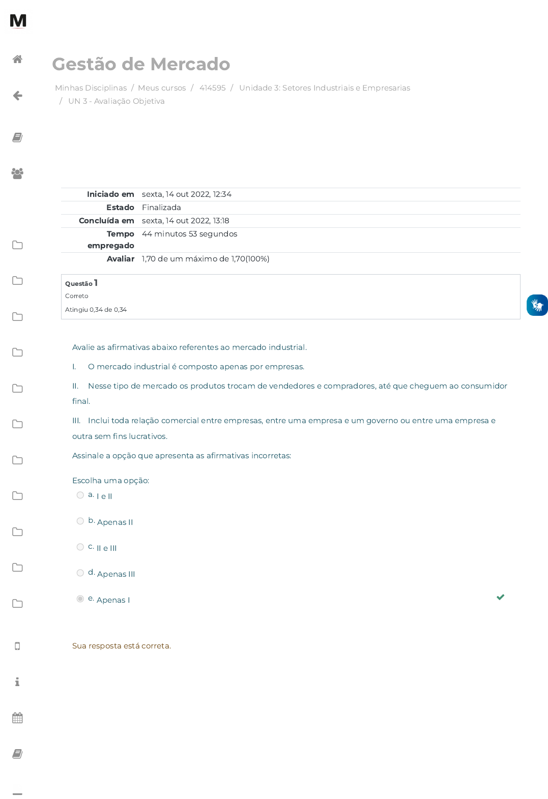 Minhas Disciplinas / Meus cursos / 414595 / Unidade 3: Setores Industriais e Empresarias / UN 3 - Avaliação Objetiva Gestão de Mercado Iniciado em sexta, 14 out 2022, 12:34 Estado Finalizada Concluída em sexta, 14 out 2022, 13:18 Tempo empregado 44 minutos 53 segundos Avaliar 1,70 de um máximo de 1,70(100%) Questão 1 Correto Atingiu 0,34 de 0,34 Avalie as a�rmativas abaixo referentes ao mercado industrial. I. O mercado industrial é composto apenas por empresas. II. Nesse tipo de mercado os produtos trocam de vendedores e compradores, até que cheguem ao consumidor �nal. III. Inclui toda relação comercial entre empresas, entre uma empresa e um governo ou entre uma empresa e outra sem �ns lucrativos. Assinale a opção que apresenta as a�rmativas incorretas: Escolha uma opção: a. I e II b. Apenas II c. II e III d. Apenas III e. Apenas I Sua resposta está correta. https://avap.multivix.edu.br/my/ https://avap.multivix.edu.br/course/view.php?id=18999 https://avap.multivix.edu.br/course/view.php?id=18999§ion=4 https://avap.multivix.edu.br/mod/quiz/view.php?id=1264787 https://avap.multivix.edu.br/my/ https://avap.multivix.edu.br/course/view.php?id=18999 https://avap.multivix.edu.br/user/index.php?id=18999 https://avap.multivix.edu.br/course/view.php?id=18999§ion=1 https://avap.multivix.edu.br/course/view.php?id=18999§ion=2 https://avap.multivix.edu.br/course/view.php?id=18999§ion=3 https://avap.multivix.edu.br/course/view.php?id=18999§ion=4 https://avap.multivix.edu.br/course/view.php?id=18999§ion=5 https://avap.multivix.edu.br/course/view.php?id=18999§ion=6 https://avap.multivix.edu.br/course/view.php?id=18999§ion=7 https://avap.multivix.edu.br/course/view.php?id=18999§ion=8 https://avap.multivix.edu.br/course/view.php?id=18999§ion=9 https://avap.multivix.edu.br/course/view.php?id=18999§ion=10 https://avap.multivix.edu.br/course/view.php?id=18999§ion=11 https://avap.multivix.edu.br/hooks/portal/ https://avap.multivix.edu.br/mod/page/view.php?id=1252%2F%22%20target%3D%22_blank https://avap.multivix.edu.br/calendar/view.php/ https://avap.multivix.edu.br/local/staticpage/view.php?page=biblioteca https://portalweb.multivix.edu.br/gabaritos/login.aspx https://avap.multivix.edu.br/ Questão 2 Correto Atingiu 0,34 de 0,34 Em relação ao mercado empresarial, avalie as a�rmações a seguir e a relação proposta entre elas: I) Uma das principais in�uências no comportamento de compra no mercado empresarial é a in�uência ambiental, porque II) O ambiente de�ne a estrutura organizacional, os objetivos e políticas da empresa. A respeito dessas asserções, assinale a opção correta. Escolha uma opção: a. Ambas as asserções são proposições falsas. b. As duas asserções são proposições verdadeiras e a segunda é uma justi�cativa correta da primeira. c. A primeira asserção é uma proposição falsa e a segunda é verdadeira. d. A primeira asserção é uma proposição verdadeira, e a segunda é falsa. e. As duas asserções são proposições verdadeiras, mas a segunda não é uma justi�cativa correta da primeira. Sua resposta está correta. https://avap.multivix.edu.br/my/ https://avap.multivix.edu.br/course/view.php?id=18999 https://avap.multivix.edu.br/user/index.php?id=18999 https://avap.multivix.edu.br/course/view.php?id=18999§ion=1 https://avap.multivix.edu.br/course/view.php?id=18999§ion=2 https://avap.multivix.edu.br/course/view.php?id=18999§ion=3 https://avap.multivix.edu.br/course/view.php?id=18999§ion=4 https://avap.multivix.edu.br/course/view.php?id=18999§ion=5 https://avap.multivix.edu.br/course/view.php?id=18999§ion=6 https://avap.multivix.edu.br/course/view.php?id=18999§ion=7 https://avap.multivix.edu.br/course/view.php?id=18999§ion=8 https://avap.multivix.edu.br/course/view.php?id=18999§ion=9 https://avap.multivix.edu.br/course/view.php?id=18999§ion=10 https://avap.multivix.edu.br/course/view.php?id=18999§ion=11 https://avap.multivix.edu.br/hooks/portal/ https://avap.multivix.edu.br/mod/page/view.php?id=1252%2F%22%20target%3D%22_blank https://avap.multivix.edu.br/calendar/view.php/ https://avap.multivix.edu.br/local/staticpage/view.php?page=biblioteca https://portalweb.multivix.edu.br/gabaritos/login.aspx https://avap.multivix.edu.br/ Questão 3 Correto Atingiu 0,34 de 0,34 Em relação aos envolvidos na negocição do mercado empresarial, avalie as a�rmações a seguir e a relação proposta entre elas: I) Os vendedores do mercado empresarial, que comercializam produtos e serviços, devem apresentar um atendimento de alta qualidade, passando sempre uma boa impressão ao seu cliente porque II) os compradores são pro�ssionais, sendo portanto, mais exigentes e atentos às tendências do mercado. A respeito dessas asserções, assinale a opção correta. Escolha uma opção: a. Ambas as asserções são falsas. b. As duas asserções são proposições verdadeiras e a segunda é uma justi�cativa correta da primeira. c. As duas asserções são proposições verdadeiras, mas a segunda não é uma justi�cativa correta da primeira. d. A primeira asserção é uma proposição falsa e a segunda é verdadeira. e. A primeira asserção é uma proposição verdadeira, e a segunda é falsa. Sua resposta está correta. https://avap.multivix.edu.br/my/ https://avap.multivix.edu.br/course/view.php?id=18999 https://avap.multivix.edu.br/user/index.php?id=18999 https://avap.multivix.edu.br/course/view.php?id=18999§ion=1 https://avap.multivix.edu.br/course/view.php?id=18999§ion=2 https://avap.multivix.edu.br/course/view.php?id=18999§ion=3 https://avap.multivix.edu.br/course/view.php?id=18999§ion=4 https://avap.multivix.edu.br/course/view.php?id=18999§ion=5 https://avap.multivix.edu.br/course/view.php?id=18999§ion=6 https://avap.multivix.edu.br/course/view.php?id=18999§ion=7 https://avap.multivix.edu.br/course/view.php?id=18999§ion=8 https://avap.multivix.edu.br/course/view.php?id=18999§ion=9 https://avap.multivix.edu.br