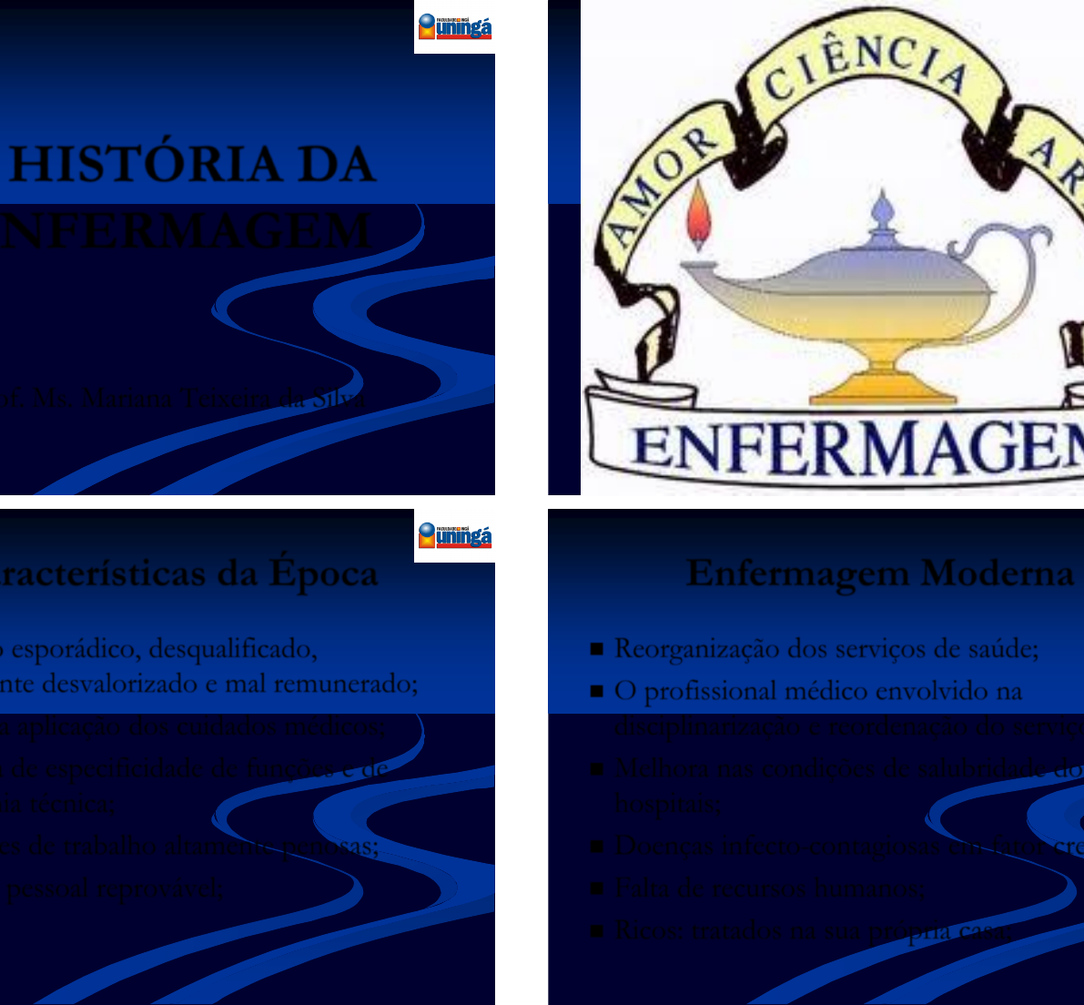 A HISTÓRIA DA ENFERMAGEM Prof. Ms. Mariana Teixeira da Silva Características da Época Trabalho esporádico, desqualificado, socialmente desvalorizado e mal remunerado; Grosseira aplicação dos cuidados médicos; Ausência de especificidade de funções e de autonomia técnica; Condições de trabalho altamente penosas; Conduta pessoal reprovável; Enfermagem Moderna Reorganização dos serviços de saúde; O profissional médico envolvido na disciplinarização e reordenação do serviço; Melhora nas condições de salubridade dos hospitais; Doenças infecto-contagiosas em fator crescente; Falta de recursos humanos; Ricos: tratados na sua própria casa; Enfermagem Moderna Os pobres: tornavam-se objetos de instrução e experiências – conhecimento; Cenário do ínicio da atuação de enfermagem; Culmina com o convite do Ministro da Guerra da Inglaterra para Florence Nightingale, prestar seus cuidados aos soldados feridos no combate na Guerra da Criméia. Florence Nightingale Nascida em 12 de maio de 1820, em Florença na Itália, filha de ingleses; Inteligência incomum, tenacidade de propósitos, determinação e perseverança; Idiomas: inglês, francês, alemão, grego e latim; 1844: estuda atividades das Irmandades Católicas em Roma, com desejo de se tornar enfermeira; Florence Nightingale Aos 24 anos, quis praticar em hospitais, porém não teve permissão da mãe, pois o pessoal do serviço aos doentes dividiam-se em grupos: o menor de religiosas católicas e anglicanas, que estava começando a se organizar; o outro maior de pessoas sem educação e moral; Florence Nightingale 1849: aos 31 anos vai ao Egito e decide servir à Deus, trabalhando em Kaiserswert na Alemanha entre as diaconisas; Hospital com 100 leitos, onde trabalhavam 49 diaconisas; Para aprimorar seus conhecimentos, visita hospitais e conhece irmãs de caridade; Preparo; (Hospital St. Germain e 1853 em Londres “Estabelecimento para senhoras Enfermas”, como superintendente; 1854: Guerra da Criméia ( Inglaterra, França e turquia declaram Guerra à Rússia); Florence Nightingale Florence e mais 38 voluntária (religiosas e leigas) de diferentes hospitais partem para Scutari; Morte dos hospitalizados: 40%; Atuação e organização do trabalho: do mais complexo ao mais simples; Destaque; A taxa de mortalidade cai de 40 para 2%; Imortalizada como “A Dama da Lâmpada”; Florence Nightingale Tal hospital era superlotado: 4000 feridos; Constatado que a falta de higiene e doenças matavam grande parte dos soldados internados por ferimentos; Soldados deitados no chão bruto, rodeados de insetos e ratos, operações realizadas sem cuidados de higiene; Os feridos tinham sete vezes mais chances de morrer de doenças hospitalares, do que no campo de batalha; Florence Nightingale No retorno a Londres, em agosto de 1856, quatro meses após a assinatura do tratado de paz, Florence descobriu que os soldados durante os tempos de paz, com idades variando de 20 a 35 anos, tinham uma taxa de mortalidade que era o dobro da dos civis. Utilizando, estas estatísticas, ela mostrou a necessidade de uma reforma nas condições sanitárias de todos os hospitais militares. Seu desejo, por uma investigação formal, foi atendido em maio de 1857 e levou ao estabelecimento da Comissão Real Sobre a Saúde nas Forças Armadas Florence Nightingale 1856: contrai Tifo e ao retornar da Criméia leva uma vida de inválida*; Recebe prêmio do governo inglês pelos trabalhos na Criméia; Se dedica à trabalhos intelectuais; 1859: com os recursos do prêmio recebido inicia uma Escola de Enfermagem; Fundou a Escola de Enfermagem no Hospital Saint Thomas – modelo para as posteriores; Em 9 de julho de 1860; Florence Nightingale 1874: tornou-se membro honorário da ASA (Associação Estatística Americana); 1883: a Rainha Vitória condecorou com a Cruz Vermelha Real pelo seu trabalho; 1907: primeira mulher em receber a Ordem do Mérito de Edward VII; Publicou cerce de 200 livros, relatórios e panfletos; (Ex: Notes on Nursing) Florence Nightingale Escola Nightingaleana: disciplina rigorosa, do tipo militar, exigência de qualidades morais da candidata; O curso era de um ano de duração, com aulas diárias ministradas por médicos; Os médicos, decidiam as funções que poderiam colocar nas mãos das enfermeiras; Dia 13 de agosto de 1910, morre; Observação Como era solteira, trabalhava fora de casa e agia de acordo com as suas idéias, serviu de exemplo a outras mulheres e contribuiu para impor respeito pelo papel da mulher na sociedade, e só parou de trabalhar quando ficou completamente cega (1910), morrendo em Londres, aos noventa anos de idade. Florence Nightingale Deixou florescente o ensino da enfermagem; Empírico ao especializado; Ocupação assalariada; Atende a necessidade de mão-de-obra dos hospitais; Prática social institucionalizada e específica; “A Dama da Lâmpada” JURAMENTO DE FLORENCE NIGHTINGALE Primeira Escola de Enfermagem Enfermagem compreende o cuidado autônomo e colaborativo ao indivíduo de todas as idades, famílias, grupos e comunidade, doente ou sadio, em todos os setores de atendimento. Enfermagem inclui a promoção da saúde, prevenção da doença e o cuidado ao indivíduo doente, incapacitado e morrendo. Advogar, promover ambiente seguro, pesquisa, participar na elaboração de políticas de saúde e em sistemas de gerenciamento de saúde e ensino, são também papéis chaves dos enfermeiros. Primeiras Escolas de Enfermagem Dificuldades: incompreensão dos valores necessários ao desempenho da profissão; A partir da Inglaterra as escolas se espalharam pelo mundo; 1873: primeira escola criada nos Estados Unidos; 1877: primeiras enfermeiras diplomadas começam a prestar serviços domiciliares em New York; Funcionamento das Escolas Segundo a filosofia de Florence Nightingale; Baseada em quatro idéias chave: 1. O treinamento de enfermeiras deveria ser considerado tão importante quanto qualquer outra form