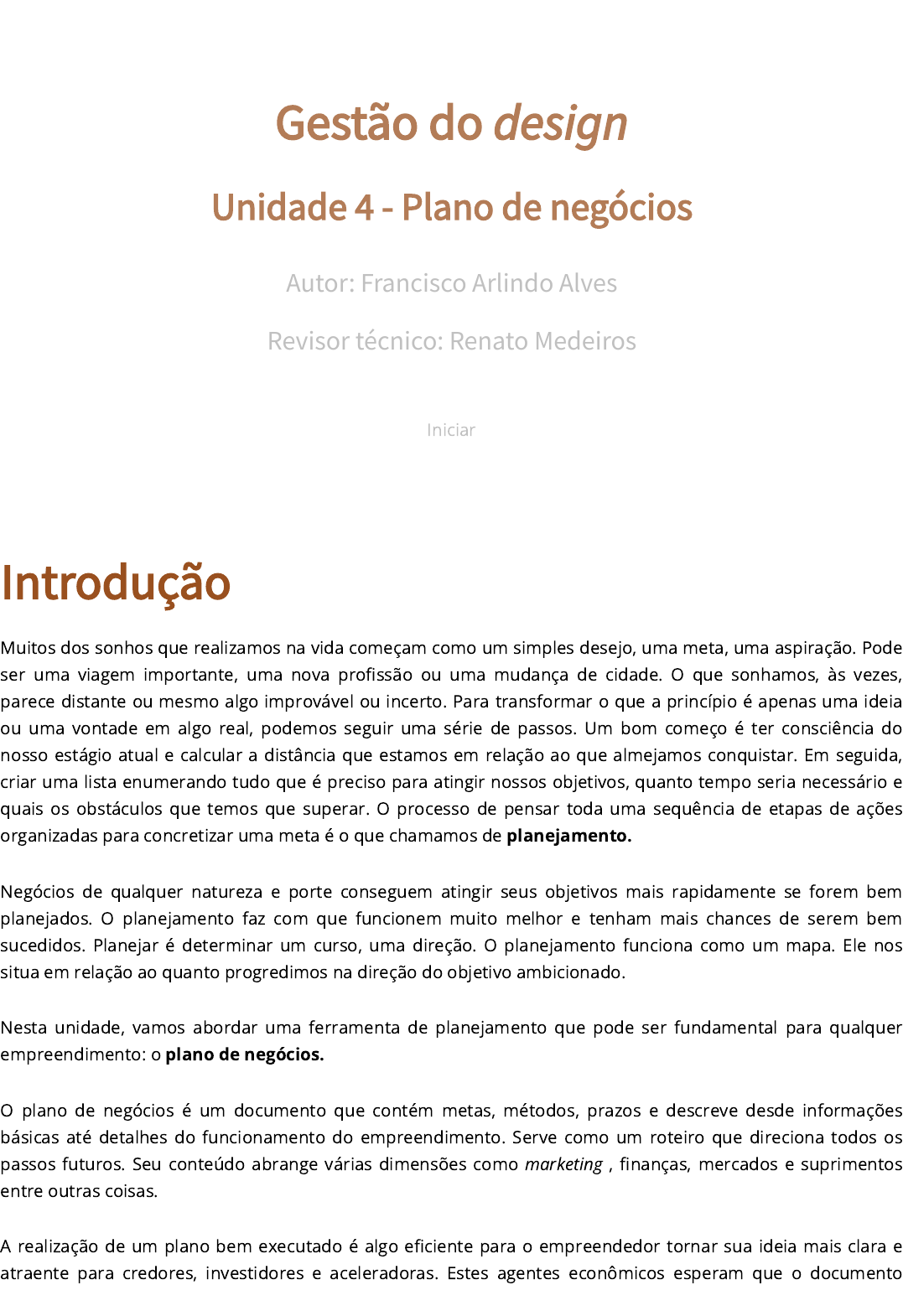 10/03/2023, 15:54 MY_BL4_DEM_GESDES_20_E4 https://student.ulife.com.br/ContentPlayer/Index?lc=0hTdMX38H44TkCncEIcOEw%3d%3d&l=wRkM7un5SnWnZbSrJ4wRrA%3d%3d&cd=e7C… 1/17 Gestão do design Unidade 4 - Plano de negócios Autor: Francisco Arlindo Alves Revisor técnico: Renato Medeiros Iniciar Introdução Muitos dos sonhos que realizamos na vida começam como um simples desejo, uma meta, uma aspiração. Pode ser uma viagem importante, uma nova pro�ssão ou uma mudança de cidade. O que sonhamos, às vezes, parece distante ou mesmo algo improvável ou incerto. Para transformar o que a princípio é apenas uma ideia ou uma vontade em algo real, podemos seguir uma série de passos. Um bom começo é ter consciência do nosso estágio atual e calcular a distância que estamos em relação ao que almejamos conquistar. Em seguida, criar uma lista enumerando tudo que é preciso para atingir nossos objetivos, quanto tempo seria necessário e quais os obstáculos que temos que superar. O processo de pensar toda uma sequência de etapas de ações organizadas para concretizar uma meta é o que chamamos de planejamento. Negócios de qualquer natureza e porte conseguem atingir seus objetivos mais rapidamente se forem bem planejados. O planejamento faz com que funcionem muito melhor e tenham mais chances de serem bem sucedidos. Planejar é determinar um curso, uma direção. O planejamento funciona como um mapa. Ele nos situa em relação ao quanto progredimos na direção do objetivo ambicionado. Nesta unidade, vamos abordar uma ferramenta de planejamento que pode ser fundamental para qualquer empreendimento: o plano de negócios. O plano de negócios é um documento que contém metas, métodos, prazos e descreve desde informações básicas até detalhes do funcionamento do empreendimento. Serve como um roteiro que direciona todos os passos futuros. Seu conteúdo abrange várias dimensões como marketing , �nanças, mercados e suprimentos entre outras coisas. A realização de um plano bem executado é algo e�ciente para o empreendedor tornar sua ideia mais clara e atraente para credores, investidores e aceleradoras. Estes agentes econômicos esperam que o documento 10/03/2023, 15:54 MY_BL4_DEM_GESDES_20_E4 https://student.ulife.com.br/ContentPlayer/Index?lc=0hTdMX38H44TkCncEIcOEw%3d%3d&l=wRkM7un5SnWnZbSrJ4wRrA%3d%3d&cd=e7C… 2/17 evidencie a solidez do empreendimento, demonstrando se existe um risco aceitável, lucratividade ou criação de valor. Mas do que isso, é um documento que serve para o próprio empreendedor ter uma compreensão mais abrangente sobre o contexto em que seu negócio está inserido (público alvo, concorrência, fornecedores). Por meio dele, se pode mensurar a viabilidade, os pontos fortes e os pontos fracos. A seguir vamos entender melhor como elaborar esta ferramenta fundamental para o empreendedorismo. Bons estudos! 1. Plano de negócios: os primeiros passos, a empresa e a segmentação A realização do plano de negócios funciona como percurso de conhecimento e aprendizado. Durante sua elaboração, pouco a pouco �cam mais claros aspectos que não haviam sido percebidos inicialmente pelos empreendedores. Desde os passos que antecedem a sua escrita até a sua conclusão, este entendimento se amplia. É uma jornada que deve ser valorizada pelo seu processo e não apenas pelo resultado �nal. O caminho trilhado para a confecção do plano torna a equipe mais coesa e a�nada e faz com que sejam mais nítidas a identi�cação de oportunidades. A partir dos primeiros passos da elaboração do plano, nos rascunhos iniciais, já começa a se formar na mente do empreendedor uma visão geral de aspectos do negócio, que serão melhor detalhadas em cada uma das etapas especí�cas posteriores, começando pela análise de mercado. A análise de mercado mostra, entre outros aspectos, qual a demanda para o produto ou serviços que se pretende lançar. As conclusões desta análise direcionam os estágios seguintes em relação a estratégia de marketing e a gestão das �nanças. 1.1 Iniciando o plano Para quem estamos escrevendo um plano de negócios? É adequado de�nir quem será o leitor e quais seus interesses e necessidades. O documento �nal não precisa ser uma peça estática e inalterável para ser lida a partir do mesmo ponto de vista por todos. Investidores, por exemplo, estão interessados no retorno econômico, no tamanho do mercado e qual as ameaças de concorrência. Bancos direcionam seu foco na gestão �nanceira em relação a capacidade de pagamento. Clientes querem entender as vantagens do produto. Incubadoras e aceleradoras almejam encontrar um potencial inovador. É muito mais e�ciente que existam versões distintas ressaltando aspectos de acordo com as demandas e preocupações do grupo para o qual o documento será apresentado. 10/03/2023, 15:54 MY_BL4_DEM_GESDES_20_E4 https://student.ulife.com.br/ContentPlayer/Index?lc=0hTdMX38H44TkCncEIcOEw%3d%3d&l=wRkM7un5SnWnZbSrJ4wRrA%3d%3d&cd=e7C… 3/17 Figura 1 - Público do plano de negócios. Fonte: produzido por Francisco Arlindo Alves com base no modelo de BIZZOTTO (2008), 2020. Um bom exercício que facilita o trabalho inicial pode ser desenhar um mapa mental, identi�cando os elementos essenciais do plano de negócios (veja a �gura 1). Cada um deles será melhor aprofundado com pesquisas e dados reais no decorrer do processo. Figura 2 - Elementos essenciais do plano de negócios. Fonte: produzido por Francisco Arlindo Alves com base no modelo de BIZZOTTO (2008), 2020. O plano de negócios deve combinar e concentrar tudo que se relaciona ao empreendimento num documento único. O sucesso do negócio depende que todos os elementos essenciais dialoguem e se encaixem. 1.2 Sumário executivo O sumário executivo é uma das primeiras partes do plano de negócios, mas é uma das últimas partes a ser concluída. Se trata de um tipo de resumo que explica sucintamente o que é a empresa para o leitor