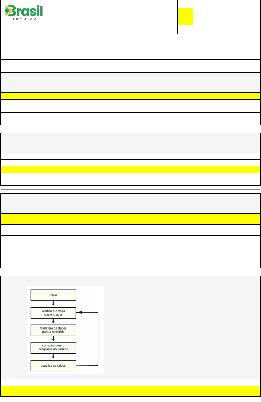Pincel Atômico - 12/03/2023 09:23:18 1/2 JULIANO SALVADOR BELO PACHECO Exercício Caminho do Conhecimento - Etapa 14 (27868) Atividade finalizada em 12/03/2023 09:22:40 (749826 / 1) LEGENDA Resposta correta na questão # Resposta correta - Questão Anulada X Resposta selecionada pelo Aluno Disciplina: PROJETOS DE AUTOMAÇÃO [469959] - Avaliação com 4 questões, com o peso total de 6,50 pontos [capítulos - 117] Turma: Curso Técnico: Automação Industrial - Grupo: BT EAD - JUNHO/2022 - BT EADAUT [68250] Aluno(a): 91324854 - JULIANO SALVADOR BELO PACHECO - Respondeu 4 questões corretas, obtendo um total de 6,50 pontos como nota [350195_1937 99] Questão 001 O nome que se dá ao estudo da distribuição espacial ou do posicionamento relativo dos diversos elementos que compõem um posto de trabalho/ambiente é: X Arranjo físico (Layout) Projeto participativo Ambiente físico Agrupamento funcional Projeto do micro espaço [350196_1938 04] Questão 002 De acordo com o conceito "como construído, sendo utilizado para nomear o processo de levantamento de todas as medidas existentes nas edificações, transformando as informações avaliadas em um desenho técnico que irá representar a atual situação de dados e trajetos de instalações elétricas, hidráulicas, estrutural, etc". É designado: Projeto arquitetônico Estudos preliminares X As built Projetos complementares Diário de obra [350194_1938 05] Questão 003 Falhas em equipamentos elétricos frequentemente são ocasionadas por conexões realizadas de forma inadequada. Assinale a alternativa CORRETA sobre as conexões elétricas em instalações de baixa tensão. X As conexões de condutores entre si e com outros componentes da instalação devem garantir continuidade elétrica durável e adequadasuportabilidade mecânica. Devem suportar os esforços impostos pelas correntes em condições normais e podem sofrer modificações inadmissíveis em decorrência de seu aquecimento. As conexões prensadas devem ser realizadas por meio de ferramentas comuns, como alicates universais, e de acordo com as recomendações do fabricante. Na seleção dos meios de conexão são considerados apenas o material dos condutores, não havendo influência da seção dos condutores ou da quantidade de fios. Por norma, as conexões devem ser acessíveis para verificação e manutenção, inclusive em emendas de cabos enterrados e emendas imersas em compostos ou seladas. [350194_1938 07] Questão 004 O CLP é um equipamento eletrônico digital, com hardware e software adequados para as aplicações industriais. A figura abaixo apresenta um diagrama de blocos de seu funcionamento: A respeito do controle e processamento das entradas e saídas, assinale a afirmativa CORRETA. Ao ser ligado, todas as entradas são desativadas. X O CLP atualiza a memória imagem das saídas, e na sequência atualiza as interfaces ou módulos de saída, para iniciar um novo ciclo devarredura. Pincel Atômico - 12/03/2023 09:23:18 2/2 A leitura do estado das entradas, após o ciclo de varredura é apagada. A execução do programa do usuário é realizada após a desativação das saídas. O procedimento de leitura das entradas para verificar se algo foi acionado consome alguns segundos no controle.