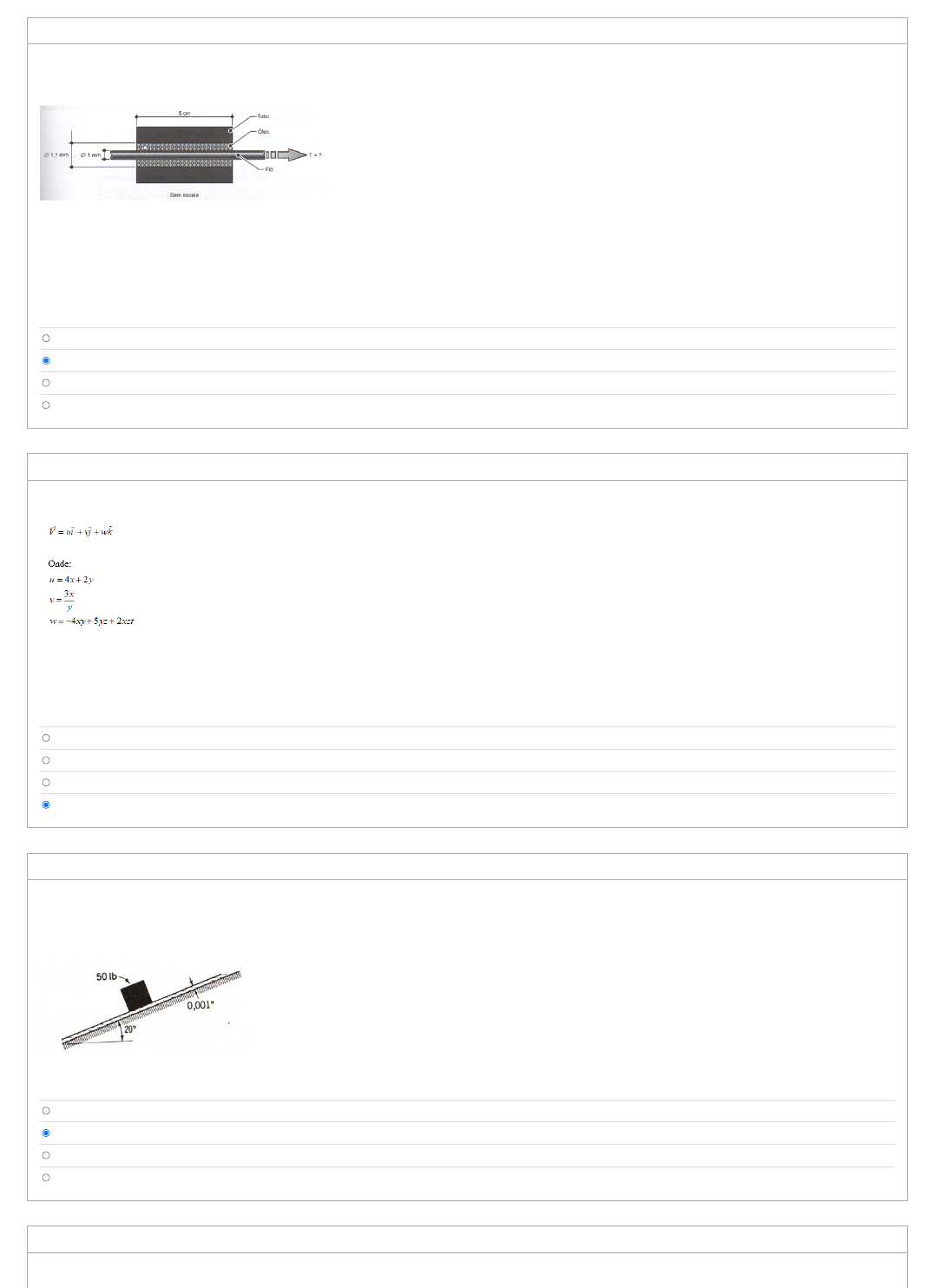 11/03/2023 09:56 Teste: UNIDADE I_AVALIATIVA _INTRODUÇÃO A MECÂNICA DOS FLUIDOS_1_2023 https://pucminas.instructure.com/courses/149004/quizzes/362242/take 1/2 UNIDADE I_AVALIATIVA _INTRODUÇÃO A MECÂNICA DOS FLUIDOS_1_2023 Iniciado: 11 mar em 9:18 Instruções do teste 1,2 ptsPergunta 1 0,126 N 1,26 N 126 N 12,6 N Um fio metálico de 1,00 mm de diâmetro é tracionado com velocidade constante de 1 m/s, através de um tubo fixo com diâmetro interno de 1,1 mm e comprimento de 5 cm. O fio pode ser considerado centrado no tubo pela presença de óleo lubrificante com viscosidade dinâmica de 0,4 Pa.s. Determinar a força de tração T necessária no fio, em (N). 1,2 ptsPergunta 2 bidimensional; permanente; 10,2 tridimensional; permanente; 10,2 bidimensional; transiente; 10,2 tridimensional; transiente; 10,2 O campo de velocidades de um escoamento é dado por: Determinar se o escoamento é uni, bi ou tridimensional, permanente ou transiente e a velocidade do elemento fluido localizado no ponto P = (0,-1,2) no instante t = 2 s 1,2 ptsPergunta 3 59,4 71,3 7,13 5,94 Um bloco pesando 50 lbf e com dimensões de 8 polegadas numa aresta pode deslizar para baixo em uma superfície inclinada, na qual há uma fina película de óleo de viscosidade igual a 4,5 x 10 lbf.s/ft . Determinar a velocidade do bloco, em (ft/s), se a película de óleo tem 0,001 polegadas de espessura. Supor que a distribuição de velocidade na película de óleo seja linear. A superfície está inclinada de 20º a partir da horizontal. -5 2 1,2 ptsPergunta 4 11/03/2023 09:56 Teste: UNIDADE I_AVALIATIVA _INTRODUÇÃO A MECÂNICA DOS FLUIDOS_1_2023 https://pucminas.instructure.com/courses/149004/quizzes/362242/take 2/2 Salvo em 9:56 2893,95; 1091,5; 2,95; 3,45.10 2893,95; 1091,5; 2,95; 3,39.10 2893,95; 10915; 2,95; 3,45.10 28939,5; 10915; 2,95; 3,39.10 A massa específica do tetrabromoetano é 2950kg/m . Determinar o peso específico, em N/m , na Terra e em Marte (g = 3,7 m/s ) e a gravidade específica do tetrabromoetano. Determinar o volume específico, em m /kg . 3 3 2 3 -5 -4 -5 -4 1,2 ptsPergunta 5 1,62 N 3,48 N 0,86 N 3,24 N FOX, Robert W.; McDONALD, Alan T.; PRITCHARD, Philip J.; Mitchell, John W. Introdução à Mecânica dos Fluidos. 9 ed., RJ: LTC, 2018. Uma chapa plana fina de dimensões 20 cm x 20 cm é puxada horizontalmente com velocidade de 1m/s sobre uma camada de óleo de 3,6 mm de espessura entre duas chapas planas, uma estacionária e a outra se movendo com velocidade constante de 0,3 m/s, como mostrado na figura abaixo. A viscosidade dinâmica do óleo é 0,027 (Pa.s). Considerando que a velocidade de cada camada de óleo varie linearmente. Determine a força, em (N), que precisa ser aplicada sobre a chapa para manter o movimento. Enviar teste