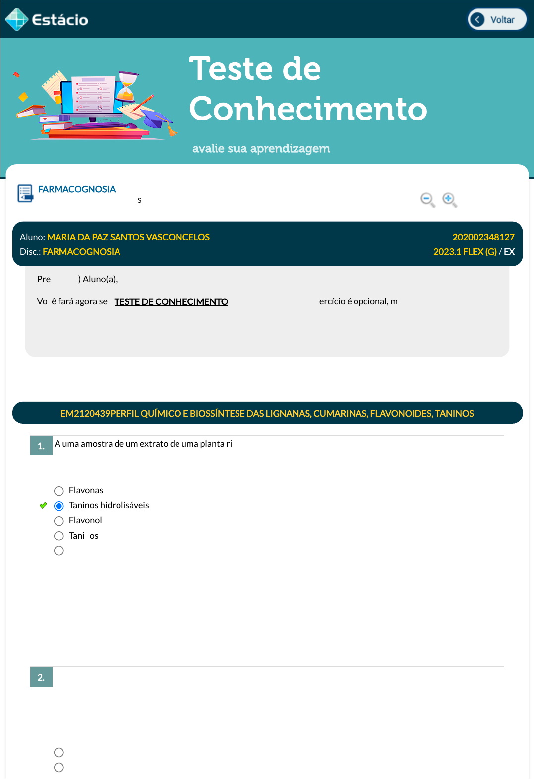 13/03/2023 10:18 Estácio: Alunos https://simulado.estacio.br/alunos/ 1/6 Teste de Conhecimento avalie sua aprendizagem A uma amostra de um extrato de uma planta rica em polifenóis é adicionada um pequeno volume de uma solução com sais de ferro (FeCl3). Imediatamente formou-se um precipitado azul-escuro. Esse teste demonstra que nessa amostra temos a presença de: Historicamente, a caracterização dos principais grupos de metabólitos secundários tem sido realizada por ensaios clássicos, os quais são baseados em reações químicas que resultam no aparecimento de cor e/ou precipitação nas amostras investigadas. Na literatura esses ensaios são chamados de "marcha analítica". Fonte: SIMÕES, C. M. O. et. al. Farmacognosia: do produto natural ao medicamento. Porto Alegre: Artmed, 2017. A reação para a caracterização de �avonoide é conhecida por reação de: FARMACOGNOSIA Lupa DGT1153_202002348127_TEMAS Aluno: MARIA DA PAZ SANTOS VASCONCELOS Matr.: 202002348127 Disc.: FARMACOGNOSIA 2023.1 FLEX (G) / EX Prezado (a) Aluno(a), Você fará agora seu TESTE DE CONHECIMENTO! Lembre-se que este exercício é opcional, mas não valerá ponto para sua avaliação. O mesmo será composto de questões de múltipla escolha. Após responde cada questão, você terá acesso ao gabarito comentado e/ou à explicação da mesma. Aproveite para se familiarizar com este modelo de questões que será usado na sua AV e AVS. EM2120439PERFIL QUÍMICO E BIOSSÍNTESE DAS LIGNANAS, CUMARINAS, FLAVONOIDES, TANINOS 1. Flavonas Taninos hidrolisáveis Flavonol Taninos condensados Iso�avonas Data Resp.: 13/03/2023 10:17:49 Explicação: A resposta correta é: Taninos hidrolisáveis 2. Bornträger Dragendorff javascript:voltar(); javascript:voltar(); javascript:diminui(); javascript:aumenta(); 13/03/2023 10:18 Estácio: Alunos https://simulado.estacio.br/alunos/ 2/6 Como base nos conceitos sobre droga e produto natural, marque a opção que contenha uma distinção e uma semelhança entre eles, respectivamente: Qual dos grupos de fármacos a seguir ainda possui as plantas como principal fonte de obtenção: Muitos dos metabólitos secundários ocorrem na natureza na forma de glicosídeos ou gliconas. Dessa maneira, analise as estruturas a seguir e indique qual delas sofreu uma O-glicosilação. Mayer Shinoda Liebermann-Burchard Data Resp.: 13/03/2023 10:17:51 Explicação: A resposta correta é: Shinoda EM2120437INTRODUÇÃO À FARMACOGNOSIA 3. sofre processos de coleta, preparo e conservação / pode ter uma origem completamente sintética. pode ter uma origem completamente sintética / sofre processos de coleta, preparo e conservação. possui atividade farmacológica ou biológica / originalmente obtido de um organismo vivo. originalmente obtido de um organismo vivo / pode ter uma origem completamente sintética. pode ter uma origem completamente sintética / possui atividade farmacológica ou biológica. Data Resp.: 13/03/2023 10:17:53 Explicação: A resposta correta é: pode ter uma origem completamente sintética / possui atividade farmacológica ou biológica. 4. antidepressivos tricíclicos, como Amitriptilina e Clomipramina. analgésicos e antipiréticos, como Aspirina e Acetanilida. anticancerígenos inibidores mitóticos, como Paclitaxel e Vinblastina. antivirais inibidores de protease, como Saquinavir e Ritonavir. cardenolídeos digitálicos, como o Lanatosídeo C e a Digoxina. Data Resp.: 13/03/2023 10:17:55 Explicação: A resposta correta é: cardenolídeos digitálicos, como o Lanatosídeo C e a Digoxina. EM2120767METABOLISMO SECUNDÁRIO VEGETAL 5. 13/03/2023 10:18 Estácio: Alunos https://simulado.estacio.br/alunos/ 3/6 Marque a opção que contenha apenas metabólitos de via mista. As quinonas são compostos orgânicos que podem ser considerados produtos da oxidação de fenóis. Sua principal característica estrutural é a presença de dois grupos carbonílicos que formam um sistema conjugado com pelo menos duas ligações duplas entre átomos de carbono. Sendo assim, assinale a alternativa referente a uma quinona: I, II e IV II e IV I, III e IV I, II e III II, III e IV Data Resp.: 13/03/2023 10:17:57 Explicação: A resposta correta é: I, II e III 6. Fenilpropanoides e �avonoides Fenilpropanoides e alcaloides Flavonoides e alcaloides Cloro�las e �avonoides Fenilpropanoides e cloro�las Data Resp.: 13/03/2023 10:17:59 Explicação: A resposta correta é: Cloro�las e �avonoides EM2120438PERFIL QUÍMICO E BIOSSÍNTESE DOS POLICETÍDEOS, QUINONAS, TERPENOS, HETEROSÍDEO CARDIOTÔNICO 7. 13/03/2023 10:18 Estácio: Alunos https://simulado.estacio.br/alunos/ 4/6 Data Resp.: 13/03/2023 10:18:03 13/03/2023 10:18 Estácio: Alunos https://simulado.estacio.br/alunos/ 5/6 Assinale a alternativa que contempla, dentre os tipos de metabólitos estudados, aqueles que funcionam como aceptores e transportadores de elétrons em cadeia de transporte de elétrons, como os da cadeia de transporte de elétrons da mitocôndria e do cloroplasto: (FUNIVERSA - PC-DF - Perito Criminal - Biológicas - 2012) A cocaína - alcaloide extraído da planta Erythroxylum coca - é uma substância com alto poder de indução de dependência em seus usuários. Existem diversas formas e inúmeros padrões de uso desse alcaloide, condicionados a sua forma química (sal ou base livre), que geram características distintas em relação, principalmente, à toxicocinética nos usuários. Essa característica de conversão da cocaína da forma de sal para base livre (ou o contrário) é o conceito utilizado para os processos de extração e re�no. Essa ideia também é utilizada com �nalidade forense, para identi�cação preliminar de materiais suspeitos de conter cocaína. A respeito desse assunto, assinale a alternativa correta: Explicação: A resposta certa é: 8. Saponinas Quinonas Terpenos Ácidos graxos Heterosídeos cardioativos Data Resp.: 13/03/2023 10:18:07 Explicação: A resposta certa é: Quinonas