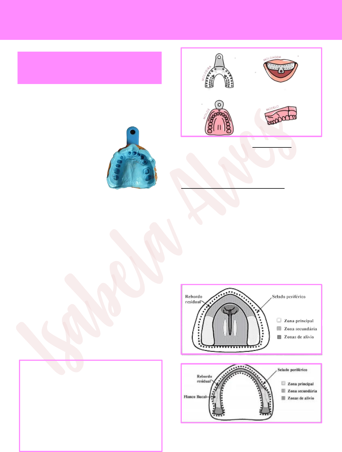 MOLDAGEM ANATÔMICA + MOLDEIRA INDIVIDUAL + MOLDAGEM FUNCIONAL • Dentro da montagem da Prótese total existem as etapas de moldagem anatômica (de estudo), a confecção da moldeira individual e a moldagem individual. MOLDAGEM ANATÔMICA • Moldagem = reprodução em negativo dos detalhes anatômicos, e contorno da área chapeável (da abóboda palatina/superior e rebordo alveolar/inferior), por meio da ação dinâmica das estruturas relacionadas com a prótese. De modo que, a reprodução do tecido dessa área representa um dos pontos importantes da moldagem, determinando sucesso ou não na prótese. • É uma reprodução mais generalista/básica da área chapeável, sendo também considerada uma moldagem de planejamento, em que se obtém um modelo de estudo. Nesse modelo obtido, observa-se o tamanho e formato da abóboda, onde se localizam as pregas e inserções musculares. • Durante a moldagem os objetivos principais são a preservação os tecidos bucais, a estabilidade, a retenção, o suporte e a estética. Além disso, essas moldagens devem proporcionar a confecção de bases de próteses totais satisfatórias, que respeitem os limites de tolerância fisiológica dos tecidos de suporte e estejam em harmonia com o rebordo do paciente. MOLDAGEM – ato de moldar o paciente, utilizando conhecimentos científicos, material adequado e utilização da técnica de moldagem. MOLDE – reprodução em negativo dos tecidos da área chapeável em determinada posição, registrada no momento da reação final do material de molde utilizado. MODELO – reprodução positiva obtida a partir do molde, após o vazamento do mesmo com gesso. Disponível in IG: @odontoenergy • As moldagens são divididas em: preliminar/anatômica e funcional/secundária. 1 . Moldagem prel iminar ou anatômica • Por meio dela se obtém a reprodução da área basal, permite avaliar as inserções musculares que se encontram na zona do selado periférico, saber se existe necessidade de cirurgias pré-protéticas, além de obter o modelo de estudo, que possibilitará a confecção da moldeira individual. • Divisão da área chapeável que será obtida no modelo de gesso: Reabilitação Oral https://www.instagram.com/odontoenergy/ Disponível em: https://www.academia.edu/19098191/ZONAS_DA_AREA_ CHAPEAVEL Zona princ ipal de suporte : são áreas do rebordo residual onde as forças oclusais incidem perpendicularmente e que, geralmente, não apresenta dificuldade de reabsorção. - Maxila corresponde à região posterior do rebordo e à área plana do palato duro; - Mandíbula corresponde à região posterior de rebordo e à região de flanco bucal. - O flanco bucal é constituído por cortical óssea densa, que, em virtude da estimulação do músculo bucinador, tende a não reabsorver com facilidade. Zona secundária de suporte (zona de estabi l idade): diferente da anterior, são regiões onde há maior facilidade de reabsorção do rebordo residual. - Maxila: correspondem à parte não plana do palato duro, às vertentes do rebordo residual e à região anterior do rebordo residual; - Mandíbula: correspondem à região anterior de rebordo e aos planos inclinados correspondentes às vertentes ósseas Selado perifér ico: corresponde ao vestíbulo dos maxilares/área de fundo de sulco em toda sua extensão, que representa as inserções musculares, - Envolve freio labial superior e inferior, pregas laterais; - Área muito importante e que deve ser perfeitamente copiada para gerar a vedação do ar na base de prótese que será desenvolvida; Zonas de al ív io: qualquer área dentro da abóboda palatina ou rebordo alveolar que apresente alguma irregularidade, retenção ou concavidade que contribua para que essa área adquira mais retenção na produção na base de prova. Elas dependem do tipo de rebordo, a anatomia, formato e tamanho do arco do paciente e estão relacionadas com fatores como: grau de resiliência da fibromucosa, à presença de áreas retentivas e de regiões anatômicas que devem ser comprimidas pela prótese. - Ex: região de papila incisiva, papila piriforme, rafe palatina mediana, regiões afiladas do rebordo residual e forame mental (excessiva reabsorção). *OBS: pelo fato das mesmas zonas estarem presentes tanto em arco superior quanto em arco inferior, essas zonas contam com características que coincidem fisiologicamente. - ZP: zonas principais de suporte; - ZS: zonas secundárias; - ZA: zonas de alívio - SP: zonas de selado periférico • Durante a realização dessa moldagem anatômica são utilizadas moldeiras de estoque/pré-fabricadas, que podem apresentar perfurações ou não, a depender do material escolhido para realizar a moldagem. • Os materiais mais indicados são os Hidrocolóides irreversíveis/alginato (mais utilizado) e as godivas em forma de placa. - Alginato = utilização de moldeiras perfuradas, para garantir retenção do molde; - Godiva = moldeira lisa. • REQUISITOS PARA UM MATERIAL DE MOLDAGEM EM PT - Tempo de trabalho adequado (tempo de espatulação, inserção e espera aceitável); - Grau de plasticidade adequado: - Alteração dimensional mínima (por exemplo, perda e ganho de umidade em relação ao ambiente, o que implica em necessidade de vazamento imediato) - Resistencia à fratura (associado à retirada de boca, mais especificamente ao rasgamento do molde); - Não ser tóxico (apresentar biocompatibilidade) MOLDAGEM COM ALGINATO • Material de escolha na maioria das vezes, devido as suas propriedades e vantagens. VANTAGENS: - Fácil manipulação; - Produz menos deformações aos tecidos de revestimento do rebordo (por apresentar boa fluidez e conseguir se dissipar entre os tecidos) - Boa fidelidade de cópia (razoável); - Facilidade de técnica; - Bom custo-benefício. DESVANTAGENS: - Afastamento deficiente dos tecidos moles (fluido demais) - Escoamento incontrolado (por ser fluido demais/principalmente se a proporção pó e líquido nã