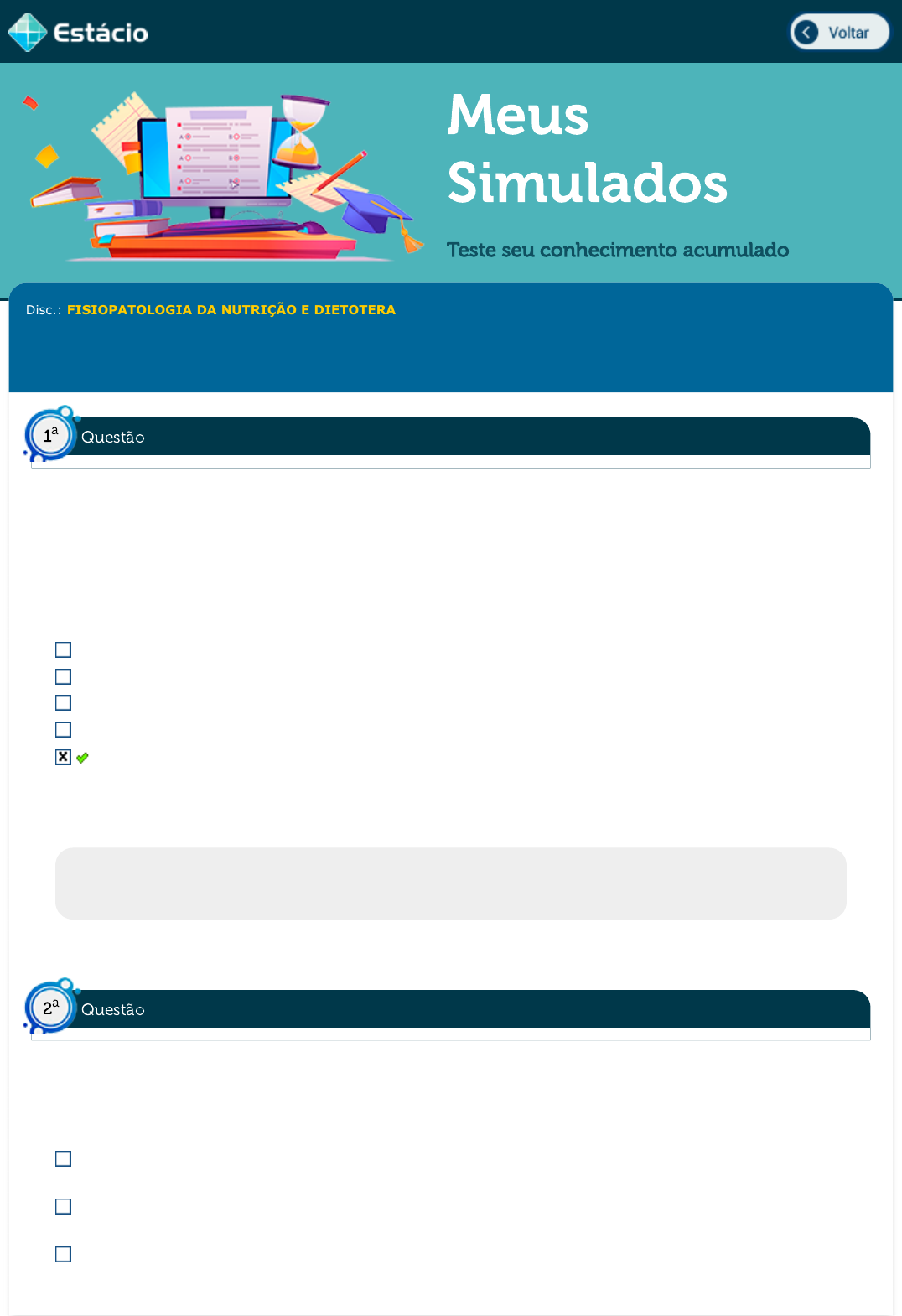 14/03/2023, 12:18 Estácio: Alunos https://simulado.estacio.br/alunos/ 1/6 Meus Simulados Teste seu conhecimento acumulado Disc.: FISIOPATOLOGIA DA NUTRIÇÃO E DIETOTERAPIA NAS DOENÇAS CRÍTIC. E ÓRGÃOS ANEXOS Aluno(a): DANIELLE DE OLIVEIRA CONSTANTE BARROS 202109141813 Acertos: 10,0 de 10,0 08/03/2023 Acerto: 1,0 / 1,0 Pacientes com doença hepática crônica geralmente apresentam ingestão dietética inadequada, alterações dos indicadores antropométricos, bioquímicos e clínicos, evidenciando comprometimento nutricional importante. Pacientes com hepatopatia descompensada possuem retenção hídrica, com a presença de ascite e edema periférico, associada à hipoalbuminemia e à desnutrição. Dos parâmetros de avaliação nutricional citados abaixo, quais devem ser usados para o diagnóstico de desnutrição do hepatopata? Balanço nitrogenado, albumina sérica e bilirrubina direta Peso corporal, dinamometria e albumina sérica Albumina sérica, IMC, bilirrubina direta Peso corporal, IMC e dobra cutânea triciptal Dobra cutânea triciptal e circunferência muscular do braço Respondido em 14/03/2023 11:52:03 Explicação: A resposta correta é: Dobra cutânea triciptal e circunferência muscular do braço Acerto: 1,0 / 1,0 A cirrose alcoólica geralmente é caracterizada por hepatomegalia. O suporte nutricional é o principal tratamento em adição ao aconselhamento ou apoio para suspender o consumo de álcool. Além da hepatomegalia, bioquimicamente pode-se observar concentrações: Elevadas de transaminases e bilirrubina sérica e concentrações de albumina sérica normais ou aumentadas. Normais de transaminases e bilirrubina sérica e concentrações de albumina sérica aumentadas. Diminuídas de transaminases e bilirrubina sérica e concentrações de albumina sérica normais ou diminuídas Questão1 a Questão2 a https://simulado.estacio.br/alunos/inicio.asp javascript:voltar(); 14/03/2023, 12:18 Estácio: Alunos https://simulado.estacio.br/alunos/ 2/6 Normais de transaminases e bilirrubina sérica e concentrações de albumina sérica normais ou diminuídas. Elevadas de transaminases e bilirrubina sérica e concentrações de albumina sérica normais ou diminuídas. Respondido em 14/03/2023 11:55:44 Explicação: A resposta correta é: Elevadas de transaminases e bilirrubina sérica e concentrações de albumina sérica normais ou diminuídas. Acerto: 1,0 / 1,0 Um homem de 55 anos de idade, com alto risco para doença arterial coronariana, compareceu ao ambulatório de nutrição para consulta. Para que sejam observadas as recomendações nutricionais para redução do colesterol plasmático total, esse paciente deve ser orientado a: Reduzir o consumo de gorduras totais e de açúcares simples e aumentar a ingestão de leite integral e frutas. Aumentar o consumo de ácidos graxos monoinsaturados e de proteína vegetal e manter a ingestão de laticínios integrais. Aumentar a ingestão de alimentos que são fontes de ácidos graxos poli- insaturados, reduzir a quantidade de açúcares simples e diminuir o número de refeições por dia. Retirar a gordura aparente das carnes, substituir os laticínios integrais por desnatados e reduzir a ingestão de gorduras vegetais hidrogenadas. Substituir as carnes por alimentos e laticínios integrais, aumentar o aporte de fibras dietéticas e reduzir a quantidade de frituras. Respondido em 08/03/2023 20:02:34 Explicação: A resposta correta é: Retirar a gordura aparente das carnes, substituir os laticínios integrais por desnatados e reduzir a ingestão de gorduras vegetais hidrogenadas. Acerto: 1,0 / 1,0 Aterosclerose é uma doença multifatorial, lenta e progressiva, com formação da placa de ateroma que determina uma congestão arterial em que participa combinados colesterol, proteínas, cálcio, plaquetas, fibrinas e outras substâncias. Marque a opção correta: A inflamação crônica na parte interna das artérias pode ser causada pelo acúmulo progressivo de lipoproteínas de alta densidade e triglicerídeos. O colesterol, transportado em pequenas partículas pelo sangue, tende a agregar- se às paredes das artérias quando não existem lesões de processos inflamatórios. O aparecimento da aterosclerose se dá pela inflamação crônica na parte interna das artérias, cuja causa pode ser o acúmulo progressivo de lipoproteínas de alta densidade. Questão3 a Questão4 a 14/03/2023, 12:18 Estácio: Alunos https://simulado.estacio.br/alunos/ 3/6 As HDL oxidadas intensificam uma série de reações pró-inflamatórias na camada endotelial. Os processos inflamatórios das artérias podem ser desencadeados por diferentes agentes, como fumo e pressão arterial elevada. Respondido em 14/03/2023 11:57:46 Explicação: A resposta correta é: Os processos inflamatórios das artérias podem ser desencadeados por diferentes agentes, como fumo e pressão arterial elevada. Acerto: 1,0 / 1,0 Os métodos recomendados para avaliação e acompanhamento nutricional de pacientes com doença pulmonar crônica são os tradicionais, ou seja: avaliação clínica, antropometria e bioquímica. Dentre os métodos de avaliação nutricional abaixo, marque a alternativa correta em relação ao paciente com pneumopatias crônicas: O paciente pode evoluir para um quadro de desnutrição grave, caracterizado por caquexia. A presença de sarcopenia é um dos critérios utilizados para o diagnóstico da caquexia. A avaliação clínica que inclui exame dos tecidos de proliferação rápida (cabelo, pele, lábios e língua) mostrará possíveis deficiências de macronutrientes. A dosagem sérica de albumina, transferrina e proteína carreadora de retinol, por exemplo, são muito específicas para avaliação da desnutrição em portadores de doenças pulmonares. O IMC (índice de massa corporal) é pouco específico para ser utilizado individualmente, já que não permite identificar os compartimentos corporais. O Recordatório Alimentar de 24 horas é 