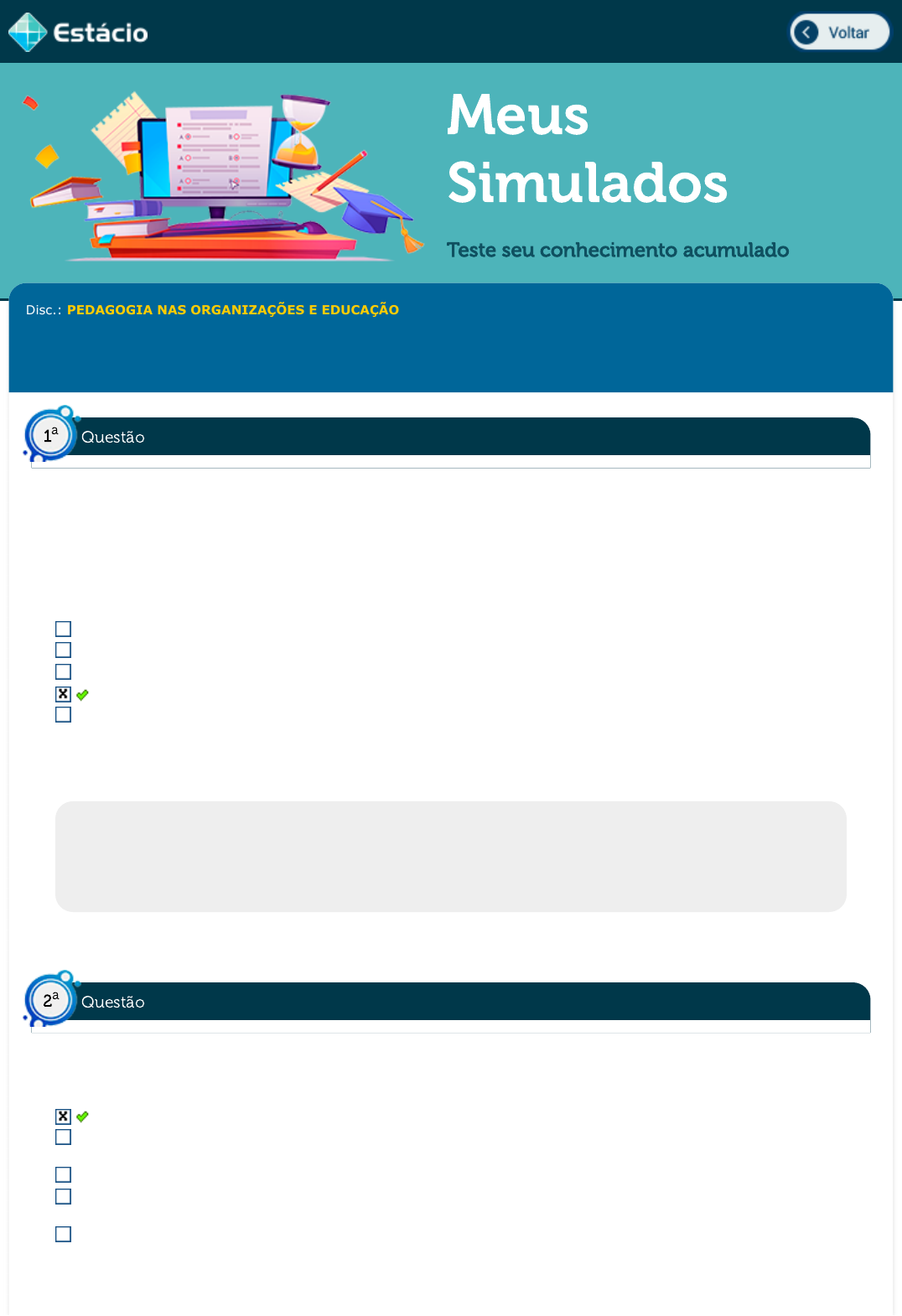 Meus Simulados Teste seu conhecimento acumulado Disc.: PEDAGOGIA NAS ORGANIZAÇÕES E EDUCAÇÃO PROFISSIONAL Aluno(a): MICHELE LUCIANA COSTA MARCHIOTE 202001698256 Acertos: 10,0 de 10,0 14/03/2023 Acerto: 1,0 / 1,0 "Com base nas relações dialéticas estabelecidas entre educação e sociedade sob a perspectiva materialista histórica gramsciana, pode-se concluir que a educação deve ser entendida como o resultado cultural de um longo caminho trilhado pela humanidade e, ao mesmo tempo, um processo histórico das práticas socioculturais dos seres humanos enquanto sujeito políticos ativos e partícipes das transformações da sociedade em que vivem". (MELO, Maria Lúcia e RODRIGUES, Denise Simões. Gramsci e a Educação. Anais da Jornada Internacional de Estudos e Pesquisas em Antonio Gramsci. 2016) Essa perspectiva pedagógica parece se alinhar à: Educação europeia novecentista. Educação unilateral. Educação bilateral. Educação omnilateral. Educação europeia oitocentista. Respondido em 14/03/2023 13:58:25 Explicação: Antonio Gramsci pensava que uma educação adequada à transformação da sociedade precisava educar tanto nas artes do falar quanto do fazer, integrando a dimensão prática do trabalho à emancipação política por meio do conhecimento crítico. Essa concepção alimenta-se da noção marxista de omnilateralidade como educação multidimensional dos sujeitos. Acerto: 1,0 / 1,0 Muitas práticas que aparentemente têm objetivos inclusivos e transformadores acabam, pela força da reprodução do sistema, cumprindo papel inverso que se sintoniza com a perpetuação da injustiça. De que forma a frequência à escola como direito de acesso ao ensino pode assumir um sentido perverso? Quando o direito de acesso faz com que a educação seja regida pela lógica do ¿mínimo necessário¿. Quando a escola passa a concorrer com ambientes perigosos por onde o jovem ou a criança circula em momentos de lazer. Quando o educando passa a ter acesso à direitos como alimentação e transporte. Quando esse direito de acesso se transforma numa educação transgressora da ordem social e dos costumes tradicionais. Quando a família não se importa com o fato de as crianças e os jovens estarem estudando. Respondido em 14/03/2023 13:58:42 Questão1 a Questão2 a https://simulado.estacio.br/alunos/inicio.asp javascript:voltar(); Explicação: Desde que haja uma concepção cultural de direito como garantia mínima, como favor do Estado ¿ pensado de forma paternalista ¿ em relação ao cidadão, o direito de acesso à educação passa a significar uma escola pública precarizada. E isso passa a ser naturalizado pela população e profissionais da educação com consequências muito nocivas para a formação dos indivíduos e o próprio desenvolvimento social. Sentido perverso é aquele que contraria o bem comum, a dignidade humana e a vida. Portanto, contrapor-se ao determinismo buscando novos rumos; defender a integridade física e emocional proporcionando ambientes seguros e acolhedores; garantir direitos vitais e se empenhar com a formação pela garantia do conhecimento é a superação da ideia de ¿mínimo necessário¿ e não manutenção dela. Portanto, a escola não é o único espaço de lutas pela obtenção e manutenção do poder, tampouco não é o principal espaço de socialização e desenvolvimento integral dos indivíduos. Acerto: 1,0 / 1,0 (Questão adaptada do concurso para a prefeitura de Florianópolis-SC. Administrador escolar / 2018) A origem da educação integral assenta-se em diversos movimentos educacionais ao longo da História da Educação Brasileira que, embora tenham em seus ideais algumas concepções divergentes, entendem que a educação integral é o protótipo que mais se aproxima do desenvolvimento completo do ser humano multidimensional, no âmbito da educação omnilateral. Avalie as afirmativas a seguir a cerca dessa concepção. I. Os ideais da Educação Integral aparecem na história da educação, no período colonial com os jesuítas que ensinavam também moral e religião. II. Nos anos 1980, uma experiência relacionada à Educação Integral merece destaque, como os mais de 500 Centros Integrados de Educação Pública (CIEPs) - construídos no Estado do Rio de Janeiro, uma "Escola Integral em horário integral", idealizados por Darcy Ribeiro e inspirados na experiência de Anísio Teixeira. III. A partir dos anos 1990 surgem pelo Brasil experiências de Tempo Integral e outras de Educação Integral, em sua maioria, experiências de educação omnilateral. Sobre as afirmações acima pode-se concluir que: As afirmativas I e III estão corretas. As afirmativas I e II estão corretas. Somente a afirmativa II está correta. Somente a afirmativa III está correta. As afirmativas II e III estão corretas. Respondido em 14/03/2023 13:59:07 Explicação: A Educação Jesuíta, pode ser considerada integral: seja por ser em tempo integral, seja pela compreensão de que o homem é mais que materialidade (daí, a formação religiosa, catequética). Porém, não se enquadra no modelo omnilateral. Quanto às propostas de Educação Integral a partir dos anos 1990, possuíam apenas a percepção do tempo integral. A experiência que mais se aproxima do ideal omnilateral é de fato os CIEPs, pois toda sua concepção está fundamentada também em ideais socialistas: é o Estado deve formar integralmente o cidadão! Acerto: 1,0 / 1,0 Assinale qual foi a primeira Constituição Brasileira a abordar a questão do ensino profissionalizante: Constituição de 1891. Constituição de 1967. Constituição de 1937. Constituição de 1988. Constituição de 1824. Respondido em 14/03/2023 13:59:20 Questão3 a Questão4 a Explicação: No ano de 1909, foram criadas 19 escolas técnicas pelo estado brasileiro, em diferentes unidades federativas, com objetivo de educar para o trabalho. Mas somente a Constituição Brasileira de 1937 foi a primeira a fa