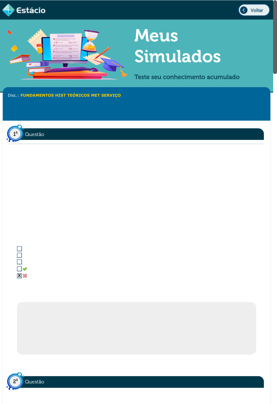 15/03/2023, 16:24 Estácio: Alunos https://simulado.estacio.br/alunos/ 1/1 Meus Simulados Teste seu conhecimento acumulado Disc.: FUNDAMENTOS HIST TEÓRICOS MET SERVIÇO SOCIAL Aluno(a): ALINE COSTA BENEVIDES 202110080296 Acertos: 4,0 de 10,0 08/03/2023 Acerto: 0,0 / 1,0 (FCC - 2015 - DPE-SP - Assistente Social). A prática profissional do Serviço Social só pode ser compreendida nas tramas das relações sociais. Nesse sentido, o trabalho do assistente social deve ser apreendido sob as dimensões objetivas e subjetivas. Considere as assertivas: I. A dimensão objetiva do trabalho do assistente social deve considerar os determinantes sócio-históricos do exercício profissional em diferentes conjunturas. II. A dimensão subjetiva do trabalho do assistente social deve utilizar-se da empatia, enquanto estratégia para estabelecimento de vínculo. III. É pela prestação de serviços socioassistenciais que o assistente social interfere nas relações sociais que fazem parte de sua população usuária. Está correto o que se afirma APENAS em: II. III. I e II. I e III. I. Respondido em 08/03/2023 22:31:55 Explicação: O trabalho profissional dos Assistentes Sociais faz-se na confluência de aspectos objetivos e subjetivos. Desse modo, as determinações e transformações pelas quais passa a sociedade, em diferentes conjunturas afetam diretamente a intervenção profissional. O nível de desenvolvimento das forças produtivas e as determinações sócio-históricas afetam diretamente a profissão, que se insere nas relações sociais. Relações estas que se manifestam no cotidiano profissional, em que as ações profissionais se concretizam. A Subjetividade no sentido apresentado em uma das opções está errada por ser, de alguma forma, banalização do trabalho do Profissional de Serviço Social, que mais uma vez, é esvaziado de sua competência e habilidades teóricas, reflexivas, técnicas e éticas, sendo apenas pensado como um profissional que deve ter empatia. Acerto: 1,0 / 1,0 (IADES, 2016 - CRESS-MG - Agente Fiscal - Assistente Social). Questão1 a Questão2 a https://simulado.estacio.br/alunos/inicio.asp javascript:voltar();