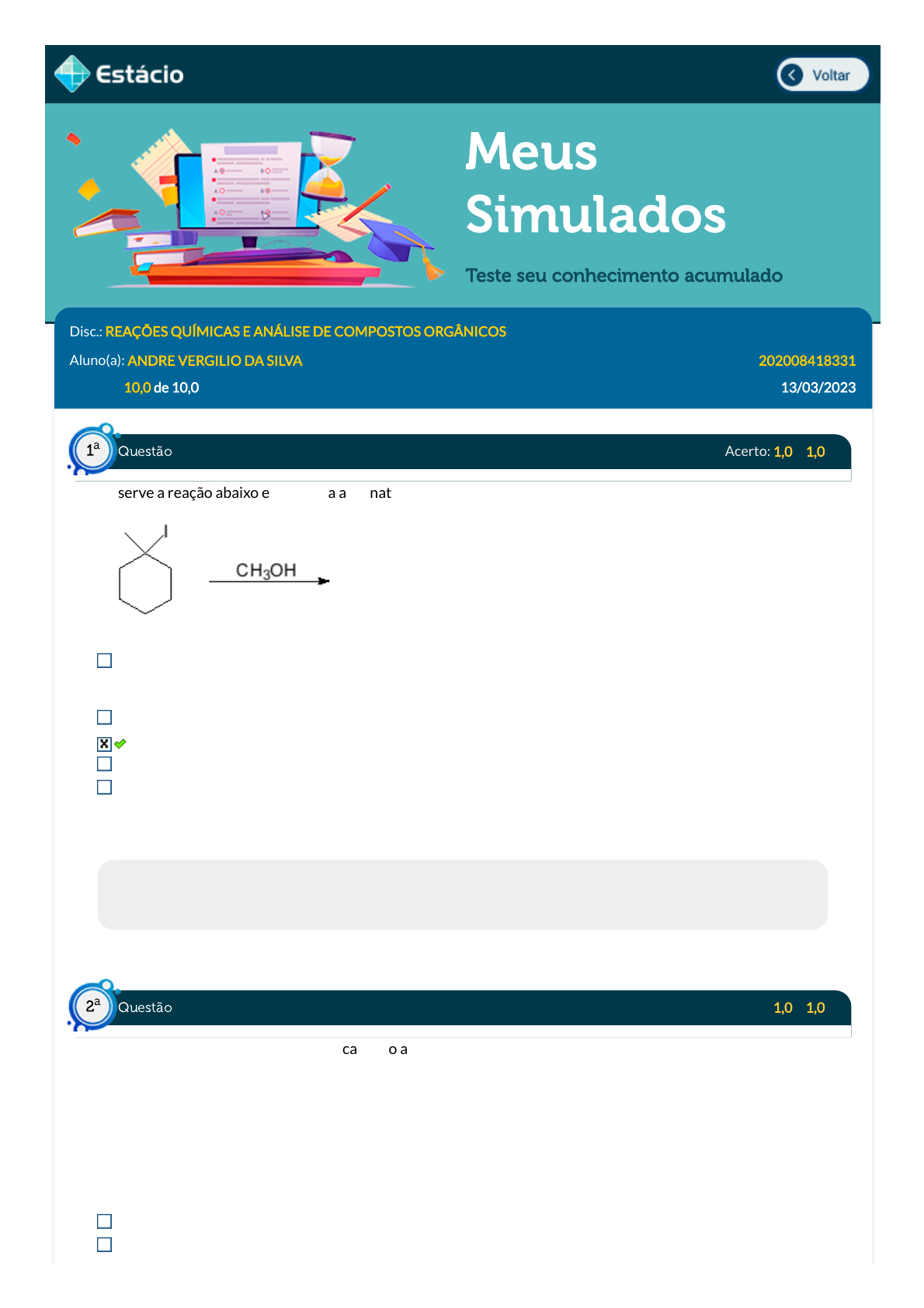 16/03/2023 11:38 Estácio: Alunos https://simulado.estacio.br/alunos/ 1/7 Meus Simulados Teste seu conhecimento acumulado Disc.: REAÇÕES QUÍMICAS E ANÁLISE DE COMPOSTOS ORGÂNICOS Aluno(a): ANDRE VERGILIO DA SILVA 202008418331 Acertos: 10,0 de 10,0 13/03/2023 Acerto: 1,0 / 1,0 Observe a reação abaixo e assinale a alternativa correta: A reação é uma solvólise e o mecanismo favorecido é o SN2. A presença do nucleó�lo forte favorece a SN2. A reação é uma solvólise e o mecanismo favorecido é o SN1. A presença do Iodeto terciário favorece a SN2. A reação ocorrerá tanto para substituição nucleofílica quanto para eliminação. Respondido em 13/03/2023 20:45:44 Explicação: A resposta correta é: A reação é uma solvólise e o mecanismo favorecido é o SN1. Acerto: 1,0 / 1,0 Considerando a ligação C-X entre um carbono alifático e um halogênio considere as seguintes a�rmativas: I- Devido a maior eletronegatividade dos halogênios em relação ao carbono esta ligação é polarizada. II- A cisão das ligações C-X quando ocorrem com deslocamento desigual dos elétrons é chamada de eletrolítica. III ¿ As quebras de ligação eletrolíticas geram Nucleó�los e Eletró�los. São verdadeiras as a�rmativas: Apenas a a�rmativa III está correta I e III Questão1 a Questão2 a https://simulado.estacio.br/alunos/inicio.asp javascript:voltar(); 16/03/2023 11:38 Estácio: Alunos https://simulado.estacio.br/alunos/ 2/7 I, II e III estão corretas I e II II e III Respondido em 13/03/2023 20:44:40 Explicação: A resposta correta é: I, II e III estão corretas. Acerto: 1,0 / 1,0 Considerando os dois compostos aromáticos a seguir, a nomenclatura correta destes é, respectivamente: 2-metil-1,3,5-trinitrobenzeno e 2-amino-3-etil-clorobenzeno 2,4-6-trinitro-metilbenzeno e 2-cloro-6-etil-aminobenzeno 4-metil-1,3,5-trinitrobenzeno e 6-amino-5-cloro-etilbenzeno 2,4-6-trinitro-metilbenzeno e 2-cloro-6-etil-aminobenzeno 2-metil-1,3,5-trinitrobenzeno e 6-amino-5-cloro-etilbenzeno Respondido em 13/03/2023 20:47:54 Explicação: A resposta correta é: 2-metil-1,3,5-trinitrobenzeno e 2-amino-3-etil-clorobenzeno Acerto: 1,0 / 1,0 Considerando a reação de nitração a seguir, frente a um substituinte X no benzeno e analisando os produtos formados, podemos a�rmar que: Questão3 a Questão4 a 16/03/2023 11:38 Estácio: Alunos https://simulado.estacio.br/alunos/ 3/7 O �uorbenzeno é o mais reativo da série e o mais seletivo para o produto para. Os halogênios (F, Cl, Br, I) ativam o anel benzênico pois são grupos doadores de elétrons. O bromobenzeno é o composto mais reativo da série devido a seu volume e polarizabilidade. Os halogênios são orientadores da posição meta. O �uorbenzeno é o composto menos reativo da série devido a sua alta eletronegatividade. Respondido em 13/03/2023 21:00:43 Explicação: A resposta correta é: O �uorbenzeno é o mais reativo da série e o mais seletivo para o produto para. Acerto: 1,0 / 1,0 Grupos acetais são extremamente importantes na síntese orgânica por permitirem a proteção de aldeídos e cetonas de reações indesejadas. Um aluno de doutorado, querendo proteger um grupo cetona de uma reação de redução, reagiu o 3-oxobutanoato de metila com o metanol utilizando catálise ácida para formar um acetal, conforme o esquema abaixo: Qual das estruturas abaixo representa o acetal A formado nesta reação? Questão5 a 16/03/2023 11:38 Estácio: Alunos https://simulado.estacio.br/alunos/ 4/7 Respondido em 13/03/2023 21:00:06 Explicação: Resposta correta é: D. Acerto: 1,0 / 1,0 Reações de oxidação e redução são importantes pois permitem a interconversão de grupos funcionais. Analise as a�rmativas a seguir sobre as reações de oxidação e redução: I - A redução de uma cetona utilizando composto de Grignard levará à formação de um álcool secundário. II - A oxidação de um aldeído a ácido carboxílico depende da formação do diol gem, ou seja, não pode ser realizada em meio anidro. III - Na oxidação de Baeyer-Villiger é possível oxidar cetonas através do uso de perácidos ou uma combinação de água oxigenada e um ácido de Lewis. IV - As reduções por hidreto podem ser feitas utilizando tanto o hidreto de alumínio e lítio quanto borohidreto de sódio, porém o segundo é preferido pois não reage violentamente com a água. I, II e IV, apenas. I, II e III, apenas. Questão6 a 16/03/2023 11:38 Estácio: Alunos https://simulado.estacio.br/alunos/ 5/7 II, III e IV, apenas. II e III, apenas. III e IV, apenas. Respondido em 13/03/2023 20:58:09 Explicação: A resposta correta é: II, III e IV, apenas. Acerto: 1,0 / 1,0 Os ésteres podem ser obtidos por meio de uma reação entre ácidos e álcoois, conhecida como reação de esteri�cação. Com base nessa informação, indique o éster que será formado na reação entre o ácido 2-metil-propanoico e o etanol. Propanoato de etila 2-metil-propanoato de etila Etanoato de 2-metil-propila Etanoato de isobutila 2-dimetil-propanoato de etila Respondido em 13/03/2023 20:55:45 Explicação: A resposta correta é: 2-metil-propanoato de etila. Acerto: 1,0 / 1,0 Uma reação importante dos ácidos carboxílicos e de seus derivados é a substituição nucleofílica. Os derivados de ácidos, tais como os cloretos de acila, são muito reativos e, por essa razão, são utilizados na obtenção de derivados de ácido como os ésteres, anidridos e amidas. Considere a síntese do acetato de etila a partir do cloreto de acetila e etanol, realizada na presença de piridina, que neutraliza o excesso de ácido clorídrico gerado. O cloreto de acetila apresenta duas estruturas de ressonância, conforme mostrado a seguir. Considerando essas informações, avalie as a�rmações a seguir. I - Na reação mencionada, o nucleó�lo ataca o carbono da carbonila e, em seguida, ocorre a eliminação do grupo abandonador, o que resulta na conversão de um derivado d
