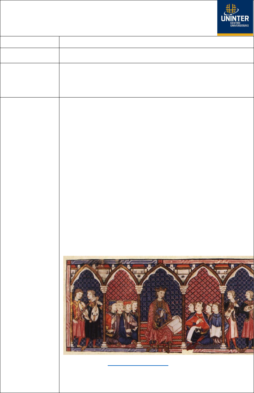 1 ESTUDO DE CASO MÓDULO/FASE Módulo C – Fase II (2018) DISCIPLINAS História Moderna História Contemporânea TEMA Tema: Medieval X Moderno PROBLEMA Quando estudamos o período de transição entre a Idade Média e a Modernidade, ou seja, os séculos XIV e XV, na sociedade do Ocidente europeu, observamos diversas transformações ocorrendo do ponto de vista político, econômico e cultural. Com o ambiente artístico não foi diferente. Verificamos alterações nos padrões estéticos, especialmente no modo como os homens e as mulheres eram representados. Como identificamos essas alterações? Vamos realizar uma análise comparativa entre duas imagens, uma medieval e outra moderna, para debatermos essas transformações, indicando seus elementos. A primeira imagem é relacionada ao Medievo. Trata-se de uma iluminura, do século XIII, presente na obra “Cantigas de Santa Maria”. O tema é: o rei Afonso X e sua corte. Disponível em: https://goo.gl/asZsJ8 Acesso em 30 de ago. de 2017. 2 A segunda representação, da Modernidade, é a obra “A Escola de Atenas”, (1509), pintura pertencente ao artista Rafael Sanzio (1483-1520). Disponível em: https://goo.gl/AVKgij Acesso em 30 de ago. de 2017. Em relação ao contexto de produção da imagem medieval, as seguintes leituras são aqui recomendadas, visando a compreensão do período histórico: Ana Carolina Almeida, “Pensando o fim da Idade Média: a longa Idade Média de Le Goff e a colonização da América de Baschet”; e Umbelina Scandolara Boleta, “O nascimento do comércio e o ressurgimento das cidades na Idade Média produzindo uma nova forma do pensar”. Em relação contexto de produção da imagem moderna, a seguinte leitura é recomendada, visando a compreensão do período histórico: Sandra Regina Franchi Rubim e Terezinha Oliveira, “A relação entre a arte e poder no Renascimento”. Sugere-se também o vídeo (com link nas referências) “Arte Medieval e Renascentista – Parte 1”. Para nossa análise comparativa, devemos inicialmente explorar os diversos elementos presentes em cada uma das imagens. Por exemplo, identificar os personagens e lugares representados, as formas de representação, o uso de linhas geométricas ou não, dentre outros aspectos. Ao mesmo tempo, devemos compreender os diferentes contextos de produção de cada uma das imagens. 3 Por fim, precisamos refletir sobre as aproximações e os afastamentos que identificamos, avaliando como se deu o movimento de transformações na arte entre os períodos Medieval e Moderno. QUESTÃO ORIENTADORA 1) Sobre a primeira imagemmedieval, vejamos as seguintes questões. Que personagem surge no centro da representação? Como os demais personagens surgem na cena? O que eles estão fazendo? As figuras humanas são realísticas? Quais padrões geométricos identificamos na construção do cenário? Observamos na imagem alguma herança da arte clássica, nos arcos e nas colunas? Como foi o uso das cores nas diferentes partes da imagem? 2) A partir dos elementos da primeira imagem e sua análise o que podemos depreender a respeito da política, cultura e sociedade medieval? 3) Sobre a segunda imagem, moderna, vejamos as seguintes questões. Onde estão, e como os personagens são representados? O que eles estão fazendo? A imagem é mais figurativa ou realista? Como ocorre o uso dos elementos geométricos e das proporções? Observamos alguma herança da tradição clássica ali? 4) A partir dos elementos da segunda imagem e sua análise o que podemos depreender a respeito da política, cultura e sociedade moderna? 5) Na relação entre as duas imagens, quais são as aproximações e os afastamentos que podemos verificar? De que modo as várias transformações na estética e nos tipos/temáticas de representações colaboram para nossa análise e compreensão da transição entre o Medievo e a Modernidade? *Responda a questões em uma única resposta-texto. 4 REFERENCIAL TEÓRICO 1) Artigo: ALMEIDA, A. C. L. “Pensando o fim da Idade Média: a longa Idade Média de Le Goff e a colonização da América de Baschet”. Revista tempo de conquista., v. 7, p. 1 – 15, 2010. Disponível em: http://revistatempodeconquista.com.br/documents/RTC7/ ANACAROLINAALMEIDA.pdf Acesso em: 26 set. 2018. 2) Artigo: BOLETA, U. S. “O nascimento do comércio e o ressurgimento das cidades na Idade Média produzindo uma nova forma do pensar”. VI Jornada de Estudos Antigos e Medievais da UEM, 2007, p.1-16. Disponível em: http://www.ppe.uem.br/jeam/anais/2007/trabalhos/007.pd f Acesso em: 26 set. 2018. 3) Artigo: RUBIM, S.R.F.; OLIVEIRA, T. “A relação entre a arte e poder no Renascimento”. Jornada de Estudos Antigos e Medievais da UEM, 2012, p.1-15. Disponível em: http://www.ppe.uem.br/jeam/anais/2012/pdf/r- z/41.pdf Acesso em: 26 set. 2018. 4) Vídeo: “Arte Medieval e Renascentista – Parte 1”. Disponível em: https://www.youtube.com/watch?v=X- az2ijSqAg Acesso em: 26 set. 2018.