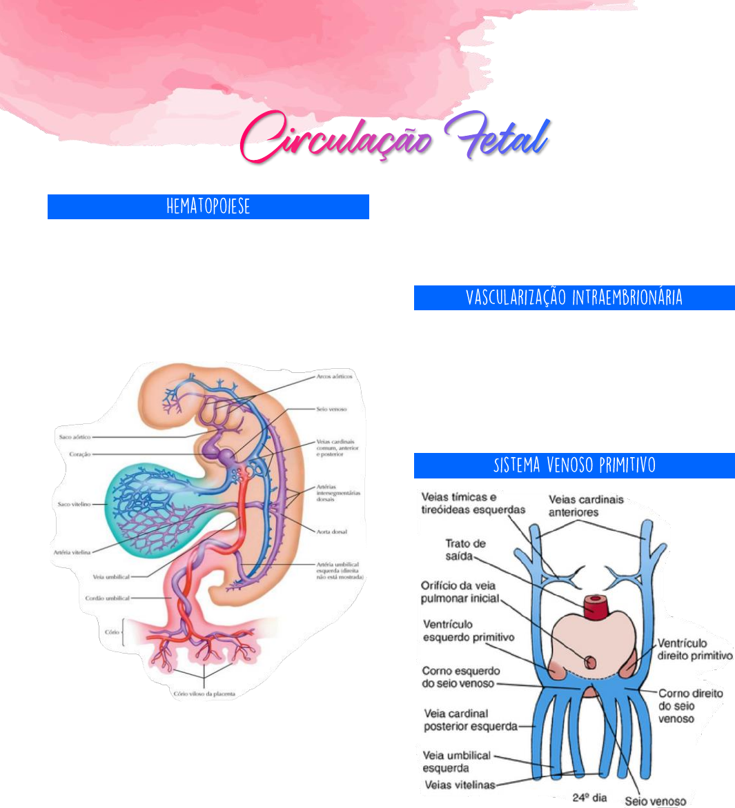 Leonardo Vinícius Ribeiro Moreira BBPM III - Embriologia A primeira evidência da formação de sangue e vasos sanguíneos ocorre no mesoderma do saco vitelino (17° dia) com um grupamento de células denominados hemangioblastos, que são progenitores hematopoiéticos e endoteliais. A primeira colonização hepática diz respeito ao fornecimento de eritrócitos primitivos nucleados, contendo hemoglobina embrionária, oriundos do saco vitelino. Já a segunda colonização hepática se dá por meio de células-tronco hematopoiéticas definitivas, ou seja, eritrócitos, células mieloides e linfoides que se originam da Região Aorta-Gônada- Mesonefro (AGM) por volta do 27º dia, desaparecendo aos 40 dias de desenvolvimento. O sítio definitivo da hematopoiese adulta se dá pela colonização por células-tronco hematopoiéticas definitivas, por volta da 10 -11° semana. A formação de vasos no interior do corpo do embrião ocorre no mesoderma esplâcnico e não está associada a hematopoiese, com exceção da região AGM. Os vasos sanguíneos são expandidos e remodelados por angiogênese. Cada um dos cornos do seio venoso recebe três diferentes veias, formando o sistema venoso primitivo: Veias cardinais comuns (D e E): formadas pela união das veias cardinais anteriores e posteriores. Essas veias drenam a cabeça, pescoço, parede corporal e parte inferior do corpo; Leonardo Vinícius Ribeiro Moreira BBPM III - Embriologia Veias umbilicais (D e E): carrega sangue oxigenado da placenta para o embrião/feto; Veias vitelinas (D e E): drenam o TGI e derivados no intestino. OBS: o sistema venoso é simétrico bilateralmente e convergem para os cornos do seio venoso. O deslocamento do retorno venoso sistêmico para o átrio direito, durante o desenvolvimento, causa uma remodelação neste sistema. A veia vitelina esquerda involui e a direita se mantém ligada com o seio venoso. Além disso, a veia vitelina D começa a ter intima associação com o fígado em desenvolvimento. Dessa forma, o sistema vitelino pode ser resumido em: Veia vitelina esquerda: involui; Veia vitelina direita forma: Porção terminal da veia cava inferior; Sinusoides hepáticos; Ducto venoso; Veia porta; Veias que drenam o esôfago; Veias que drenam o estômago; Veias que drenam o intestino. Ou seja, além de formar parte da veia cava inferior, a veia vitelina D faz parte do sistema porta e drena todo o TGI. Durante o desenvolvimento da vasculatura, as veias umbilicais também sofrem rearranjo. As duas veias umbilicais perdem a conexão com o seio venoso, no entanto, enquanto a veia umbilical D sofre involução, a veia umbilical E passa a ser a única a levar sangue oxigenado, sofrendo uma anastomose com o ducto venoso. Veia umbilical direita: involui; Veia umbilical esquerda: anastomose com o ducto venoso, garantindo a oxigenação do feto. As veias cardinais anteriores, antes, drenavam o sangue para os cornos do seio venoso, através das veias cardinais comuns D e E. No entanto, a veia cardinal anterior E perde o contato com o seio venoso e sua porção distal sofre anastomose com a veia cardinal anterior direita, formando a veia braquicefálica esquerda. As regiões craniais das veias cardinais anteriores dão origem as veias jugulares internas e externas. Leonardo Vinícius Ribeiro Moreira BBPM III - Embriologia A porção proximal da veia cardinal anterior direita forma a veia cava superior (juntamente com a veia cardinal comum direita. De forma resumida, pode-se dizer que: Porções caudal da veia cardinal anterior direita, junto com a veia cardinal comum direita formam a veia cava superior; Porções craniais das veias cardinais anteriores formam as veias jugulares; Porção caudal da veia cardinal anterior esquerda perde conexão com seio venoso e se conecta com a veia cardinal anterior direita através da veia braqueacefálica esquerda. Esse sistema surge por meio do brotamento de veias subcardinais E e D da base das veias cardinais posteriores. A veia subcardinal D se funde com a veia cava inferior em formação, enquanto a veia subcardinal E involui em sua porção cranial. Acontece uma anastomose da veia subcardinal direita com a parte vitelina da veia cava inferior. Em suas porções mais distais, as veias subcardinais formam: Veias renais; Veias suprarrenais; Veias gonadais. Assim como as veias subcardinais, um par de veias supracardinais também brotam a partir das veias cardinais posteriores. A veia supracardinal direita se anastomosa com a veia cava inferior em formação. Leonardo Vinícius Ribeiro Moreira BBPM III - Embriologia Na região abdominal, a veia supracardinal direita forma o segmento da veia cava inferior (após a porção derivada da veia subcardinal direita). Já na região torácica, as veias supracardinais formam as veias intercostais e as veias ázigos. A porção caudal da veia cardinal posterior direita forma parte da veia cava inferior. As porções caudais das veias cardinais posteriores formam as veias ilíacas comuns, assim como as internas e externas. Com isso, pode-se afirmar que a veia cava inferior é formada por quatro porções embriologicamente distintas, sendo: Segmento vitelino; Segmento subcardinal; Segmento supracardinal; Segmento cardinal. As artérias dos arcos faríngeos são responsáveis por formar importantes estruturas da cabeça e do pescoço. São compostas por 5 pares, não presentes simultaneamente. O primeiro par de artérias dos arcos faríngeos dá origem as artérias maxilares (orelhas, dentes e músculos dos olhos e da face). O segundo par de artérias dos arcos faríngeos origina as artérias estapédicas, pequenos vasos que no embrião irrigam o estribo. O terceiro par de artérias dos arcos faríngeos, por sua vez, forma as artérias carótidas comuns, internas e externas, promovendo a irrigação da cabeça. Já o quarto par de artérias dos arcos faríngeos originam o arco aórtico e a parte proximal da aorta descente, além da artéria subclávi