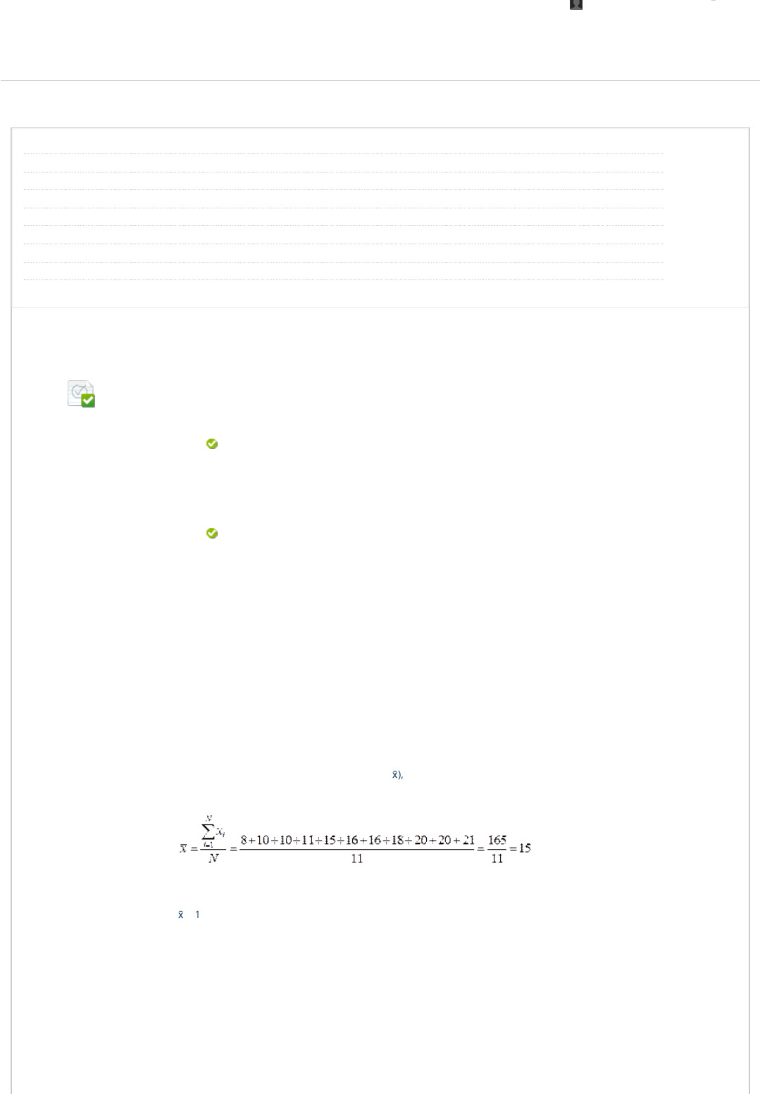 Revisar envio do teste: QUESTIONÁRIO UNIDADE IIESTATÍSTICA 3066-60_57501_R_E1_20231_02 CONTEÚDO Usuário GLAUCO KELSON PEREIRA ROCHA Curso ESTATÍSTICA Teste QUESTIONÁRIO UNIDADE II Iniciado 14/03/23 19:06 Enviado 14/03/23 19:49 Status Completada Resultado da tentativa 2,5 em 2,5 pontos Tempo decorrido 43 minutos Resultados exibidos Todas as respostas, Respostas enviadas, Respostas corretas, Comentários, Perguntas respondidas incorretamente Pergunta 1 Resposta Selecionada: c. Respostas: a. b. c. d. e. Feedback da resposta: (FGV/2022) A seguinte amostra de número de anos de estudo de adultos foi observada: 10, 18, 11, 15, 20, 21, 16, 10, 8, 20, 16. Nesse caso, é correto a�rmar, a respeito das principais medidas de tendência central desse conjunto, que: O valor da mediana é uma unidade maior do que o da média. O valor da média é igual ao da mediana. A mediana é igual a 15. O valor da mediana é uma unidade maior do que o da média. O valor da média é maior do que o da mediana. Se uma nova medida, igual a 22, for incorporada à amostra, os valores da média e da mediana permanecerão iguais. Resposta: c Comentário: num primeiro momento, vamos organizar os 11 dados da amostra em rol. Vamos colocá-los em ordem crescente. 8, 10, 10, 11, 15, 16, 16, 18, 20, 20, 21. Como temos uma amostra formada por um número ímpar de elementos, para encontrarmos a mediana (Md), basta identi�carmos o elemento central do rol. Esse elemento é o elemento 16 (note que há 5 elementos à esquerda dele, e 5 elementos à direita dele). 8, 10, 10, 11, 15, 16, 16, 18, 20, 20, 21. Para calcular a média aritmética da amostra (x)̄, vamos somar todos os valores xi entre si e dividir o somatório pelo número de elementos somados (N = 11). O cálculo é apresentado a seguir. Em resumo, encontramos os dados a seguir. Md = 16 anos x ̄= 15 anos Logo, o valor da mediana é uma unidade maior do que o da média. Pergunta 2 CONTEÚDOS ACADÊMICOS BIBLIOTECAS MURAL DO ALUNO TUTORIAIS GLAUCO ROCHA UNIP EAD 0,25 em 0,25 pontos 0,25 em 0,25 pontos http://company.blackboard.com/ https://ava.ead.unip.br/webapps/blackboard/execute/courseMain?course_id=_281769_1 https://ava.ead.unip.br/webapps/blackboard/content/listContent.jsp?course_id=_281769_1&content_id=_3341720_1&mode=reset https://ava.ead.unip.br/webapps/portal/execute/tabs/tabAction?tab_tab_group_id=_25_1 https://ava.ead.unip.br/webapps/portal/execute/tabs/tabAction?tab_tab_group_id=_27_1 https://ava.ead.unip.br/webapps/portal/execute/tabs/tabAction?tab_tab_group_id=_47_1 https://ava.ead.unip.br/webapps/portal/execute/tabs/tabAction?tab_tab_group_id=_29_1 https://ava.ead.unip.br/webapps/portal/execute/tabs/tabAction?tab_tab_group_id=_10_1 https://ava.ead.unip.br/webapps/login/?action=logout Resposta Selecionada: c. Respostas: a. b. c. d. e. Feedback da resposta: (FGV/2022) Uma amostra de idades de usuários de determinado serviço forneceu os seguintes dados: 23; 34; 30; 22; 34; 53; 34; 28; 30; 22. A soma dos valores da média, da moda e da mediana desses dados é igual a: 95. 93. 94. 95. 96. 97. Resposta: c Comentário: num primeiro momento, vamos organizar os 10 dados da amostra em rol. Vamos colocá-los em ordem crescente. 22, 22, 23, 28, 30, 30, 34, 34, 34, 53. Como temos uma amostra formada por um número par de elementos, para encontrarmos a mediana (Md), basta identi�carmos os dois elementos centrais do rol e, em seguida, calcular a média aritmética entre eles. Os dois elementos centrais são 30 e 30 (note que há 4 elementos à esquerda deles, e 4 elementos à direita deles). 22, 22, 23, 28, 30, 30, 34, 34, 34, 53. Para calcular a média aritmética da amostra (x)̄, vamos somar todos os valores xi entre si e dividir o somatório pelo número de elementos somados (N = 10). O cálculo é apresentado a seguir. Para encontrarmos a moda (Mo) da amostra, basta identi�carmos qual valor se repetiu com maior frequência no conjunto de dados. Esse valor é o 34, já que ele aparece três vezes. 22, 22, 23, 28, 30, 30, 34, 34, 34, 53. Em resumo, temos os seguintes dados a respeito da idade dos usuários do serviço: Md = 30 anos x ̄= 31 anos Mo = 34 anos A soma entre esses valores é calculada a seguir. Pergunta 3 Resposta Selecionada: d. Respostas: a. b. c. d. e. Feedback da resposta: (FUNDATEC/2021) A movimentação econômica de um município é calculada pela média ponderada. Considere o agronegócio com peso 4, a indústria com peso 3 e os serviços com peso 3. Se em determinado mês essas respectivas áreas registraram transações nos valores de R$ 30.000,00, R$ 50.000,00 e R$ 25.000,00, então a média ponderada dessa movimentação econômica é: R$ 34.500,00. R$ 35.000,00. R$ 34.700,00. R$ 34.600,00. R$ 34.500,00. R$ 34.200,00. Resposta: d Comentário: a média ponderada é calculada de modo que cada dado xi é multiplicado por seu peso pi. Se temos N medidas xi, cada uma associada a um peso pi, a média ponderada é calculada por: 0,25 em 0,25 pontos Considerando os dados do enunciado, temos o cálculo a seguir. Logo, a média ponderada dessa movimentação econômica é R$ 34.500,00. Pergunta 4 Resposta Selecionada: b. Respostas: a. b. c. d. e. Feedback da resposta: (IBFC/2018 - adaptada) Uma rede de lojas fez um levantamento da quantidade de queixas apresentadas por seus clientes ao longo de uma semana, nas 16 lojas da rede em uma região. O resultado é apresentado no grá�co abaixo. Com base no grá�co, assinale a alternativa correta. A moda na distribuição de queixas por loja é menor do que a média. A moda na distribuição de queixas por loja é igual a 4 queixas por loja. A moda na distribuição de queixas por loja é menor do que a média. A média de queixas por loja foi inferior a 3. O total de queixas ao longo da semana, somando-se todas as lojas, foi menor que 50. Não é possível calcular a média de queixas por loja. Resposta: b Comentário: a moda da distribuição é de 2 queixas dos consumidores por loja, já q