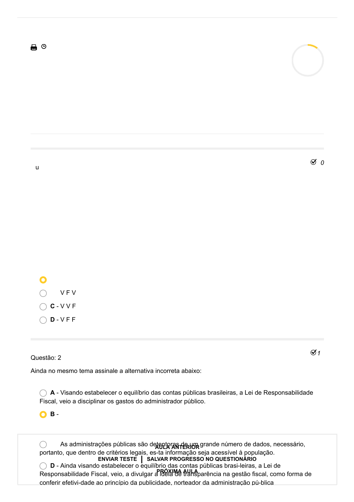 01/09/2020 Course Status – Facuminas https://ava.facuminasead.com.br/course-status/ 1/3 2 HORAS Progresso:5/10 DIREITO AVALIAÇÃO – ADMINISTRATIVO E NOVAS TECNOLOGIAS 107:18 10 10 Questão: 1 Julgue as questões de 1 a 4 abaixo como verdadeiras ou falsas com base nos conhecimentos sobre os assuntos: 1) Diante da pluralidade de significados do termo “tecnologia”, as “novas tecnologias” podem ser compreendidas de duas maneiras: ( ) como novas teses jurídicas recém elaboradas. ( ) como conjunto de novas técnicas de transformação da realidade, aproximando-se do conceito mais restrito de tecnologia. ( ) como o conjunto de ciências de desenvolvi- mento de novas técnicas. A - F V V B - V F V C - V V F D - V F F Questão: 2 Ainda no mesmo tema assinale a alternativa incorreta abaixo: A - Visando estabelecer o equilíbrio das contas públicas brasileiras, a Lei de Responsabilidade Fiscal, veio a disciplinar os gastos do administrador público. B - Para que o sistema seja perfeito deve ser liberado de forma irres-trita todo e qualquer dado de posse do sistema administrativo, já que o cidadão tem o direito de saber de tudo que se passa dentro da administração pública. C - As administrações públicas são detentoras de um grande número de dados, necessário, portanto, que dentro de critérios legais, es-ta informação seja acessível à população. D - Ainda visando estabelecer o equilíbrio das contas públicas brasi-leiras, a Lei de Responsabilidade Fiscal, veio, a divulgar a ideia de transparência na gestão fiscal, como forma de conferir efetivi-dade ao princípio da publicidade, norteador da administração pú-blica AULA ANTERIOR ENVIAR TESTE SALVAR PROGRESSO NO QUESTIONÁRIO PRÓXIMA AULA 01/09/2020 Course Status – Facuminas https://ava.facuminasead.com.br/course-status/ 2/3 10 10 10 p p p , ç p Questão: 3 Sobre a transparência nos tempos de tecnologia e estado assinale a alternativa incorreta abaixo: A - A experiência de direito comparado aponta no sentido de que os países com informação mais transparente são os que apresentam maiores índices de corrupção. B - A Lei de Responsabilidade Fiscal se pauta pela transparência como norteadora do direito financeiro. C - Um dos grandes objetivos das democracias da atualidade é pos-sibilitar uma rede de comunicação direta entre a administração e os administrados que resulte em um aprofundamento democráti-co e em uma maior transparência e eficiência da atividade admi-nistrativa. D - A ideia de transparência possui a importante função de fornecer subsídios para o debate acerca das finanças públicas, o que permite uma maior fiscalização das contas públicas por parte da sociedade. A busca pela transparência é a busca pela legitimida-de. Questão: 4 Acerca das tecnologias de comunicação pode se destacar: A) ( ) As tecnologias de comunicação, propriamente ditas, dão a base informacional para que os nódulos de cada uma das redes funcionem adequadamente a despeito de suas distâncias territoriais. B) ( ) Em um estado de direito do século XXI não se pode falar em um fluxo harmônico informações se a ajuda das tecnologias de comunicações. C) ( ) resta evidente que as novas tecnologias estão umbilicalmente vinculadas a transformações sociais profundas. A - F V V. B - V F F. C - V V V. D - V V F. Questão: 5 2) Para o estudo aqui desenvolvido mostra-se conveniente examinar as novas tecnologias apenas conforme os diferentes aspectos da realidade que elas abrangem. Nesse sentido, são dignas de menção: ( ) As novas tecnologias de saúde. ( ) As novas tecnologias de produção. ( ) As novas tecnologias de comunicação. A - V F V. AULA ANTERIOR ENVIAR TESTE SALVAR PROGRESSO NO QUESTIONÁRIO PRÓXIMA AULA 01/09/2020 Course Status – Facuminas https://ava.facuminasead.com.br/course-status/ 3/3 PÁGINAS1 2 B - V F F. C - V V F. D - V V V. AULA ANTERIOR ENVIAR TESTE SALVAR PROGRESSO NO QUESTIONÁRIO PRÓXIMA AULA