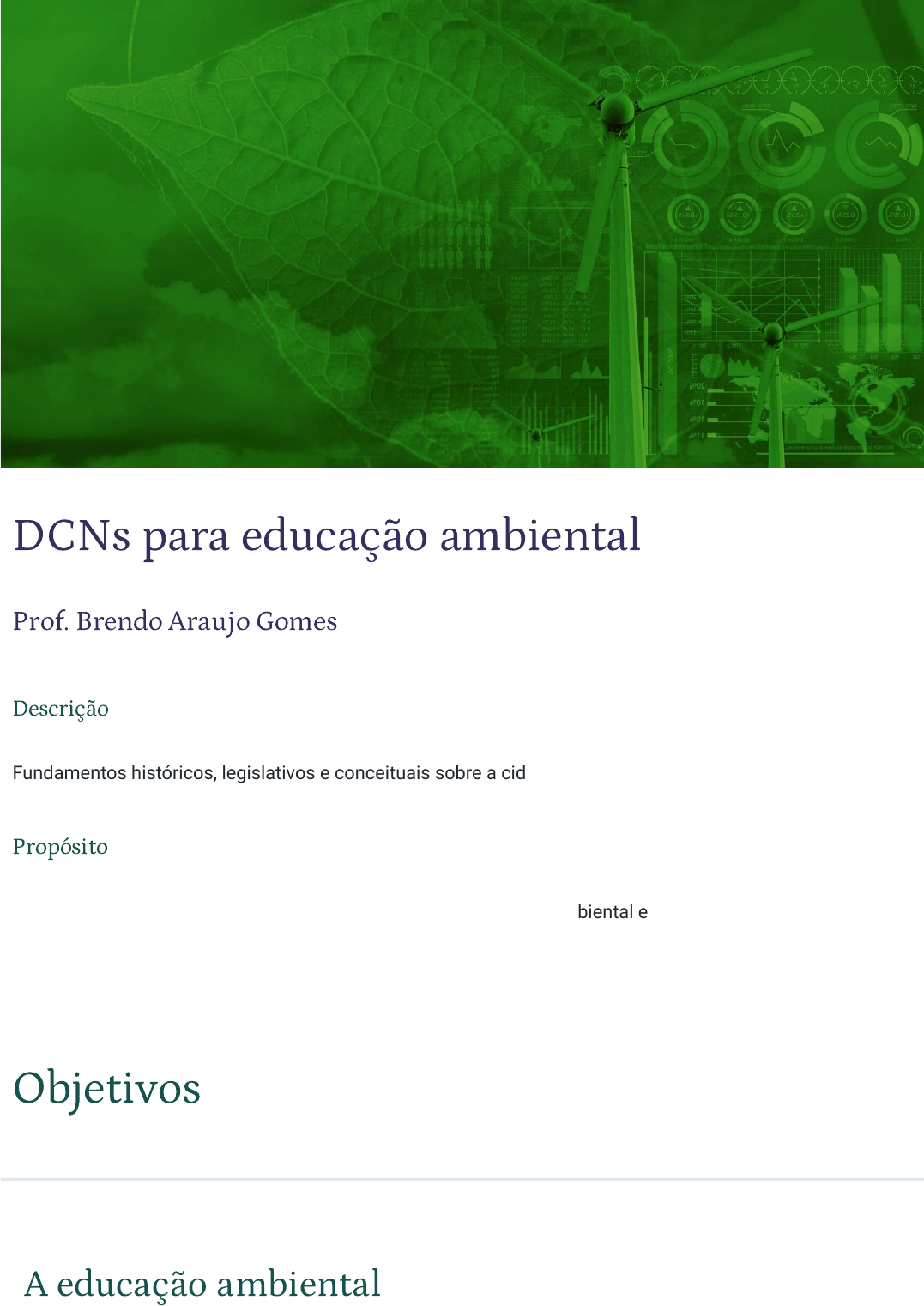 18/03/2023 21:58 DCNs para educação ambiental https://stecine.azureedge.net/repositorio/00212sa/02374/index.html# 1/48 DCNs para educação ambiental Prof. Brendo Araujo Gomes Descrição Fundamentos históricos, legislativos e conceituais sobre a cidadania e a educação ambiental. Propósito O conhecimento das principais concepções acerca da educação ambiental e o histórico referente às suas disposições legais no Brasil é primordial para a compreensão dos efeitos das ações humanas no ambiente e para o estabelecimento de ações nas práticas socioeducativas. Objetivos Módulo 1 A educação ambiental 18/03/2023 21:58 DCNs para educação ambiental https://stecine.azureedge.net/repositorio/00212sa/02374/index.html# 2/48 Descrever os principais conceitos e contextos acerca da educação ambiental. Módulo 2 A cidadania ambiental Reconhecer os principais pontos sobre a cidadania ambiental. Desde a origem da civilização, há necessidade e dependência do ser humano em relação ao ambiente. Assim, ao longo do desenvolvimento da humanidade, foram necessários o entendimento e a capacidade de desenvolver e utilizar instrumentos para modificá-lo. Com o avanço da tecnologia, o acelerado desenvolvimento industrial e a necessidade de crescimento econômico a qualquer custo, o homem tem se distanciado cada vez mais da natureza. Ou seja, ele não se vê como parte dela, como parte do meio ambiente. É urgente, então, que a humanidade esteja próxima e consciente das questões ambientais. Por conta disso, são desenvolvidas práticas de educação ambiental para permitir a formação de cidadãos conscientes e responsáveis pela conservação e preservação do meio e de todos os recursos naturais, pela sua própria sobrevivência e a das gerações futuras. Dessa forma, ao exercer a cidadania ambiental, os indivíduos possibilitam o equilíbrio ambiental, o que gera bons frutos em diversas áreas, como a social, a econômica e a ecológica. Introdução 18/03/2023 21:58 DCNs para educação ambiental https://stecine.azureedge.net/repositorio/00212sa/02374/index.html# 3/48 1 - A educação ambiental Ao �nal deste módulo, você será capaz de descrever os principais conceitos e contextos acerca da educação ambiental. Introdução à educação ambiental A educação ambiental surgiu da necessidade de uma mudança brusca nos modelos adotados pela sociedade que envolvem aspectos sociais, econômicos e científicos. As problemáticas relacionadas a esses aspectos, tais como a alta taxa de urbanização ligada ao crescimento populacional exponencial, o comodismo e a praticidade do dia a dia resultantes do desenvolvimento de tecnologias, forçaram a humanidade a refletir sobre a educação ambiental. Quando observamos o cenário atual do nosso meio ambiente e de nossas relações com ele, conseguimos perceber que algo está desbalanceado, não?! Uma vez que essas relações socioambientais não estão em equilíbrio, com o aumento assustador dos desmatamentos, da erosão e da poluição, graves consequências podem vir a ocorrer para a humanidade e todos os seres vivos. 18/03/2023 21:58 DCNs para educação ambiental https://stecine.azureedge.net/repositorio/00212sa/02374/index.html# 4/48 Os desastres naturais têm se tornado frequentes devido às mudanças climáticas provocadas pelas ações do homem contra o meio ambiente. Neste módulo, conheceremos um pouco mais sobre os principais conceitos trabalhados na educação ambiental e sobre o histórico legal dessa abordagem no Brasil e no mundo. Veremos também como esse tema é trabalhado no âmbito do Ministério da Educação, por meio da Base Nacional Comum Curricular (BNCC), dos Parâmetros Curriculares Nacionais (PCNs) e das Diretrizes Curriculares Nacionais (DCNs). Vamos lá?! Principais conceitos acerca da educação ambiental A relação entre direitos humanos e meio ambiente se consolida no momento em que as políticas mundiais assumem um compromisso de conservação e preservação, garantindo um ambiente saudável e ideal para a humanidade presente e futura. Entre as medidas intrínsecas a essa relação, a educação ambiental é essencial para a conscientização sobre o mundo do qual fazemos parte e necessitamos. Costumamos ouvir essas duas palavras em diversos meios de comunicação e escolas, mas o que seria educação ambiental ao certo? De acordo com o primeiro artigo da Lei nº 9795, publicada em 1999, a educação ambiental abrange processos por meio dos quais o indivíduo e a coletividade constroem valores sociais, conhecimentos, habilidades, atitudes e competências voltadas para a conservação do meio ambiente, bem de uso comum do povo, essencial à sadia qualidade de vida e sua sustentabilidade. 18/03/2023 21:58 DCNs para educação ambiental https://stecine.azureedge.net/repositorio/00212sa/02374/index.html# 5/48 Percebe-se que esse tema compreende conceitos de cunho social e biológico. O principal conceito é a educação, que se baseia na ideia de que os seres humanos apresentam um potencial que deve ser desenvolvido no decorrer da vida. Assim, o educador seria o responsável por criar condições para que esse desenvolvimento ocorra, estimulando as pessoas a crescerem. Esse conceito, então, é especificado na segunda palavra que o acompanha: ambiental. E o que é o meio ambiente? Conforme Sánchez (2015, p.18), ambiente pode ser um conceito amplo, pois inclui a natureza e a sociedade; multifacetado, pois existem diferentes formas de compreendê-lo; e maleável, já que pode ser reduzido ou ampliado de acordo com quem fala sobre ele. Segundo a Lei nº 6.938 de 1981, o meio ambiente é o conjunto de condições, leis, influências e interações (de ordem física, química e biológica) que permite, abriga e rege a vida em todas as suas formas. Dessa maneira, podemos também conceituar a educação ambiental como um ramo da educação cujo objetivo não é apenas um modelo de transmissão de conhecime