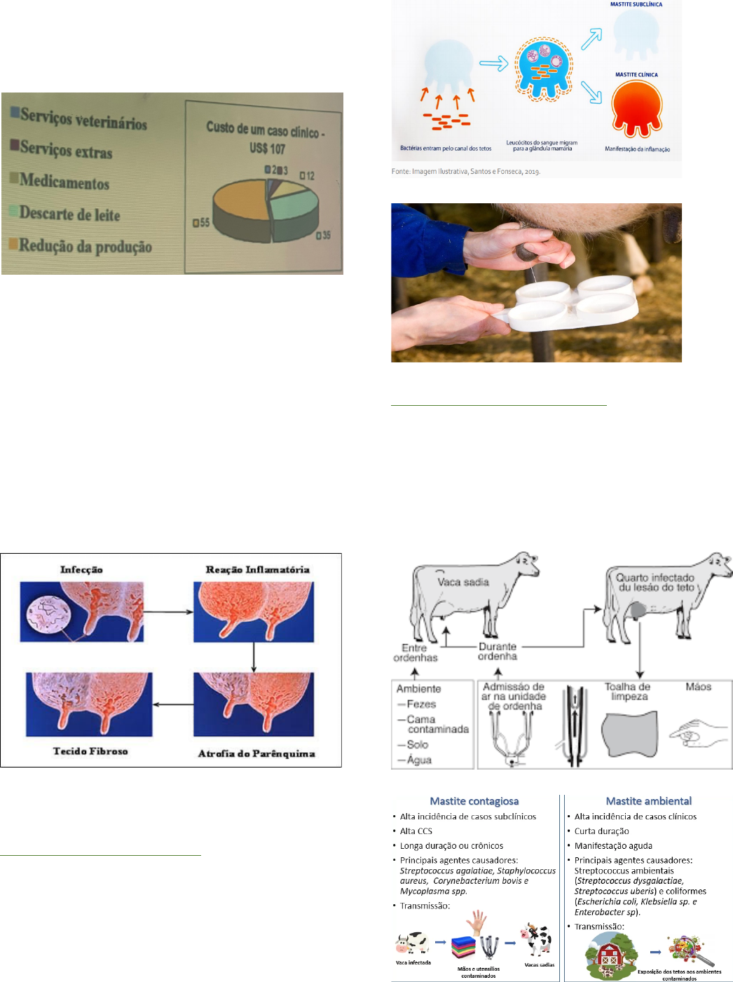 Definição • Inflamação da glândula mamaria, de origem plurietiológica e multifatorial Importância • Prejuízos • Produção • Sanidade Obs.: na prática não ocorre; devido as perdas econômicas o leite é destinado a locais onde não possui inspeção Saúde publica • Veículo de toxinas Þ Toxinas bacterianas são altamente resistentes a altas temperaturas • Brucelose • Tuberculose • Listeriose • Leptospirose • Outras infecções Epidemiologia Classificação das mastites: Quanto a forma de manifestação • Clínica • Subclínica = ocorre mais • Para cada caso de mastite clínica, possuem 25 casos de mastite subclínica • Teste da caneca – para diagnósticar mastite clínica • Teste de WMT ou CMT = para diagnósticar mastite subclínica Teste CMT Quanto ao tipo de agente causador • Ambiental Þ Ocorre entre as ordenhas Þ Ex.: após a ordenha “esfregar” o teto no chão • Contagiosa Þ Ocorre no momento da ordenha Mastite CCS = contagem de células somáticas • Célula somática = responsáveis pela formação de tecidos e órgãos em organismos multicelulares Agentes ambientais Bacterianas • Escherichia coli • Enterobacter aerogenes • Klebsiella pneumoniae • Salmonella sp. • Pseudomonas aeruginosa • Nocardia sp. • Clostridium perfringens = Þ Associadas a mastites que alteram muito a glândula mamaria Þ Produção de toxinas Fungos ou algas Obs.: geralmente os animais estão condenados • Cândida albicans • Cryptococcus sp. • Aspergillus sp. • Prototheca sp. • Geptrichum spp. Contagiosa • Staphylococcus aureus Þ Pode causar mastite gangrenosa – putrefação do tecido morto • Streptococcus agalactae • Corynebacterium bovis • Mycoplasma sp. Mastite de verão = extremamente contagiosa • Associada a moscas Inspeção da glândula mamária Antibióticos menos resistentes para tratar mastite • Vancomicina • Norfloxacina • Enrofloxacina • Tetraciclina • Novobiocina • Cloranfenicol • Sulfa + trimetoprim • O ideal é fazer a análise do leite para ter um antibiograma e usar o antibiótico ideal Fatores de risco • Idade da vaca • Produção de leite • Estágio e número de lactações • Conformação do úbere e tetas • Dieta e estresse térmico • Instalações • Época do ano Patogenia • Infecção => lesão => reação inflamatória => alteração do pH do leite => descamação epitelial Diagnóstico Direto • Inspeção direta Þ Avaliação de inspeção Þ Conformidade dos tetos, presença de nódulos, ulceração, tamanho anormal, coloração Þ Características do leite (pus, aquoso, coloração etc.) Þ Limpeza do teto => descarte dos 2 ou 3 primeiros jatos de leite (na caneca para não contaminar o chão) => colocar no tubo e identificar (4º mamário, nome) => enviar para laboratório – cultivo em ágar sangue • Teste de caneca • Microbiológico Indireto • CMT Þ Utiliza-se detergente que reage com o leite • CCS Þ Pode haver contagem eletrônica Þ Caprinos e ovinos > 1.000.000 de células = alteração Þ Bovinos > 200.000 células = alteração • WMT – pouco utilizado Profilaxia Administração de antimicrobianos por via intramamária ou sistêmica • Mastite clínica • Tratamento vacas cheias Þ 1 = ordenha completa Þ 2 = aplicação do antimicrobiano (via intramamária) Þ 3 = 3 a 5 aplicações com intervalos de 8, 12 e 24h • Associar terapêutica sistêmica • Respeitar o período de carência Þ Intramamária Þ Parental • Tratamento vaca seca Þ 1 = ordenha completa Þ 2 = aplicação antimicrobiano (via intramamária) Þ 3 = 1 aplicação • Pré e pós dipping • Lugol ou Iodo a 0,5% 100ml no quarto mamário afetado por 2 dias seguidos – esse quarto mamário nunca mais vai dar leite • Identificar a frequência dos casos clínicos e subclínicos • Segregação e tratamento dos animais com mastite clínica • Desinfecção das ordenhadeiras • Linhas de ordenha