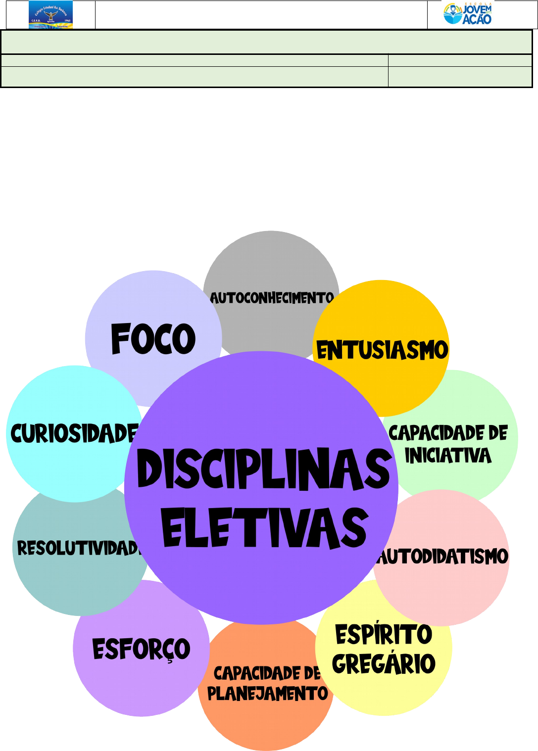 Col. Est. Rui Barbosa Araguaína – Tocantins PLANO DE AULA MENSAL PERÍODO: 14 DE FEVEREIRO A 14 DE MARÇO DE 2022 PARTE DIVERSIFICADA: ELETIVA TURMA: PROFESSORAS: Jakeline de Souza BIMESTRE: 1º DISCIPLINAS ELETIVAS Afinal de contas, o que são as Disciplinas Eletivas? São disciplinas temáticas, oferecidas semestralmente, propostas pelos professores e/ou pelos estudantes e objetivam diversificar, aprofundar e/ou enriquecer os conteúdos e temas trabalhados nas disciplinas da Base Nacional Comum do currículo. COMPETÊNCIAS TRABALHADAS NAS DISCIPLINAS ELETIVAS DINÂMICA O QUE É E O QUE NÃO É ELETIVA O QUE É? • Proposição de desafios ao alcance dos estudantes. • Possui temáticas de estudo que dialogam com os resultados assumidos pela escola. • Explora a liberdade metodológica de ensino dos professores – Inovação. • Espaço de estímulo à ampliação de ideias, experimentação e desenvolvimento de projetos. • O professor, assim como os estudantes, torna-se pesquisador. • Espaço de práticas pedagógicas interdisciplinares. O QUE, NÃO É? • Espaço de continuidade dos trabalhos já desenvolvidos em sala de aula. • Ambiente individualizado de aprendizagem ou fechado em pequenos grupos. • Desenvolvimento dos conteúdos de forma descontextualizada das demais áreas de conhecimento. • Metodologia de ensino sem correspondência com as necessidades dos estudantes. SEMANA 1 PARTE DIVERSIFICADA: ELETIVA TURMA: _____ PROFESSORAS: Jakeline de souza BIMESTRE: 1º ALUNO(A): Atividade 1. 1. Preencha o quadro a seguir destacando as principais competências trabalhadas nas eletivas, e faça uma breve descrição sobre o que você entende sobre cada competência e como ela pode te ajudar no seu projeto de vida. Seu Projeto de Vida:__________________________________________________________________________ Atividade 2 1. Diante do que foi apresentado preencha os quadros abaixo especificando o que e o que não é eletiva. O QUE É? • Proposição de desafios ao alcance dos estudantes. • Possui temáticas de estudo que dialogam com os resultados assumidos pela escola. • Explora a liberdade metodológica de ensino dos professores – Inovação. • Espaço de estímulo à ampliação de ideias, experimentação e desenvolvimento de projetos. • O professor, assim como os estudantes, torna-se pesquisador. • Espaço de práticas pedagógicas interdisciplinares. O QUE, NÃO É? • Espaço de continuidade dos trabalhos já desenvolvidos em sala de aula. • Ambiente individualizado de aprendizagem ou fechado em pequenos grupos. • Desenvolvimento dos conteúdos de forma descontextualizada das demais áreas de conhecimento. • SEMANA 2 PARTE DIVERSIFICADA: ELETIVA TURMA: _____ PROFESSORAS: Jakeline de souza BIMESTRE: 1º ALUNO(A): Áreas de Conhecimento/ Componentes Curriculares Área I – Linguagens, Códigos e suas Tecnologias e Redação Língua Portuguesa Redação Língua Estrangeira Moderna Arte Educação Física Área II – Matemática e suas Tecnologias Matemática Área III – Ciências Humanas e suas Tecnologias História Geografia Filosofia Sociologia Área IV – Ciências da Natureza e suas Tecnologias Biologia Física Química Quais são as 10 Competências Gerais da Base Nacional Comum Curricular? As 10 Competências Gerais da Base Nacional Comum Curricular acompanham o desenvolvimento dos alunos desde a Educação Infantil até o Ensino Médio. Vamos conhecê-las? 1. Conhecimento Valorizar e utilizar os conhecimentos historicamente construídos sobre o mundo físico, social, cultural e digital para entender e explicar a realidade, continuar aprendendo e colaborar para a construção de uma sociedade justa, democrática e inclusiva. 2. Pensamento científico, crítico e criativo Exercitar a curiosidade intelectual e recorrer à abordagem própria das ciências, incluindo a investigação, a reflexão, a análise crítica, a imaginação e a criatividade, para investigar causas, elaborar e testar hipóteses, formular e resolver problemas e criar soluções (inclusive tecnológicas) com base nos conhecimentos das diferentes áreas. 3. Repertório cultural Valorizar e fruir as diversas manifestações artísticas e culturais, das locais às mundiais, e também participar de práticas diversificadas da produção artístico-cultural. 4. Comunicação Utilizar diferentes linguagens – verbal (oral ou visual-motora, como Libras, e escrita), corporal, visual, sonora e digital –, bem como conhecimentos das linguagens artística, matemática e científica, para se expressar e partilhar informações, experiências, ideias e sentimentos em diferentes contextos, além de produzir sentidos que levem ao entendimento mútuo. 5. Cultura digital Compreender, utilizar e criar tecnologias digitais de informação e comunicação de forma crítica, significativa, reflexiva e ética nas diversas práticas sociais (incluindo as escolares) para se comunicar, acessar e disseminar informações, produzir conhecimentos, resolver problemas e exercer protagonismo e autoria na vida pessoal e coletiva. 6. Trabalho e projeto de vida Valorizar a diversidade de saberes e vivências culturais, apropriar-se de conhecimentos e experiências que lhe possibilitem entender as relações próprias do mundo do trabalho e fazer escolhas alinhadas ao exercício da cidadania e ao seu projeto de vida, com liberdade, autonomia, consciência crítica e responsabilidade. 7. Argumentação Argumentar com base em fatos, dados e informações confiáveis, para formular, negociar e defender ideias, pontos de vista e decisões comuns que respeitem e promovam os direitos humanos, a consciência socioambiental e o consumo responsável em âmbito local, regional e global, com posicionamento ético em relação ao cuidado de si mesmo, dos outros e do planeta. 8. Autoconhecimento e autocuidado Conhecer-se, apreciar-se e cuidar de sua saúde física e emocional, compreendendo- se na diversidade huma