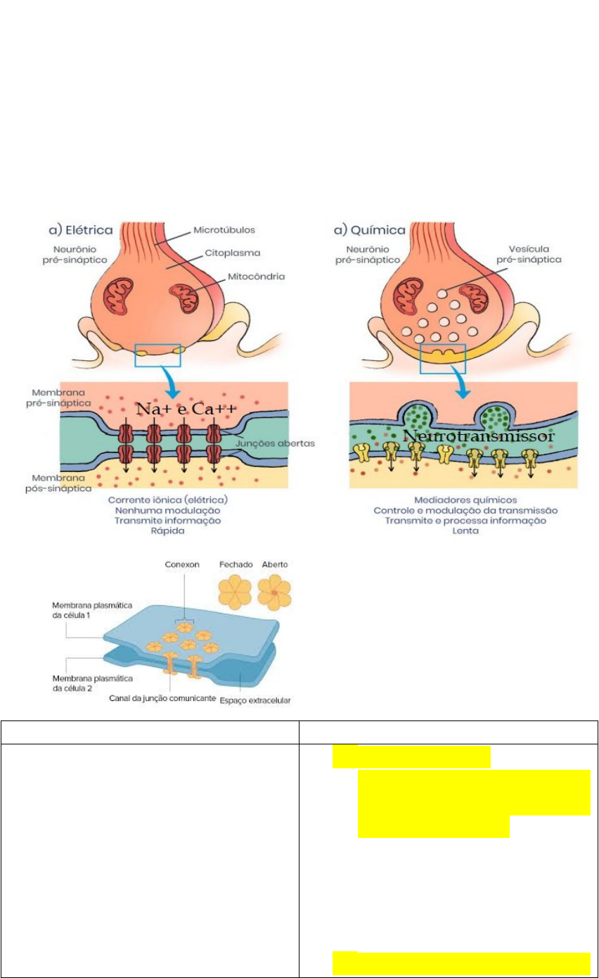 SINAPSE As informações elétricas contidas no neurônio, não são restritas apenas a ele, mas são transmitidas para uma outra célula. Essa região de comunicação ou contato de um neurônio com uma outra célula é chamada de sinapse. A informação pode ser transmitida eletricamente (sinapse elétrica) ou quimicamente (sinapse química). Sinapse elétrica Sinapse química · São menos abundantes · A transmissão elétrica entre neurônios é mediada por junções comunicantes (junções gap) que permitem a passagem direta de íons (Na+ e Ca++...). · O caminho do impulso elétrico é bidirecional · A velocidade é rápida · Não sofre modulação · Mais abundantes · A transmissão é feita por um mediador químico – Neurotransmissor que é lançado na fenda sináptica pela célula pré-sináptica. A célula pós-sináptica pode ser um neurônio, músculo ou glândula. · O caminho do impulso é unidirecional. · A velocidade é mais lenta · Sofre modulação (somação ou integração dos potenciais pós-sinápticos) SINAPSE QUÍMICA https://www.youtube.com/watch?v=1r-A9RpbIr8&t=92s https://www.youtube.com/watch?v=Kn5YajvxA2w&t=9s A sinapse química acontece através da ação de um mediador químico, os neurotransmissores (NT). Os NT são produzidos pelos neurônios e estão armazenados em vesículas sinápticas. Essas vesículas estão presentes nos terminais dos neurônios pré-sinápticos. Na membrana desse terminal, existem os sítios de liberação de neurotransmissores, região chamada zona ativa. A liberação do NT na fenda sináptica depende da entrada de Ca++ no terminal, que é mediado pelo PA. Dê acordo com o tipo de célula o qual o neurônio pré faz a comunicação, a sinapse química pode ser classificada em três tipos: interneuronal, neuromuscular e neuroglandular. As sinapses químicas interneuronais podem ser classificadas quanto à região do neurônio pós-sináptico que irá fazer comunicação com a terminação pré-sináptica: Estruturas de uma sinapse química Papel dos Neurotransmissores, Potencial pós-sinápticos excitatórios ou inibitórios e os processos de integração ou somação desses potenciais. https://www.youtube.com/watch?v=Kn5YajvxA2w&t=2s https://www.msdmanuals.com/pt-pt/profissional/multimedia/video/v14003256_pt Quando um neurotransmissor se liga ao seu receptor, ele faz com que canais iônicos se abram ou se fecham. Isto produzir uma mudança localizada no PMR (-70). Em alguns casos, a alteração torna a célula alvo mais propensa a disparar seu próprio potencial de ação (PA). Neste caso, a mudança no potencial de membrana é chamada de potencial pós-sináptico excitatório, ou PPSE. Em outros casos, a mudança torna a célula alvo menos propensa a disparar um potencial de ação e é chamada de potencial pós-sináptico inibitório, ou PPSI. Um PPSE é despolarizante: torna o interior da célula mais positivo, trazendo o potencial de membrana mais perto de seu limiar (-40 à -55) para disparar um potencial de ação. Às vezes, um único PPSE não é grande o suficiente para trazer o neurônio ao seu limiar, mas ele pode se somar a outros PPSEs para desencadear um PA. Os PPSIs têm o efeito oposto. Ou seja, eles tendem a manter o potencial de membrana do neurônio pós-sináptico abaixo do limiar de disparo de um potencial de ação. PPSIs são importantes porque podem neutralizar, ou anular, o efeito excitatório dos PPSEs. Como PPSEs e PPSIs interagem? Basicamente, um neurônio pós-sináptico adiciona, ou integra, todas as entradas excitatórias e inibitórias que ele recebe e "decide" se dispara um potencial de ação. A integração de potenciais pós-sinápticos que ocorrem em locais diferentes, mas ao mesmo tempo, é conhecida como somatório espacial (B). A integração de potenciais pós-sinápticos que ocorrem no mesmo lugar, mas em momentos ligeiramente diferentes, é chamada de somatório temporal (A). OBS: “Os NT podem produzir uma hiperpolarização ou uma despolarização da membrana da célula pós, embora a mesma molécula possa inibir ou excitar. Isso acontece porque há um certo número de neurotransmissores, mas uma grande variedade de receptores em diferentes tipos de células.” Tipos de receptores pós-sinápticos https://pt.khanacademy.org/science/health-and-medicine/human-anatomy-and-physiology/nervous-system-introduction/v/types-of-neurotransmitter-receptors Uma vez na fenda sináptica, os neurotransmissores se ligam a receptores específicos localizados na membrana do neurônio pós-sináptico, causando uma mudança em sua permeabilidade aos íons. Existem dois tipos de receptores: canais iônicos ativados por neurotransmissores (ionotrópicos) e os acoplados a proteína G (metabotrópicos). Os receptores ionotrópicos (A) são canais iônicos ligante-dependentes que mudam sua conformação e se abrem após a ligação do neurotransmissor. Se os canais forem permeáveis ao Na+ e Ca++, o influxo desses íons promovem o PPES. Caso sejam permeáveis ao Cl- ou K+ PPSI. São rápidos na geração da resposta, mas essa é de curta duração. Canais de íons ativados por ligantes incluem os receptores nicotínicos (N) de acetilcolina, receptores de aminoácidos neurotransmissores glutamato, glicina e GABA. Os Receptores metabotrópicos (B) são mais lentos na geração da resposta, mas essa é mais duradoura. O neurotransmissor, ao se ligar a esses receptores, ativa a proteína G que desacopla e liga sua subunidade a um canal iônico, causando a sua abertura por um tempo prolongado. Além disso, segundos mensageiros podem ativar enzimas que regulam canais iônicos. Os receptores da classe acetilcolina muscarínicos (M), a maioria dos receptores de aminas biogênicas e todos os receptores de neuropeptídeos são receptores metabotrópicos Classificação dos neurotransmissores em relação à família química a qual pertencem · Aminas biogênicas: esse grupo é constituído pela acetilcolina, c