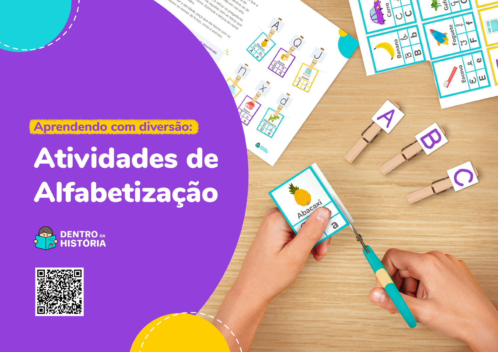 Dentro da História | Atividades de Alfabetização 2 Neste Ebook você encontrará 10 atividades que têm o objetivo de auxiliar as famílias no processo de alfabetização das crianças, estimulando a fala, a escrita e a comunicação oral. Além de contribuir para a alfabetização e aprendizado, as atividades também aproximam pais e filhos, reforçando os laços afetivos e proporcionando novas experiências em família. Este livro digital com atividades de alfabetização infantil foi desenvolvido pela Dentro da História, com o apoio da especialista em educação e desenvolvimento infantil Cláudia Onofre. Com mais de 20 anos de experiência pedagógica, ela integra nosso time de consultoria educacional e contribui para nossa missão de estimular o protagonismo das crianças por meio de aprendizados lúdicos e divertidos. Olá! Dentro da História | Atividades de Alfabetização https://www.dentrodahistoria.com.br/?utm_source=ddh&utm_medium=blog&utm_campaign=ebook-alfabetizacao Dentro da História | Atividades de Alfabetização 3 Índice • Introdução- Alfabetização infantil: O papel da escola e da família • O que a criança vai aprender • Atividades • 01. Varal do alfabeto • 02. Palavras na bexiga • 03. Bingo das palavras • 04. Roleta Silábica • 05. Consciência Silábica • 06. Formando frases • 07. Massinha de moderlar com suco • 08. Cozinhar e aprender • 09. Contação de histórias • 10. Caixa de leitura • Conheça a Dentro da História 04 25 30 33 34 36 37 39 06 07 08 15 16 20 Dentro da História | Atividades de Alfabetização 4 O processo de aprendizagem das crianças começa desde os primeiros anos de vida, mas é só ao frequentarem a escola que o aprendizado passa a ser organizado sistematicamente. O objetivo das diferentes práticas de ensino escolar é alfabetizar a criança até o período final da Educação Infantil e início do Ensino Fundamental. A alfabetização deve proporcionar o desenvolvimento da leitura, da escrita e da comunicação, estimulando a formação e expressão das ideias e pensamentos. Dessa forma, a criança estará pronta para solucionar problemas e começar sua participação na sociedade. Na próxima página, você verá como o processo de aprendizagem é trabalhado na Educação Infantil, revelando como o brincar é fundamental para o desenvolvimento das crianças, principalmente quando associado a outras competências. Alfabetização infantil: o papel da escola e da família Dentro da História | Atividades de Alfabetização 5 Brincar é fundamental Através das brincadeiras, a criança aprende e desenvolve suas próprias formas de se comunicar com o mundo. O aprendizado é potencializado quando associado com: Identificar ingredientes, descobrir cores, sabores, medidas e proporções, ler rótulos e instruções de preparo. EXPERIÊNCIAS CULINÁRIAS Danças, mímicas, atividades corporais como correr, pular e agachar. CONSCIÊNCIA COPORAL Rodas de conversa para compartilhar e desenvolver a fala. COMUNICAÇÃO EXPERIÊNCIAS SENSORIAIS Plantar, regar, colher e cultivar uma planta, manusear diferentes texturas como grãos, areia, folhas, gelatinas. IMAGINAÇÃO Contação de histórias para ouvir, ler, criar, contar, recontar histórias e estimular a criatividade. EXPERIÊNCIAS PESSOAIS Descobrir, observar, testar e criar novas possibilidades de aprendizado. Pintura, desenho, colagem, recorte e jogos. ARTES Dentro da História | Atividades de Alfabetização 6 Segundo a Unicef, com o isolamento social e as escolas fechadas durante a pandemia de Covid-19, mais de 2 milhões de crianças entre 6 e 10 anos de idade não puderam aprender a ler e a escrever. Além disso, uma pesquisa feita pelo Datafolha, revelou que as crianças que estavam em processo de alfabetização não evoluíram nos aprendizados ou desaprenderam o que sabiam. A partir desses dados, é possível concluir que a alfabetização foi a etapa de ensino mais prejudicada durante a pandemia. Além dos desafios do ensino remoto, os pequenos e pequenas que frequentam a Educação Infantil e os primeiros anos do Ensino Fundamental também tiveram a convivência com outras crianças reduzida. As famílias sentiram na pele os desafios do ensino à distância e passaram a se preocupar ainda mais com o desenvolvimento dos filhos. Diante desse cenário, unimos nossos especialistas em desenvolvimento infantil para propor atividades que os pais podem fazer em casa com as crianças para estimular a alfabetização e garantir que os pequenos e pequenas se desenvolvam de forma integral. A alfabetização, além de ser muito importante para o desenvolvimento infantil, é um processo capaz de unir diversão e aprendizado. A família pode contribuir para a alfabetização estimulando dentro da rotina brincadeiras e atividades lúdicas próprias para cada fase de desenvolvimento da criança. Dessa forma, o aprendizado se torna divertido e os laços familiares são fortalecidos. As 10 atividades sugeridas neste Ebook estimulam diferentes habilidades que fazem parte da alfabetização infantil: • Compreensão da escrita • Diferenciação entre letras maiúsculas e minúsculas • Conhecimento do alfabeto • Leitura e reconhecimento das palavras • Interpretação de palavras e textos Bom aprendizado e diversão! O que a criança vai aprender? Dentro da História | Atividades de Alfabetização 7 ATIVIDADES DE ALFABETIZAÇÃO Dentro da História | Atividades de Alfabetização 8 1. Varal do Alfabeto Artes e brincadeiras Essa atividade estimula o reconhecimento visual das letras do alfabeto, a formação de palavras, a escrita e também a diferenciação entre letras maiúsculas e minúsculas. Além desses aspectos, o varal do alfabeto também ajuda a incentivar a coordenação motora e as habilidades artísticas da criança, como recortar e colar. • Pregadores de roupa • Papel sulfite • Varal ou barbante • Tesoura sem ponta • Cola Materiais 1. De for