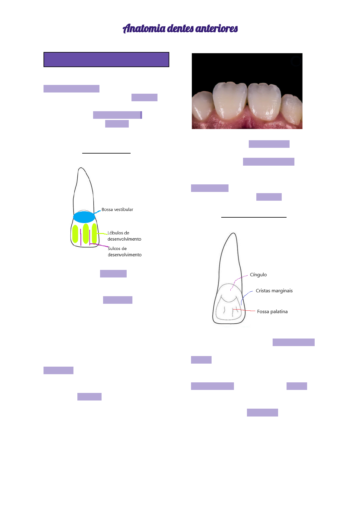 Anatomi� dente� anteriore� Incisivo central superior 11 e 21 - É um dente indispensável para a estética do sorriso; - É o mais importante para a fonação, na emissão de sons línguo e labiodentais; - Tem função de cortar alimentos; - Tem formato de trapézio. Estreito no terço cervical e largo no terço incisal. Face vestibular A face vestibular é convexa. Estruturas Bossa vestibular: saliências de esmalte no terço cervical da coroa do dente. Sulcos de desenvolvimento: sulcos consequentes dos lóbulos de desenvolvimento. Lóbulos de desenvolvimento: três elevações encontrados na vestibular do dente. Mamelos: serrinha encontrada na borda incisal. Com o tempo, os mamelos vão se desgastando, dessa forma são mais evidentes em crianças e jovens. - Pode apresentar periquimácias que são texturas encontradas na vestibular. São mais comuns em pacientes jovens. O ângulo disto-incisal é mais arredondado, enquanto o ângulo mésio-incisal é mais retilíneo. Face lingual/palatina Cíngulo: encontrado no terço cervical, tem a função de proteger a gengiva e dar reforço para o dente. Cristas marginais: encontradas na mesial e distal servem para dar reforço ao dente. Fossa palatina: depressão nos terços médio e incisal. Anatomi� dente� anteriore� Face proximal - Tem formato de triângulo. Raiz - Unirradicular; - Tem formato cônico; - Pode ter uma leve inclinação para a distal. Incisivo lateral superior 12 e 22 - Muito semelhante com o incisivo central, porém é menor em todas as dimensões; Face vestibular - Apresenta Bossa vestibular, Sulcos de desenvolvimento e Lóbulos de desenvolvimentos. - Em alguns casos pode apresentar apenas um sulco de desenvolvimento. - Os ângulos mésio e distoincisal são mais arredondados. Face palatina - Apresenta os mesmos elementos que o incisivo central, mas as cristas marginais apresentam-se mais salientes e a fossa palatina mais profunda. - Surge frequentemente um fosseta entre o cíngulo e a fossa palatina, chamado de forame cego Raiz - Unirradicular; - Formato cônico; - É mais longa que a do incisivo central; - Achatada no sentido mésio-distal; - raiz voltada mais para a distal. Incisivo central inferior 31 e 41 - É o menor dente permanente; - Por ser um dente que não exige muita força, apresenta elementos menos evidentes, como cristas e sulcos. Anatomi� dente� anteriore� - Não tem contato dentário, por esse motivo não precisa ser reforçado; - Voltado para a lingual; - Tem o formato de triângulo. Face vestibular - Apresenta as mesmas características que o superior, porém mais sutis; - A borda incisal é mais retilínea, pouco arredondada; - Com o tempo, há maior desgaste no ângulo mesioincisal do dente, assim percebe-se uma inclinação para a mesial. Face lingual - Elementos mais delgados, como o cíngulo, fossa lingual e cristas marginais. Raiz - Unirradicular - Raiz é retilínea, sem inclinação para nenhum dos lados; - Bem achatada no sentido mesiodistal, sendo assim bem larga no sentido vestibulolingual. Incisivo lateral inferior 32 e 42 - Maior que o incisivo central inferior em todas as dimensões. Face vestibular - Aspecto triangular; - A borda mesial é mais alta que a distal; - O ângulo distoincisal é mais arredondado. Anatomi� dente� anteriore� Face lingual - Cíngulo, e cristas marginais mais discretas. Raiz - A raiz é mais longa, mais robusta quando comparada com a do central. Canino inferior 13 e 23 - Responsável pela força dos anteriores; - É o mais longo dos dentes; - Tem um aspecto de força e robustez. - Função de rasgar, dilacerar alimentos. Face vestibular - Contorno pentagonal. - Há presença de uma cúspide na borda incisal; - O ângulo distoincisal é mais arredondado; - Possui bossa vestibular, sulcos de desenvolvimento e lóbulos de desenvolvimento; - Possui uma elevação no centro em forma de crista, fazendo com que o lóbulo central seja mais proeminente. Face palatina - Tem o mesmo formato que a face vestibular; - Apresenta cíngulo e cristas bem desenvolvidos; - Fossa palatina é bem rasa, em alguns casos a face pode se apresentar lisa. Raiz - Unirradicular; - Cônica; - Raiz forte, volumosa; - É longa e reta, se desvia para a distal. Canino inferior 33 e 43 Face vestibular - Apresenta as mesmas características que o superior mas com estruturas mais discretas, por ser um dente que precisa de menos força. Anatomi� dente� anteriore� Face lingual - Diferente do canino superior, ele não apresenta estruturas bem robustas. O cíngulo e as cristas são bem sutis, e a fossa é bem rasa. Raiz - É bastante achatada no sentido mesiodistal; - Na maioria das vezes se encontra a raiz inclinada levemente para a distal.