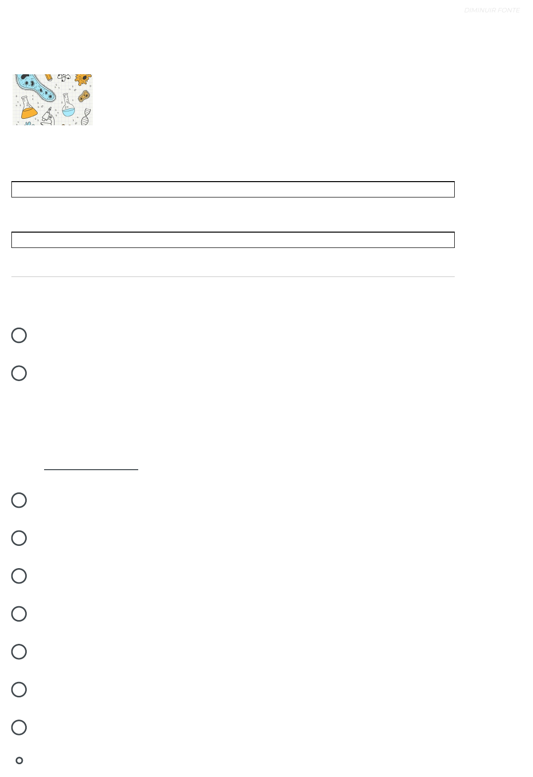 21/03/2023 20:29 Questões de Avaliação https://www.avaeduc.com.br/mod/quiz/review.php?attempt=1966073 1/9 Ciências Biológicas 76% 89% Andamento Geral Andamento do Tópico MEU DESEMPENHO MENU Orientações Genética Questões de Fixação Atividade Avaliativa Genética Imunologia, Mutação e Neoplasia Biotecnologia Qualidade de Vida Ecologia e Meio Ambiente Átomo, Termodinâmica e Soluções Vida, Evolução e Bioquímica Anatomia e Fisiologia Humanas Minhas Mensagens Avaliação de aula Minhas Notas Contatos do curso Prova digital [ 1 ] IR PARA O CONTEÚDO [ 2 ] IR PARA O MENU SOBRE A ACESSIBILIDADE ALTO-CONTRASTE AUMENTAR FONTE DIMINUIR FONTE https://www.avaeduc.com.br/course/view.php?id=7136&topic=114955 https://www.avaeduc.com.br/course/view.php?id=7136&topic=114956 https://www.avaeduc.com.br/course/view.php?id=7136&topic=114957 https://www.avaeduc.com.br/course/view.php?id=7136&topic=114958 https://www.avaeduc.com.br/local/mail/view.php?t=inbox javascript:void(0); javascript:void(0); javascript:void(0); javascript:void(0); https://www.avaeduc.com.br/mod/page/view.php?id=1 https://www.avaeduc.com.br/mod/page/view.php?id=1 21/03/2023 20:29 Questões de Avaliação https://www.avaeduc.com.br/mod/quiz/review.php?attempt=1966073 2/9 PÁGINA INICIAL / MEUS CURSOS / CIÊNCIAS BIOLÓGICAS / ATIVIDADE AVALIATIVA / QUESTÕES DE AVALIAÇÃO a. 32 b. 8 c. 12 d. 16 e. 64 Iniciado em terça, 21 mar 2023, 19:41 Estado Finalizada Concluída em terça, 21 mar 2023, 20:29 Tempo empregado 47 minutos 40 segundos Avaliar 10,00 de um máximo de 10,00(100%) Questão 1 Correto Atingiu 1,00 de 1,00 “A segunda lei de Mendel, denominada de di-hibridismo, analisa a formação dos gametas e a manifestação da segregação independente dos fatores, ou seja, a separação de dois ou mais genes alelos localizados em diferentes pares de cromossomos homólogos. Essa segregação fundamenta-se essencialmente durante a anáfase I da divisão meiótica, resultante não mais do estudo de características isoladas, conforme a primeira lei enunciada por Mendel, mas da consideração do comportamento fenotípico envolvendo duas ou mais características. A combinação (probabilidade) das distintas configurações possíveis, quanto à separação dos fatores, permite a formação de variados gametas, o que ocasiona maior variabilidade genética”. De acordo com o texto, para um indivíduo com um genótipo KkWwXxZz, assinale a alternativa que contenha a quantidade correta de tipos diferentes de gametas. Escolha uma: Questões de Avaliação [ 1 ] IR PARA O CONTEÚDO [ 2 ] IR PARA O MENU SOBRE A ACESSIBILIDADE ALTO-CONTRASTE AUMENTAR FONTE DIMINUIR FONTE https://www.avaeduc.com.br/ https://www.avaeduc.com.br/course/view.php?id=7136 https://www.avaeduc.com.br/mod/quiz/view.php?id=499326 https://www.avaeduc.com.br/mod/page/view.php?id=1 https://www.avaeduc.com.br/mod/page/view.php?id=1 21/03/2023 20:29 Questões de Avaliação https://www.avaeduc.com.br/mod/quiz/review.php?attempt=1966073 3/9 a. Apenas as afirmativas I e III estão corretas. b. Apenas as afirmativas I, III e IV estão corretas. c. Apenas as afirmativas I e II estão corretas. d. Apenas as afirmativas I, II e III estão corretas. e. Apenas as afirmativas II e IV estão corretas. Questão 2 Correto Atingiu 1,00 de 1,00 Camila possui um cachorro macho, da raça Dachshund (popularmente conhecida por “Salsicha”) e gostaria de ter filhotes. Para isso, conversando com amigos, um deles conhece uma mulher, chamada Mara, que possui uma fêmea da mesma raça. Camila ao conversar com Mara, disse que seu macho era preto com os olhos escuros (PpOO) e Mara disse que sua fêmea era marrom com olhos claros (ppoo). Ambas ficaram animadas, pois com esse cruzamento talvez fosse possível ter filhotes com características de cor de pelo e olho diferentes dos pais. Sabendo que o pêlo preto e os olhos escuros são dominantes, avalie as afirmativas a seguir: I. Camila e Mara terão todos os filhotes com olhos escuros. II. Camila e Mara terão a chance de 25% dos filhotes possuírem olhos claros. III. 50 % dos filhotes serão marrons com olho escuro. IV. Todos os filhotes possuirão pêlo na cor preta. Agora, assinale a alternativa CORRETA: Escolha uma: [ 1 ] IR PARA O CONTEÚDO [ 2 ] IR PARA O MENU SOBRE A ACESSIBILIDADE ALTO-CONTRASTE AUMENTAR FONTE DIMINUIR FONTE https://www.avaeduc.com.br/mod/page/view.php?id=1 https://www.avaeduc.com.br/mod/page/view.php?id=1 21/03/2023 20:29 Questões de Avaliação https://www.avaeduc.com.br/mod/quiz/review.php?attempt=1966073 4/9 a. 6 b. 4 c. 2 d. 9 e. 7 a. 1 IV : 2 V : 1 VI b. 1 I : 2 III : 1 V c. 1 II : 1 IV : 2 VI d. 2 III : 1 IV : 1 V e. 1 II : 1 III : 2 IV Questão 3 Correto Atingiu 1,00 de 1,00 Imagine um gene hipotético que possua 2 intros e 3 exons. Através do processo do splicing alternativo, esse único gene é capaz de gerar mais de um tipo de polipeptídio, pois essa mesma sequência é aproveitada de maneiras diferentes durante esse mecanismo. Qual o número máximo de polipeptídios diferentes que poderão ser gerados a partir de um gene com 2 intros e 3 exons? Escolha uma: Questão 4 Correto Atingiu 1,00 de 1,00 Em uma população de plantas, as cores de suas sementes são classificadas em 7 categorias diferentes. Variando de I a VII, sendo I correspondente às claras, VII às escuras e as categorias intermediárias (II, III, IV, V e VI) sendo correspondentes às cores intermediárias. Existem 6 alelos que se segregam independentemente responsáveis por essa determinação de cor. Em um cruzamento entre um indivíduo AABBCc e outro aaBbCC, qual será a proporção fenotípica das categorias de cores? Escolha uma: [ 1 ] IR PARA O CONTEÚDO [ 2 ] IR PARA O MENU SOBRE A ACESSIBILIDADE ALTO-CONTRASTE AUMENTAR FONTE DIMINUIR FONTE https://www.avaeduc.com.br/mod/page/view.php?id=1 https://www.avaeduc.com.br/mod/page/view.php?id=1 21/03/2023 20:29 Questões de Avaliação https://www.avaeduc.com.br/mod/quiz/review.php?