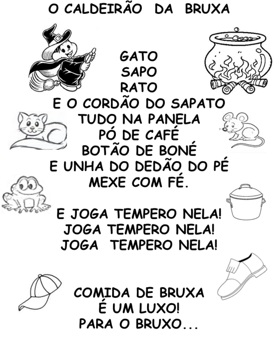 GLÁUCIA LEMOS Escola: _______________________________________________________________________ Nome:_______________________________________________________________________ Turma: _______ Turno: _______________ Professora: ______________ Data: ___/___/____ 1) Pinte no poema as palavras que terminam com o mesmo som, utilizando a mesma cor. 2) O poema é: ( ) Uma carta de amor. ( ) Uma bula de remédio. ( ) Um bilhete para o namorado. ( ) Uma poção mágica. ( ) Uma receita de comida. 3) No poema, para que a bruxa utilizou um caldeirão? 4) Liste os ingredientes utilizados pela bruxa. 5) Escreva, em cada caldeirão, palavras retiradas do poema que rimem com as apresentadas abaixo. 6) Leia a receita a seguir e dê um nome para ela. 7) Ditado Mudo 8) Complete com as letras que estão faltando. a) ___E___ ___E___O b) A___O___O___A c) A___A___ ___A d) ___A___O e) ___O___ ___E___O f) ___A___E___A g) ___A___ ___ O U___A h) A___ ___O___E 9) Crie uma receita para a bruxa utilizando os ingredientes abaixo. Escola: _______________________________________________________________________ Nome:_______________________________________________________________________ Turma: _______ Turno: _______________ Professora: ______________ Data: ___/___/____ Use sua imaginação e crie uma receita horripilante para a bruxa. RECEITA DE: ____________________________ INGREDIENTES: MODO DE FAZER: Utilidade: Escola: _______________________________________________________________________ Nome:_______________________________________________________________________ Turma: _______ Turno: _______________ Professora: ______________ Data: ___/___/____ Atividade Ditado de caldeirão 1. 2. 3. 4. 5. 6. 7. 8. 9. 10. Sugestões Cartaz com o poema: O caldeirão da Bruxa Leitura coletiva do poema. Destacar palavras no cartaz que tenham o mesmo som. Atividade temática para casa: Com foco nos diferentes níveis. Produção de texto: Produção de uma receita mágica, tendo como apoio a sugestão de alguns ingredientes ex: Asa de morcego, Língua de dragão etc. Ditado de caldeirão (Imagens de itens que estejam relacionados com o texto, retiradas de um caldeirão. Ex: Morcego, aranha, besouro, etc) Leitura no caldeirão (O professor diz: Raspudim, raspudim leia uma palavra para mim e a criança tira uma palavra do caldeirão e realiza a leitura para a turma.) Moldes