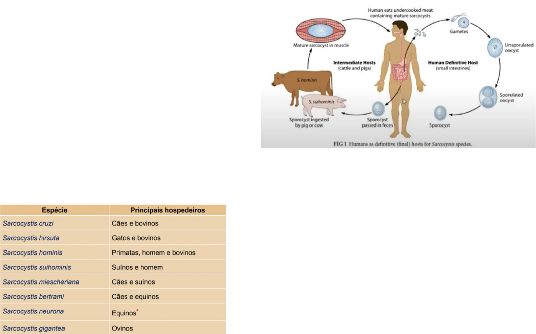 Sarcocystis Importância Zoonose: problema de saúde publica Cosmopolita: localizado no mundo todo Dois hospedeiros: hospedeiro intermediário e definitivo Posição sistemática Sub-Reino: Protozoa Filo: Apicomplexa Classe: Sporozoae Família: Sarcocystidae Gênero: Sarcocystis Família Sarcocystidae Morfologia Oocistos esporulados (forma infectante): 2 esporocistos com 4 esporozoítos Hospedeiro intermediário (cisto): cistos nos tecidos Hospedeiro definitivo (esporocisto): humano Ciclo de vida Homem ingere carne mal passada ou crua elimina pelas fezes o esporocisto (contaminando ambiente e contaminando animais) → se aloja na musculatura dos animais formando cistos → homem se alimenta da carne do animal e ingere esses esporocistos → no sistema gástrico, o suco gástrico tira a camada dos esporocistos e libera os esporozoítos → esporozitos formam os gametas → fecundação dos gametas dando origem ao oocisto → oocisto esporula Patologia Hospedeiro intermediário: infecção clinicamente branda, febre intermitente, dispneia (falta de ar), perda de peso (animais em crescimento) e redução na produção de leite. ↪Quando a carga parasitaria for muito grande: hemorragia, necrose e edema (maturação de merozoitos). HD: anorexia, desconforto abdominal, náusea e diarreia (infecção autolimitante – depois de alguns dias a infecção alivia, mas continua os oocistos no corpo). Diagnóstico Hospedeiro definitivo: oocistos esporulados ou esporocistos nas fezes (dependendo da quantidade que foi ingerido, ele pode não ser digerido e ir para as fezes). Cortes histológicos: cistos (bradizoitos – forma encistada) Mieloencefalite equina por protozoários (S. neurona): merontes no cérebro, medula espinhal e parte do SNC. ↪Sinais clínicos: • Incoordenação motora: um dos membros fica estirado. • Atrofia: dificuldade para andar • Claudicação: manca • Paresia posterior: musculatura paralisada • Alterações comportamentais ↪Epidemiologia: • Idade: mais velhos e mais novos • Raças pré-dispostas • Queda imunológica ↪Ciclo de vida: • HD (gambá): defeca na natureza cavalo ingere vai para o cérebro • HI (gato): os cistos ficam nos músculos do gato gambá se alimenta do gato ↪Diagnóstico: • Sintomático (Bloqueio anestésico, anti- inflamatório) • Exame físico • Laboratorial (Western Blot – liquor, RIFI) • Histopatológico, Imuno – histoquímica, PCR ↪Prevenção: • Humanos: ➢ Não ingerir carne crua ou mal passada ➢ Destino adequado das fezes ➢ Educação sanitária. • Animais: ➢ Não fornecer carne crua aos animais ➢ Não permitir acesso às carcaças ➢ Alimentos armazenados em locais fechados ➢ EPM vaccine – Fort Dodge.
