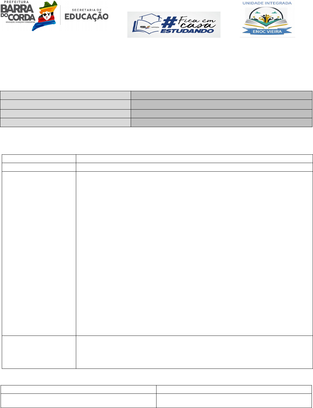 ESTADO DO MARANHÃO PREFEITURA MUNICIPAL DE BARRA DO CORDA – MA SEMED - SECRETARIA MUNICIPAL DE EDUCAÇÃO UNIDADE INTEGRADA ENOC VIEIRA Rua Rio Purus, 65 Araticum – Barra do Corda –MA Gestora: Marinete de Oliveira Sousa COMPONENTE CURRICULAR: Geografia DOCENTE: Edilene Miranda Rodrigues ANO / SÉRIE: 9º ano “A” Vespertino QUANTIDADE DE HORA/ AULA: Referentes às aulas dos dias 24 / 07 / a 07 / 08 /2020 PROPOSTA DO PLANO DE ENSINO DOMICILIAR CONTEÚDO: O que estudar? Unidade I - A globalização no espaço geográfico Onde devo estudar? Livro didático O que devo fazer? Vídeo – aulas do professor, slaides e vídeo pelo o snatupe para que os alunos possam: - Diferenciar paisagem e espaço geográfico. - Reconhecer o espaço geográfico como uma construção humana, que envolve trabalho e técnica. Para onde enviar PÁGINAS DATA DE ENTREGA Barra do Corda, MA- em ______de ____________de 2020 _______________________________ _____________________________ Docente Coordenação