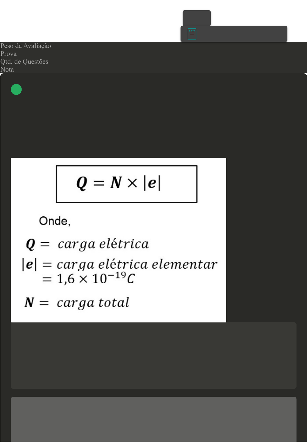 22/03/2023, 11:55 Avaliação Final (Discursiva) - Individual about:blank 1/2 Prova Impressa GABARITO | Avaliação Final (Discursiva) - Individual (Cod.:656304) Peso da Avaliação 4,00 Prova 24383260 Qtd. de Questões 2 Nota 3,00 Os prótons são denominados partículas de cargas positivas, os elétrons têm carga negativa e os nêutrons têm carga neutra. Considerando que para o estado de um corpo estar com carga elétrica positiva, caracteriza-se por uma falta de elétrons; quando um corpo está com carga elétrica negativa, existe uma falta de prótons; se um corpo está com carga elétrica neutra, o número de prótons é igual ao número de elétrons. Com base nas informações apresentadas, responda às questões: a) Analise os elementos da fórmula e explique como calcular o valor da carga elétrica de um corpo. b) Calcule o número de elétrons que um corpo, em seu estado neutro, deverá perder para que possua a carga elétrica no valor total de 12 C. Resposta esperada a) Para se determinar o valor total da carga, deve-se calcular a diferença entre o número de prótons e o número de elétrons que este elemento possui. b) Utilizando a fórmula, deve-se: Minha resposta a) Para se determinar o valor total da carga, deve-se calcular a diferença entre o número de prótons e o número de elétrons que este elemento possui. b) N=Q/e Aplicar a fórmula VOLTAR A+ Alterar modo de visualização 1 22/03/2023, 11:55 Avaliação Final (Discursiva) - Individual about:blank 2/2 N=12/16x10^-19 N=7,5x10^19 elétrons Quando uma corrente atravessa um meio condutor, ela enfrenta uma determinada oposição chamada de resistência elétrica, sendo que a energia aplicada a um circuito elétrico resulta da tensão como da corrente, no momento em que um curto-circuito se desenvolve, a resistência diminui. Considerando um circuito elétrico, com uma tensão de 320 volts, responda às questões: a) Calcule a corrente elétrica do sistema, considerando uma resistência de 60 ohms. b) Se a resistência passa a ser de 30 ohms, qual o valor da corrente elétrica? c) A corrente elétrica diminuiu ou aumentou? Explique por quê. Resposta esperada Resposta na imagem a seguir. Minha resposta a) Corrente (A) = tensão (V)/resistência (Ω) Corrente = 320/60 Corrente = 5,33 ampère b) Corrente (A) = tensão (V)/resistência (Ω) Corrente = 320/30 Corrente = 10,66 ampère C) O valor da corrente aumentou pois, conforme o sistema vai se desenvolvendo, a resistência diminui. 2 Imprimir