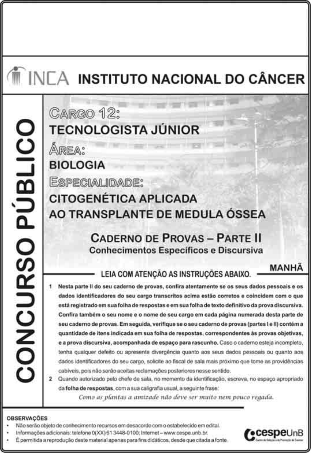 UnB/CESPE – INCA Cargo 12: Tecnologista Júnior – Área: Biologia – Especialidade: Citogenética Aplicada ao Transplante de Medula Óssea – 1 – CONHECIMENTOS ESPECÍFICOS Com relação à divisão celular, julgue os itens a seguir. 41 O posicionamento dos cromossomos na placa equatorial, que ocorre durante a metáfase, é fundamental para a correta migração dos cromossomos homólogos e(ou) cromátides irmãs para os polos das células. 42 O crossing-over entre cromossomos homólogos ocorre durante a prófase meiótica e é dependente do complexo sinaptonemico, estrutura proteica que apresenta os nódulos de recombinação. 43 Durante a mitose ou meiose, o núcleo celular se desfaz e permite a duplicação dos cromossomos. 44 A duplicação cromossômica, isto é, o processo de replicação da molécula de DNA, ocorre durante a prófase. 45 Na meiose I ocorre segregação dos cromossomos homólogos e as cromátides irmãs migram para o mesmo polo da célula. A meiose é um processo complexo e sujeito a erros na segregação dos cromossomos. Esses erros podem levar à formação de gametas aneuploides. Com relação aos erros de segregação dos cromossomos julgue os próximos itens. 46 A não disjunção cromossômica e o retardo anafásico têm como consequência a alteração do número de cromossomos do gameta e podem levar à formação de gametas aneuploides. 47 Uma das origens da dissomia uniparental é a correção de uma aneuploidia pela célula. 48 Translocação equilibrada é uma das causas do aumento na frequência de não-disjunção meiótica. 49 A frequência de não-disjunção cromossômica não se altera com o aumento da idade materna. A identificação de rearranjos cromossômicos recorrentes em pacientes com doenças malignas hematológicas permitiu o desenvolvimento de métodos diagnósticos dessas doenças com base na técnica de reação em cadeia da polimerase (PCR). Com relação à técnica de PCR julgue os itens subsequentes. 50 A PCR é realizada em um equipamento, o termociclador, que permite a visualização das moléculas de DNA na forma de bandas. 51 A amplificação de mRNA por PCR deve ser precedida da conversão do mRNA em cDNA. 52 A fase cíclica da PCR consiste em uma etapa de desnaturação do DNA, uma etapa de ligação dos iniciadores ao DNA (pareamento) e uma etapa de extensão da fita de DNA. 53 A PCR em tempo real pode ser usada para detecção do número de cópias de uma dada sequência de DNA assim como no estudo da doença residual mínima. 54 A translocação t(12;21)(p13;q22), comum em pacientes com leucemia, leva à fusão dos genes TEL/AML1. Essa alteração pode ser detectada por PCR com iniciadores específicos para a detecção do produto de fusão dos genes TEL/AML1. Desde o século XIX, muito antes que se descobrisse o papel dos cromossomos na transmissão das características hereditárias, já se estudava a morfologia dos corpos corados presentes no interior da célula, denominados cromossomos. Até hoje, o estudo da morfologia dos cromossomos é a base da citogenética. Com relação à estrutura e à morfologia dos cromossomos de acordo com os conhecimentos atuais, julgue os itens que se seguem. 55 Cromossomos acrocêntricos são aqueles cujos braços curto e longo têm tamanho semelhante. 56 A constrição primária do cromossomo corresponde ao centrômero, região onde é encontrado o cinetócoro, estrutura proteica onde as fibras do fuso se ligam. 57 A constrição secundária do cromossomo corresponde ao telômero, região composta por DNA repetitivo rico em adenina. 58 O nucléolo, organela nuclear não delimitada por uma membrana, é o local onde ocorre a transcrição e o processamento dos rRNAs. 59 Alfa-satélite é o nome que se dá à sequência de DNA repetitivo encontrado nos centrômeros dos cromossomos humanos. Para que uma célula se divida, é fundamental que o DNA se duplique. Com relação à replicação do DNA julgue os itens a seguir. 60 Cada cromátide contém uma única molécula de DNA. 61 Na replicação da fita de DNA molde 3’- 5’, os fragmentos de Okasaki funcionam como iniciadores, permitindo a adição de novos nucleotídeos na extremidade 3'. 62 A replicação do DNA está sujeita a erros que são corrigidos pela maquinaria de reparo. A não correção desses erros, consequência de falhas da maquinaria de reparo, tem como consequência o surgimento de mutação na sequência do DNA. Os telômeros são regiões do cromossomo que fornecem estabilidade ao cromossomo. À medida que as células se dividem, o tamanho dos telômeros se altera e, quando atinge o tamanho limite, a célula entra em senescência. A telomerase é a enzima responsável por controlar a replicação dos telômeros e sabe-se que esse mecanismo está envolvido no envelhecimento e no câncer. Com relação à manutenção dos telômeros pela telomerase julgue os itens que se seguem. 63 A telomerase é uma transcriptase reversa que sintetiza DNA a partir de um molde de RNA que compõe a estrutura molecular da telomerase. 64 Uma das funções da telomerase é sinalizar para a célula, a depender do tamanho do telômero, que a célula deve entrar em apoptose. UnB/CESPE – INCA Cargo 12: Tecnologista Júnior – Área: Biologia – Especialidade: Citogenética Aplicada ao Transplante de Medula Óssea – 2 – A nomenclatura cromossômica é descrita considerando-se alterações de número e estrutura. Com relação às classes de alterações, julgue os itens seguintes. 65 Nem todo sítio frágil apresenta consequências fenotípicas. 66 Inversões paracêntricas são aquelas que envolvem a região centromérica de modo que o bloco heterocromático situado na porção proximal do braço longo fica posicionado no braço curto. 67 A designação der para cromossomos derivativos se refere ao cromossomo que teve a estrutura do seu centrômero modificado pelo rearranjo. 68 Double minutes são estruturas acêntricas que podem