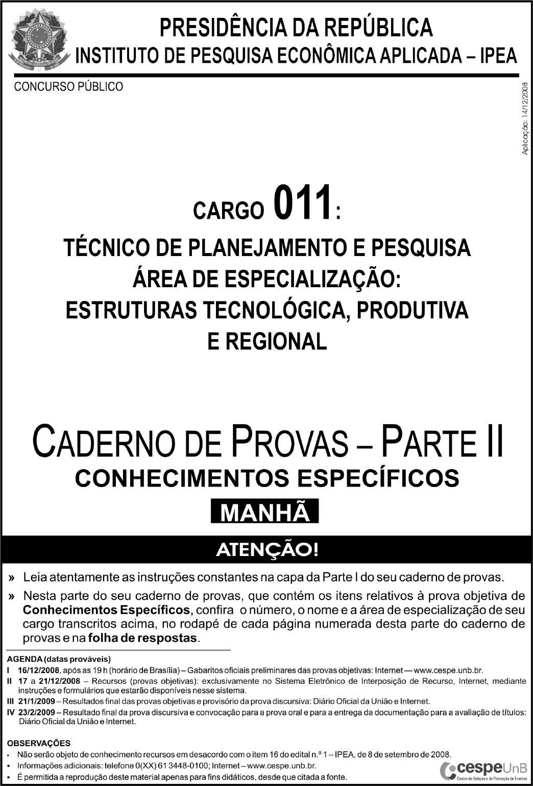 UnB/CESPE – IPEA Cargo 11: Técnico de Planejamento e Pesquisa – Área de Especialização: Estruturas Tecnológica, Produtiva e Regional – 1 – De acordo com o comando a que cada um dos itens de 51 a 120 se refira, marque, na folha de respostas, para cada item: o campo designado com o código C, caso julgue o item CERTO; ou o campo designado com o código E, caso julgue o item ERRADO. A ausência de marcação ou a marcação de ambos os campos não serão apenadas, ou seja, não receberão pontuação negativa. Para as devidas marcações, use a folha de respostas, único documento válido para a correção das suas provas. CONHECIMENTOS ESPECÍFICOS Considerando aspectos da configuração das redes urbanas regionais no Brasil e do imbricamento dessa morfologia com a economia produtivista nacional, julgue os itens que se seguem. 51 A iniciativa privada brasileira, fortalecida por mercados centralizados, mas conjugados em redes integradas, está cada vez menos lastreada nas ações de políticas urbanas pelos poderes públicos locais. 52 A Zona Franca de Manaus comprova a autonomia e total independência do meio empresarial brasileiro como potência para realizar complexos produtivos mesmo que nas localidades econômica e politicamente mais recônditas do país. 53 A análise das tendências que cada núcleo urbano apresenta, na concentração de pessoas e atividades econômicas, deve dar exclusiva prioridade ao levantamento do percurso histórico de investimentos pelo setor privado de produção. O sociólogo brasileiro Francisco de Oliveira em sua análise dos padrões de acumulação, oligopólios e Estado no Brasil (1950- 1976) verifica os esquemas de reprodução ampliada da economia pela observação de três departamentos básicos da produção: Departamento I, produtor de bens de capital ou de produção; Departamento II, produtor de bens de consumo não duráveis; e Departamento III, produtor de bens de consumo duráveis. Segundo a clássica divisão adotada pelo autor, julgue os itens a seguir. 54 Na primeira metade dos anos cinqüenta do século passado, precisamente o período que corresponde à presidência Vargas, buscou-se um padrão de acumulação para a economia brasileira fundado na expansão do setor produtor de bens de produção. 55 O bloco de atividades produtivas que se materializaram em iniciativas estatais como a criação da PETROBRAS e da Companhia Siderúrgica Nacional (CSN), instituem no Brasil as bases para a expansão dos Departamentos II e III da economia brasileira. 56 A produção agrícola, o capital da terra, conforma o pilar central do Departamento I da economia produtiva. A aglomeração urbana e o adensamento populacional, pelo processo de crescimento contínuo de conjuntos de cidades e pela metropolização, exige desafios no setor da mobilidade urbana por parte dos poderes públicos. De acordo com esse quadro, julgue os itens seguintes. 57 Uma das saídas para a questão da mobilidade urbana vem pela isenção fiscal de cidades a determinadas fatias do setor produtivo privado buscando atrair essas empresas, garantindo emprego e renda para os seus habitantes. 58 A questão habitacional, pela criação das zonas de interesse social (ZEIS) e pelas políticas de regularização fundiária e locação social, tem o potencial de garantir uma ocupação democrática do espaço urbano, viabilizando assim mais igualdade na questão da mobilidade urbana. 59 Priorizar a mobilidade urbana envolve a defesa de um conjunto de políticas de transporte e circulação buscando garantir a mobilidade das pessoas e não dos veículos, e, assim, o acesso amplo e democrático ao espaço urbano. O Estatuto da Cidade em seu artigo segundo estabelece que “a política urbana tem por objetivo ordenar o pleno desenvolvimento das funções sociais da cidade e da propriedade urbana”. Segundo essa diretriz e de acordo com o sentido mais amplo de outras disposições gerais dessa lei federal, julgue os itens subseqüentes. 60 Os mercados de incorporação imobiliária devem ser subsidiados com verba pública no sentido de garantir a efetiva natureza social da propriedade privada. 61 O planejamento e as intervenções urbanísticas no sentido de se buscar garantir o bem coletivo e a função social da propriedade devem exigir a criação de outros paradigmas de organização produtiva. 62 A questão da economia informal, com grande parcela da população excluída do sistema de produção, pode e deve ser pensada à luz do disposto no segundo artigo do Estatuto da Cidade. Segundo o disposto no art. 36 da Lei Federal n.º 10.257 /2001 (o Estatuto da Cidade), “lei municipal definirá os empreendimentos e atividades privados ou públicos em área urbana que dependerão de elaboração de estudo prévio de impacto de vizinhança (EIV) para obter as licenças ou autorizações de construção, ampliação ou funcionamento a cargo do poder público municipal”. De acordo com o texto desse artigo, julgue os seguintes itens subseqüentes. 63 A ocupação do espaço urbano pelo setor produtivo em geral, atendendo ao disposto na Lei retromencionada, deve garantir a permanência das moradias e centros habitacionais em seus limites de vizinhança, nunca se valendo de práticas de desocupação. 64 Os estudos de impacto de vizinhança visam impulsionar a produção de maneira a garantir uma margem segura para o escoamento no espaço urbano de eflúvios tóxicos, podendo ser sólidos, líquidos ou gasosos. 65 O EIV será executado de forma a contemplar os efeitos positivos e negativos do empreendimento ou atividade quanto à qualidade de vida da população residente na área e suas proximidades. O sociólogo brasileiro Francisco de Oliveira, em análise do processo de oligopolização da economia, afirma não haver capitalismo monopolista sem o Estado. Segundo essa assertiva, julgue os itens a seguir. 66 Sem a conversão dos fundos públicos em pressuposto geral do capital, a e