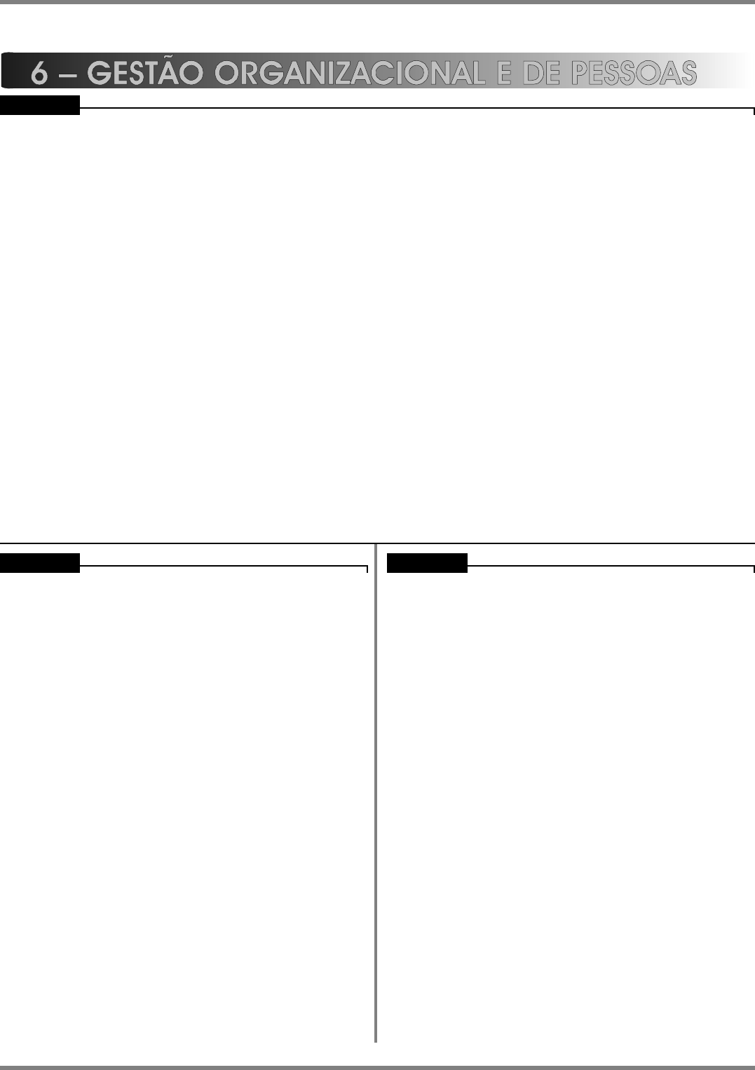 UnB/CESPE – BB-Certificação Área de Conhecimento 6: Gestão Organizacional e de Pessoas – 1 – Nas questões a seguir, marque, para cada uma, a única opção correta, de acordo com o respectivo comando. Para as devidas marcações, use a Folha de Respostas, único documento válido para a correção das suas respostas. QUESTÃO 1 Andreia foi recém-contratada pelo Banco do Brasil S. A. (BB) em um cargo inicial. Por mais de cinco anos, ela atuou no mercado financeiro em São Paulo. Por motivos de doença, ela precisou se mudar para Brasília. Andreia estava acostumada com um ambiente competitivo, no qual realizava, em ritmo intenso, negócios que envolviam altos montantes. Ao chegar à nova agência, Andreia se deparou com funcionários desanimados, com dificuldades para realizar negócios e alcançar as metas propostas. Quando foi contratada, ela considerava que suas habilidades seriam facilmente aproveitadas pelo BB. A partir da situação hipotética acima, assinale a opção correta acerca dos afetos e vínculos dos profissionais com o trabalho e com as organizações. A Certamente, os funcionários da agência de Brasília apresentam baixo comprometimento com a organização porque não conseguem alcançar as metas estabelecidas pelo banco. B A situação apresentada evidencia que Andreia possui uma visão errada da relação de trabalho com seus colegas e do clima na unidade de trabalho. C Fatores como motivação, satisfação no trabalho e comprometimento com a carreira e com a organização são suficientes para a realização do trabalho e para se alcançar produtividade na função. D O caso apresentado ilustra como o aumento da complexidade dos cargos e como as diferenças individuais no desempenho das tarefas têm impacto no resultado do trabalho. E O processo de socialização de Andreia no banco deve enfatizar as perspectivas de desenvolvimento na carreira, as suas competências e características pessoais, bem como as possibilidades de crescimento na instituição a curto, médio e longo prazo. QUESTÃO 2 No contexto organizacional, há lideranças que são indicadas pela organização e lideranças informais, que nascem nos grupos sociais. Com relação à liderança e aos grupos nas organizações, assinale a opção correta. A A violação de leis e regras explícitas das organizações não ocorre em situações em que os grupos sociais estabelecem normas que podem direcionar os comportamentos dos seus membros. B A liderança exercida por um membro da equipe, não imposta pela organização, será mais eficaz na sua tarefa de conduzir os membros da equipe ao sucesso que aquela exercida por um chefe nomeado pela organização. C As equipes de trabalho necessitam de um líder porque o direcionamento das atividades e o alcance dos objetivos não acontecem sem sua presença constante no ambiente de trabalho. D Na prática, líderes eficazes possuem traços e comportamentos diversos. Embora não haja garantia de que alguns desses traços promovam o sucesso da liderança, a presença deles aumenta a probabilidade de êxito. E O estilo de liderança voltado para o relacionamento produz melhores resultados quando o líder possui alto controle das situações de trabalho, sobretudo quando os subordinados apresentam baixa competência para a realização da tarefa. QUESTÃO 3 Com relação à cultura organizacional, julgue os itens que se seguem. I A cultura organizacional pode ser compreendida como um sistema complexo que aglomera e une vários pontos de vista. II Os determinantes da cultura organizacional são as diferenças individuais que proporcionam o desenvolvimento de aspectos tangíveis e racionais, definidos como tecnologias e estruturas, símbolos, ideologias, crenças, rituais e mitos. III Os mecanismos de socialização dos membros da organização podem ser considerados mecanismos de perpetuação da cultura organizacional. IV A cultura organizacional e o clima no ambiente de trabalho podem afetar o desempenho dos empregados, contudo a cultura organizacional não afeta o desempenho da organização como um todo. Assinale a opção correta. A Apenas o item II está certo. B Apenas os itens I e III estão certos. C Apenas os itens II e IV estão certos. D Apenas os itens I, III e IV estão certos. E Todos os itens estão certos. UnB/CESPE – BB-Certificação Área de Conhecimento 6: Gestão Organizacional e de Pessoas – 2 – QUESTÃO 4 Assinale a opção correta acerca da liderança, cultura e mudanças organizacionais. A Um histórico de desilusão e desconfiança em relação ao líder gera um ambiente em que as mudanças tendem automaticamente ao fracasso, haja vista que os líderes são os principais responsáveis pela promoção delas na organização. B A cultura organizacional favorece a realização de mudanças e facilita a adaptação dos indivíduos aos novos processos. C Avaliações da mudança organizacional sugerem que, embora os resultados financeiros pretendidos no início possam ter sido alcançados, o processo tende a ser interrompido antes que os novos comportamentos sejam consolidados na cultura da organização. D Os gerentes de linha são representantes da cultura da organização, e, em virtude disso, devem ser considerados agentes de mudança na organização. E A complexidade do processo de mudanças organizacionais depende apenas dos aspectos concretos da organização, como a estrutura, os sistemas e os procedimentos. QUESTÃO 5 Considerando as tendências da moderna gestão de pessoas, assinale a opção correta. A A gestão estratégica de pessoas envolve a formulação de estratégia pela própria organização, não devendo se alinhar a estratégia formulada externamente. B Uma força de trabalho altamente habilidosa e altamente motivada garante a vantagem competitiva da organização e facilita a gestão do desempenho. C A análise das características organizacionais e de seu ambiente externo propicia uma gestão de pes