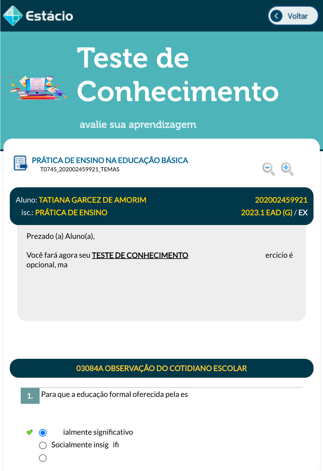 22/03/2023, 17:26 Estácio: Alunos https://simulado.estacio.br/alunos/ 1/7 Teste de Conhecimento avalie sua aprendizagem Para que a educação formal oferecida pela escola, por meio da veiculação dos conteúdos didáticos, faça sentido, torna-se necessário que ela esteja aliada àquilo que seja: PRÁTICA DE ENSINO NA EDUCAÇÃO BÁSICA Lupa DGT0745_202002459921_TEMAS Aluno: TATIANA GARCEZ DE AMORIM Matr.: 202002459921 Disc.: PRÁTICA DE ENSINO 2023.1 EAD (G) / EX Prezado (a) Aluno(a), Você fará agora seu TESTE DE CONHECIMENTO! Lembre-se que este exercício é opcional, mas não valerá ponto para sua avaliação. O mesmo será composto de questões de múltipla escolha. Após responde cada questão, você terá acesso ao gabarito comentado e/ou à explicação da mesma. Aproveite para se familiarizar com este modelo de questões que será usado na sua AV e AVS. 03084A OBSERVAÇÃO DO COTIDIANO ESCOLAR 1. Socialmente signi�cativo Socialmente insigni�cante Socialmente indiferente javascript:voltar(); javascript:voltar(); javascript:diminui(); javascript:aumenta(); 22/03/2023, 17:26 Estácio: Alunos https://simulado.estacio.br/alunos/ 2/7 Sobre a avaliação do estagiário, é correto a�rmar que os seguintes elementos são atinentes à avaliação da competência relacionada à organização: De acordo com as Diretrizes Curriculares Nacionais, não constituem cursos de formação inicial para os pro�ssionais do magistério para a educação básica, em nível superior: Socialmente neutro Socialmente indiscernível Data Resp.: 22/03/2023 16:24:51 Explicação: A educação formal oferecida pela escola só alcança o sentido esperado quando os conteúdos oferecidos se mostram socialmente signi�cativos. 2. Organização, cooperação e argumentação Autocon�ança, organização e decisão Organização, atenção e �exibilidade Organização, disciplina e argumentação Persistência, interesse e organização Data Resp.: 22/03/2023 16:29:01 Explicação: Na avaliação do estagiário, serão avaliadas as seguintes competências relativas à organização: autocon�ança, organização e decisão. EM2120098ESTÁGIO SUPERVISIONADO EM EDUCAÇÃO 3. Cursos de nivelamento de nível médio para os técnicos em assuntos educacionais. Cursos de graduação em licenciatura. Cursos de formação pedagógica para graduados não licenciados. Cursos de segunda licenciatura. 22/03/2023, 17:26 Estácio: Alunos https://simulado.estacio.br/alunos/ 3/7 O estágio curricular requer instrumentos metodológicos que permitam pensar, ampliar e construir conhecimento. Nesse sentido, são possibilidades qualitativas, exceto: Um currículo escolar que tem como foco o desenvolvimento de competências exige algumas ações que garantam os pré-requisitos necessários. Uma dessas ações é: Cursos de normal superior. Data Resp.: 22/03/2023 16:30:53 Explicação: A resposta correta é: Cursos de nivelamento de nível médio para os técnicos em assuntos educacionais. 4. Produzir situações problemas vinculadas à realidade das crianças. Ter posturas monometodológicas. Buscar unidade e/ou confronto na relação teoria e prática. Buscar apoio interdisciplinar. Desenvolver projetos de pesquisas. Data Resp.: 22/03/2023 16:34:25 Explicação: A resposta correta é: Ter posturas monometodológicas. EM2120055FUNDAMENTOS PEDAGÓGICOS DA APRENDIZAGEM 5. Estabelecer apenas as habilidades e atitudes a serem desenvolvidas. Copiar uma matriz de competências utilizada por outra escola. Deixar que, durante o processo, sejam organizados os níveis de desempenho esperados. Estabelecer um sistema de avaliação classi�catório. A elaboração da matriz de competências pretendida. 22/03/2023, 17:26 Estácio: Alunos https://simulado.estacio.br/alunos/ 4/7 Escolha, entre as opções apresentadas, a sequência de palavras que melhor completa a frase: A .................. do aluno deve ser privilegiada, quando o ....................., no papel de ..........................., utiliza as metodologias ativas. Em arte-educação, a proposta triangular, que até pode ser considerada elementar, se comparada aos parâmetros educacionais e estéticos so�sticados das nações centrais, tem correspondido à realidade do professor de hoje e à necessidade de instrumentalizar o aluno para o momento em que ele vive, primando pelo valor fundamental a ser buscado em nossa educação: a leitura, a alfabetização. BARBOSA, Ana Mae. Tópicos Utópicos. Belo Horizonte: C/Arte, 2ª Reimpressão, 2007, p.35 (com adaptações) Considerando o assunto do texto precedente, julgue os itens que se seguem, a respeito dos fundamentos e das tendências pedagógicas do ensino de arte no Data Resp.: 22/03/2023 16:41:57 Explicação: A elaboração da matriz de competências pretendida. 6. Autonomia, professor, facilitador. Vivência, professor, condutor. Autonomia, orientador, facilitador. Autonomia, facilitador, professor. Experiência anterior, professor, facilitador. Data Resp.: 22/03/2023 16:43:54 Explicação: Autonomia, professor, facilitador. EM2119998TÉCNICAS E METODOLOGIAS DO ENSINO 7. 22/03/2023, 17:26 Estácio: Alunos https://simulado.estacio.br/alunos/ 5/7 Brasil. I - No princípio da leitura como interpretação cultural e sua exposição dialogada, temos uma forma tradicional do ensino de arte. II A adoção de experimentações em que o aluno perceba o papel da arte associação e percebendo seus signi�cados é um princípio construtivista. III A partir da experimentação direta, do erro tentativa, da troca com os pares e sobre a mediação dos educadores temos uma proposta de ensinoaprendizagem montessoriana. Estão corretos: (Prefeitura de Santa Leopoldina-ES - 2021) O quadro, o livro didático, aula expositiva e trabalho em grupo, são alguns dos recursos didáticos muito utilizados pelos professores em sala de aula, no entanto, outros recursos como TV, rádio, internet também já tem sido bem explorados. No entanto, a 