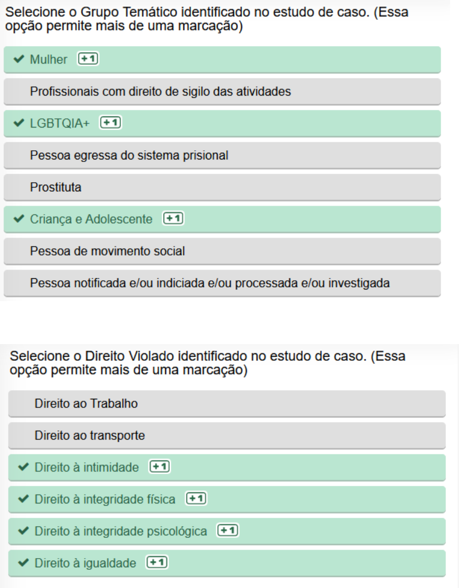 1-Selecione o Tipo de Violação identificada no estudo de caso. (Essa opção permite mais de uma marcação) Violência sexual / Discriminação por orientação sexual / Violência psicológica e/ou verbal 2- 3- Selecione o Direito Violado identificado no estudo de caso. (Essa opção permite mais de uma marcação)
