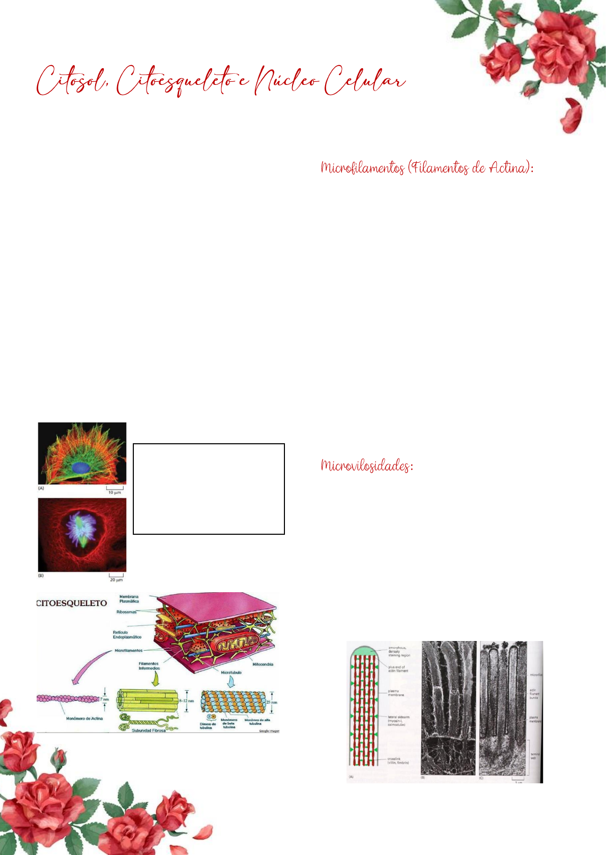 1 Componentes do citoesqueleto: Filamentos proteicos que foram agrupados de acordo com o seu tamanho: − Microfilamentos (Actina): 6 – 8nm de diâmetro • − Filamentos Intermediários: 10nm − Microtúbulos: 25nm Funções gerais: − Garante a estrutura da célula e de suas organelas − Auxilia na organização das atividades celulares − Atua nos movimentos celulares e mudança de forma Funções: - Estrutural • Base e apoio para organoides e constituintes da MP • Sustentação de estruturas especiais - Movimentação • Contrações celulares e musculares • Emissão de pseudópodes (diapedese e fagocitose) - Adesão celular • Justaposição de células - Divisão celular - Expansões da MP: • Aumentam a superfície de contato celular com o substrato • Atuam na absorção de substâncias químicas • Evidentes no Intestino Delgado humano • Organização da actina em forma de feixes de sustentação ➢ Feixes de actina ligados com fimbrina - Filamentos intermediários (azul) - Microtúbulos (verde) - Microfilamentos (laranja) @medvetge 2 Funções: - Organização da polaridade celular • Polarização organizacional das células secretoras • Determinação das porções: apical, basal e lateral da célula - Divisão celular • Formação do fuso mitótico • Separação dos cromossomos durante a mitose - Movimentação das organelas em sua estrutura • Auxílio das proteínas motoras dineína e cinesina - Centro de organização de microtúbulos • Locus celular especifico para montagem dos microtúlos • Localizado próximo ao núcleo celular eucariótico Estruturas de microtúbulos permanentes nas células Formados por: − Envoltório de Membrana Citoplasmática − 9 duplas de microtúbulos periféricos + 1 dupla de microtúbulos central − Proteínas motoras do tipo dineínas interconectadas • Promovem o deslocamento dos microtúbulos, movimentando as estruturas celulares Cílios: mais curtos e em maiores quantidades nas células. Flagelo: mais alongado e geralmente único nas células humanas. Filamentos de peso molecular e espessura intermediários às actinas e microtúbulos. Funções: - Estrutural • Manutenção da forma da célula • Promoção de resistência à estresse mecânico celular - Organização da forma do núcleo • Manutenção do formato arredondado nuclear @medvetge 3 - Montagem: • Associações de proteínas fibrosas - Estrutura celular delimitada por duas biomembranas • Membrana Interna (MI): íntima associação com a cromatina e o nucleoplasma • Espaço Intermembranas ou perinuclear: espaço entre MI e ME (contínuo ao lúmen do Retículo) • Membrana Externa (ME): associação direta com o citosol celular e continuidade com o Retículo Endoplasmático - Presença de poros: • Comunicação direta do núcleo com o citoplasma • Associação entre MI e ME Eucromatina: DNA solto. Heterocromatina: DNA envelopado Funções: − Duplicar o material genético (DNA) da célula mãe − Distribuição das cópias para as células filhas Dividida em 4 fases: Fase M: período de divisão propriamente dita (ocorrência da Mitose e Citocinese) Fase G1 : intervalo entre a Fase M e a Fase S Fase S: síntese de DNA (duplicação do material genético) Fase G2: intervalo entre o término da fase S e o início da fase M Interfase: - Período que corresponde a 3 fases: G1 , S e G2. • Transcrição de genes • Síntese proteica • Aumento de massa • Duplicação cromossômica (S) e condensação dos mesmos - Período de metabolismo intenso e ativo da célula • Duplicação dos organoides • Síntese de macromoléculas • “Estruturação de maquinário para a construção de suas células filhas” @medvetge 4 A mitose é um tipo de divisão celular que ocorre em todas as células eucarióticas e garante a formação de duas células-filhas. É um processo importante para o crescimento e regeneração de organismos multicelulares e para a reprodução assexuada de organismos unicelulares. A mitose pode ser dividida em quatro fases distintas: prófase, metáfase, anáfase e telófase. Esse processo inicia-se após o período de interfase, que compreende o momento entre duas fases de divisão celular. Prófase: Nessa etapa, que é a mais longa da mitose, observa-se a condensação do DNA que foi duplicado no período da interfase. A membrana que envolve o núcleo desorganiza-se e forma vesículas que ficam no citoplasma até o final da mitose, momento em que o envoltório nuclear é reconstruído. Um par de centríolos migra para cada polo da célula e microtúbulos surgem entre eles, dando início à formação do fuso mitótico. Nessa etapa o nucléolo também se desintegra. − Caracteriza-se pela condensação das fibras de cromatina, inicialmente finas e muito alongadas, tornando-se curtas e espessas até formar cromossomos. − Esse processo torna os cromossomos visíveis, individualizados e nitidamente compostos por dois elementos longitudinais idênticos: as cromátides. − A condensação cromossômica é fundamental para evitar o emaranhado ou o rompimento do material genético durante a divisão. Outros eventos que ocorrem nas células durante a prófase são: − Ainda no núcleo, há a desorganização dos nucléolos. − No citoplasma, partindo dos centríolos, formam-se as fibras do fuso mitótico. − Destruição do envoltório nuclear. − Os microtúbulos ligam-se aos centrômeros dos cromossomos.. Metáfase: Nessa etapa da mitose, os cromossomos migram para o plano equatorial da célula. Cada cromossomo possui duas cromátides, as quais se prendem ao microtúbulo por meio de uma região denominada de cinetocoro. Nessa etapa, os cromossomos atingem seu maior grau de compactação. − Os cromossomos em grau de condensação máxima alinham-se na linha média da célula, formando a placa metafásica. Anáfase: os cromossomos separam-se, e cada cromátide segue em direção ao polo da célula. Essa 