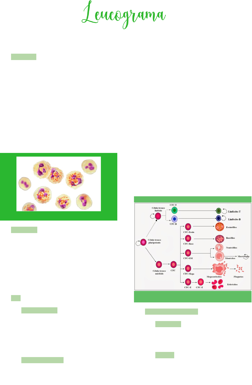 · É a série branca · Ainda estamos falando de hemograma · Leucocitos: neutrófilos, linfocitos, basófilos, eosinófilos e monócitos · Neutrófilo eosinófilo e basófilo: são granulócitos · Monócitos e linfócitos: são agranulócitos · Em estímulos muito intensos se esses leucócitos permanecerem na circulação, eles começam a se hiperpigmentar (formação de mais bolinhas no núcleo). A célula deveria ir embora da circulação mas acaba ficando e consequentemente, vai envelhecendo SÉRIE BRANCA · Quantidade · ….penia (indica baixa quantidade) Ex: neutropenia, basopenia, linfopenia… · …filia (indica alta quantidade) …ose Ex: eosinofilia, neutrofilia, monocitose… · Tipo · Desvio a direita · Quanto mais essa célula está próxima de uma célula madura · Medula não está respondendo, a princípio ✕ · Desvio a esquerda · Quanto mais essa célula é parecida com as células da medula · Medula está respondendo, a princípio ✓ · Quando temos leucócitos em um nível dentro dos níveis de referência ou acima, mas com desvio à esquerda, está ok · Agora quando temos leucócitos em um nível abaixo dos níveis de referência, mas com desvio à esquerda, é indicativo de algo. A medula já está fadigada e acaba enviando as células mais jovens, mesmo que ainda não estejam maduradas · Pode indicar que a medula está respondendo e mandando células novas para combater ou pode ser que o estímulo seja tão grande que, ela já tenha mandado todas as outras células e por último, está enviando essas células que não conseguiram nem ficar maduras ainda TIPOS DE LEUCOCITOSES · Leucocitose fisiológica: · Adrenalina: seja por medo, excitação, exercício físico - vasoconstrição · Neutrofilia e linfocitose · Cortisol: estresse, neutrofilia sem desvio a esquerda · Linfopenia e eosinopenia · Leucocitose patológica: · Condição inflamatória NEUTROFILIA ↑ · Estresse agudo · Exercício físico · Efeito de esteróides (agudo ou crônico) · Resposta a infecção · Neoplasias · Desvio a esquerda → regenerativo NEUTROPENIA ↓ · Infecção viral · Infecções agudas ou crônicas · Depende do momento da coleta!! (neutropenia ou neutrofilia) · Primeiro aumenta a quantidade no vaso sanguíneo mas os neutrófilos vão agir no tecido acometido (diapedese) e não no vaso, então depende do momento da coleta, se é antes ou após esse processo · Pull marginal: neutrófilos grudados e parados no vaso sanguíneo que vão ser liberados apenas quando precisar Cães: 1:1 Gatos: 1:3 · Processo auto-imune · Endotoxemia · Toxinas · Mesma situação que acontece nas infecções (diapedese) · ↓ na produção pela medula óssea EOSINOFILIA ↑ · Reações alérgicas · Parasitismo · Referindo-se a migração tecidual · Principalmente migração pulmonar · Lesão tecidual · Grânulos deles são liberados para chamar outras células · Neoplasias · Mastocitomas em especial · Reprodutivo · No estro (estrogênio) e na gestação EOSINOFILIA ↓ · Iatrogênica · Alguma medicação · Estresse agudo e crônico · Exercício físico intenso e prolongado · Síndrome Cushing · Hiperadrenocorticismo MONOCITOSE ↑ · Quadro inflamatório · Apresentador de antígeno (macrófagos) · Estresse · Anemia hemolítica imunomediada · Neoplasias · Inflamação · Hemorragia · Fazem fagocitose de hemácias · Endocardite bacteriana MONOCITOPENIA ↓ · Monocitopenia sem significado clínico muito importante LINFOCITOSE ↑ · Fisiológica (liberação de adrenalina) · Persistente · Infecções crônicas · Doenças imunomediadas · Imunização recente · Tempo é individual para cada animal · Leucemia LINFOPENIA ↓ · Neoplasias · Infecções virais · Parvovírus - predileção por esses tipos de células · Quilotórax · Formação de linfa acumulada · Imunodeficiências - FIV e FeLV · Hipercortisolemia (endógeno ou exógena): · Estresse, Síndrome de Cushing BASÓFILOS? · São muito semelhantes ao eosinófilos (mesmas funções) · Estão em quantidade muitíssimo pequena · Não tem muito significado clínico conhecido ALTERAÇÕES MORFOLÓGICAS · Nucleares: · Hipersegmentação · Citoplasmáticas: · Alterações tóxicas · Corpúsculos de inclusão (acontecem em situações específicas) · Tamanho ou forma: · Neutrófilos gigantes - indicativo de reatividade HEMOPARASITAS · 1 foto: neutrófilo com corpúsculos de lentz patognomônicos de cinomose · 2 foto: linfócito com corpúsculos de lentz patognomônicos de cinomose · 3 foto: neutrófilo com uma ehrlichia canis (erliquiose) · 4 foto: neutrófilo com hepatozoon · 5 foto: neutrófilo com sete parasitas de leishmania · 6 foto: macrófago tecidual com rangelia · 7 foto: parasitas fora da célula, no plasma, que é o tripanossomo PLAQUETAS · Quantidade · Trombocitopenia → baixa de plaquetas · Baixa de plaquetas podem vão resultar em problemas de coagulação · Maior relevância · Cromocitose → aumento de plaquetas · Morfologia: pedaços de células · Imagem: ehrlichia platys presente dentro de plaquetas · Sozinha em si não é tão patogênica. O problema é encontrar junto com outra coisa como uma babesia por exemplo PLASMA · Tem fibrinogênio, diferentemente do soro · Veículo de transporte para as plaquetas · Composto de proteínas, anticorpos, células · Cor transparente ou levemente amarelada · Pode ter alterações de cor: · Hemolisado - mais avermelhado · Ictérico - mais amarelado · Lipêmico - esbranquiçado/ turvo · Geralmente fica com aspecto hemolisado junto também