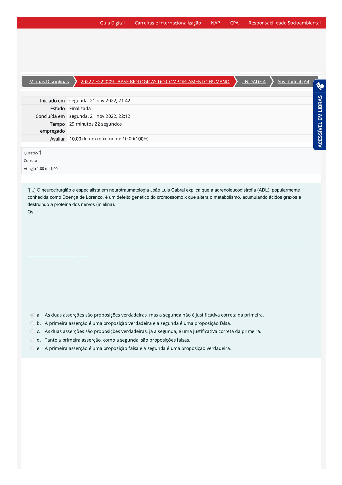 21/11/2022 22:12 Atividade 4 (A4): Revisão da tentativa https://ambienteacademico.com.br/mod/quiz/review.php?attempt=1418714&cmid=593903 1/6 Minhas Disciplinas 20222-E222009 - BASE BIOLOGICAS DO COMPORTAMENTO HUMANO UNIDADE 4 Atividade 4 (A4) Iniciado em segunda, 21 nov 2022, 21:42 Estado Finalizada Concluída em segunda, 21 nov 2022, 22:12 Tempo empregado 29 minutos 22 segundos Avaliar 10,00 de um máximo de 10,00(100%) Questão 1 Correto Atingiu 1,00 de 1,00 “[...] O neurocirurgião e especialista em neurotraumatologia João Luis Cabral explica que a adrenoleucodistrofia (ADL), popularmente conhecida como Doença de Lorenzo, é um defeito genético do cromossomo x que altera o metabolismo, acumulando ácidos graxos e destruindo a proteína dos nervos (mielina). Os sintomas se dão pelo atraso no desenvolvimento neuropsicomotor desde o nascimento. O tratamento baseia-se em terapia global multidisciplinar. É feito com hormônios adrenais e transplante de medula óssea. [...] <mãe pede ajuda após filhos com doença rara perder todos os movimentos. G1, 9 dez. 2019. Acesso em: 20/jun/2020 Disponível em: https://g1.globo.com/sp/santos-regiao/noticia/2019/12/09/mae-pede-ajuda-apos-filho-com-doenca-rara-perder- todos-os-movimentos.ghtml Considere o fragmento de texto, a temática adrenoleucodistrofia e avalie as afirmações a seguir. I. A adrenoleucodistrofia é um defeito metabólico condicionado geneticamente, associado ao cromossomo X. PORQUE II. O acúmulo de ácidos graxos de cadeia muito longa ocasiona prejuízos ao sistema nervoso central e glândulas adrenais. A respeito dessas asserções, e da relação proposta entre elas, é correto afirmar a. As duas asserções são proposições verdadeiras, mas a segunda não é justi�cativa correta da primeira. b. A primeira asserção é uma proposição verdadeira e a segunda é uma proposição falsa. c. As duas asserções são proposições verdadeiras, já a segunda, é uma justi�cativa correta da primeira. d. Tanto a primeira asserção, como a segunda, são proposições falsas. e. A primeira asserção é uma proposição falsa e a segunda é uma proposição verdadeira. Guia Digital Carreiras e Internacionalização NAP CPA Responsabilidade Socioambiental https://ambienteacademico.com.br/my/ https://ambienteacademico.com.br/course/view.php?id=23853 https://ambienteacademico.com.br/course/view.php?id=23853§ion=6 https://ambienteacademico.com.br/mod/quiz/view.php?id=593903 https://g1.globo.com/sp/santos-regiao/noticia/2019/12/09/mae-pede-ajuda-apos-filho-com-doenca-rara-perder-todos-os-movimentos.ghtml https://codely-fmu-content.s3.amazonaws.com/Moodle/GuiaDigital/Guia+digital/index.html https://informa.fmu.br/carreiras/ https://codely-fmu-content.s3.amazonaws.com/Moodle/NAP/inicial/nap/fmu/index.html https://codely-fmu-content.s3.amazonaws.com/Moodle/CPA/landing_CPA/index.html https://portal.fmu.br/sustentabilidade 21/11/2022 22:12 Atividade 4 (A4): Revisão da tentativa https://ambienteacademico.com.br/mod/quiz/review.php?attempt=1418714&cmid=593903 2/6 Questão 2 Correto Atingiu 1,00 de 1,00 Questão 3 Correto Atingiu 1,00 de 1,00 “Os sintomas da doença de Parkinson podem se manifestar de maneiras diferentes em cada indivíduo. Eles aparecem primeiramente em um dos lados do corpo e costumam se agravar nessa região, mas isso não quer dizer que o outro lado também não vá ser afetado. O tratamento exige uma abordagem multidisciplinar com médico, psicólogo, fisioterapeuta, fonoaudiólogo e profissional da área de educação física. Com a fisioterapia, é possível reduzir as limitações de mobilidade dessas pessoas, promovendo maior independência nas atividades da vida diária. "Os exercícios de agilidade, dissociação de tronco, treino de marcha, postura e coordenação motora contribuem para a melhoria da qualidade de vida dos pacientes que convivem com essa doença", explica a fisioterapeuta Luciane Criado Oliveira.” BORTOLETO, G. Doença de Parkinson. Diário da Região, 23 maio 2020. Disponível em: https://www.diariodaregiao.com.br/vida-e- estilo/saude-e-beleza/2020/05/1193975-doenca-de-parkinson.html. Acesso em: 21 jun. 2020. Considere o fragmento de texto, a temática doença de Parkinson e avalie as afirmações a seguir. I. Tremores, desequilíbrio, rigidez muscular e dificuldade de locomoção são os sintomas das pessoas acometidas pela doença de Parkinson. PORQUE II. A doença de Parkinson é degenerativa, progressiva, não tem cura e prejudica o sistema nervoso central. A respeito dessas asserções, e da relação proposta entre elas, é correto afirmar a. As duas asserções são proposições verdadeiras, e a segunda é uma justi�cativa correta da primeira. b. A primeira asserção é uma proposição falsa e a segunda é uma proposição verdadeira. c. A primeira asserção é uma proposição verdadeira e a segunda é uma proposição falsa. d. As duas asserções são proposições verdadeiras, mas a segunda não é justi�cativa correta da primeira. e. Tanto a primeira asserção, como a segunda, são proposições falsas. “Em 30 de maio, é comemorado anualmente o Dia Mundial da Esclerose Múltipla, doença que afeta cerca de 2,5 milhões de pessoas no mundo, sendo 35 mil brasileiros, de acordo com dados da Associação Brasileira de Esclerose Múltipla (ABEM). Ainda de acordo com a ABEM, a doença possui maior incidência entre pessoas de 20 a 40 anos, afetando majoritariamente as mulheres. Pensando na importância da data comemorativa para a conscientização da população, explicamos quais os sintomas da doença. Que não tem cura, mas conta com tratamentos clínicos e tratamentos alternativos, como a prática de atividade física, para proporcionar uma qualidade de vida melhor para os pacientes. Por isso, mais abaixo sugerimos uma série de exercícios físicos que auxiliam no controle dos efeitos da Esclerose Múltipla. Que, como explica o neurocirurgião Cezar Augusto, me