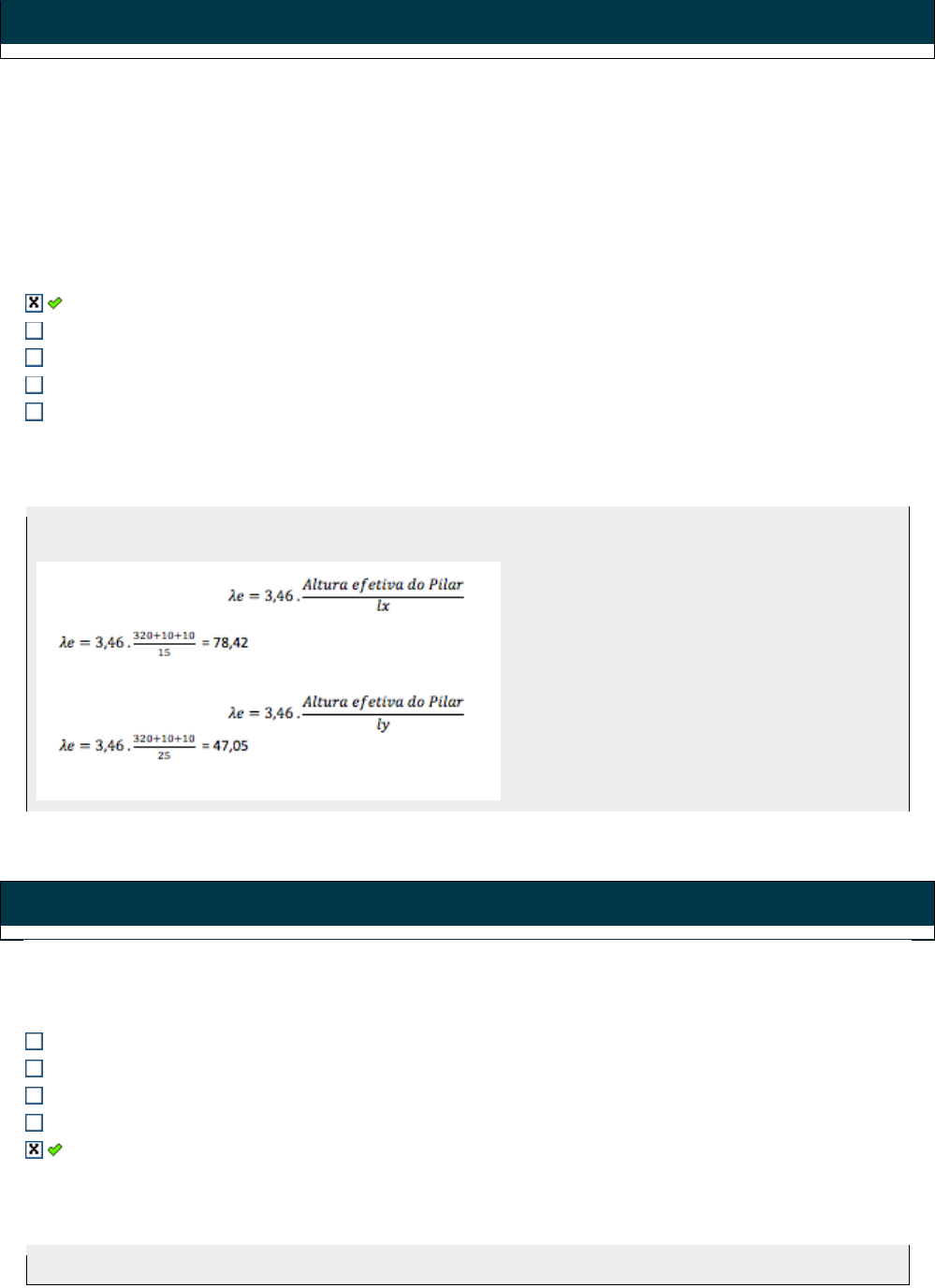 1a Questão Acerto: 1,0 / 1,0 O índice de esbeltez está relacionado a sucetibilidade à flambagem. Quais os resultados do índice de esbeltez para um pilar com uma altura com 3,20 metros. As dimensões dos pilares são as apresentadas abaixo: lx igual a 0,15 metros; ly igual a 0,25 metros lajes inferior e superior com 0,20 metros de espessura λe para lx = 78,42 / λe para ly = 47,05 λe para lx = 59,67 / λe para ly = 49,50 λe para lx = 56,90 / λe para ly = 49,52 λe para lx = 61,90 / λe para ly = 39,65 λe para lx = 140,90 / λe para ly = 102,92 Respondido em 24/03/2023 10:42:04 Explicação: 2a Questão Acerto: 1,0 / 1,0 Os esforços solicitantes podem determinar a reação do material à forças externas. Calcule os Esforços solicitantes sob um Pilar de canto, cuja dimensão é 20 cm x 25 cm e Nk = 420 kN, como apresentado abaixo. 520 kN 498 kN 640 kN 450 kN 588 kN Respondido em 24/03/2023 10:51:26 Explicação: Nd = γn . γf . Nk Nd = 1,0 . 1,4 . 420 Nd = 588 kN 3a Questão Acerto: 1,0 / 1,0 O pré-dimensionamento é necessário para se determinar as dimensões de pilares em edificações. Elabore o pré-dimensionamento de um pilar lateral que possui as seguintes características: ϒf = 1,4 Nk = 500 kN Fck = 30 290 cm² 655 cm² 736 cm² 370 cm² 553 cm² Respondido em 24/03/2023 10:50:40 Explicação: 4a Questão Acerto: 1,0 / 1,0 O pilar de concreto armado ( fck = 25 MPa e fyk = 500 MPa ) tem seção transversal retangular com dimensões cx = 30 cm e cy = 100 cm e comprimento equivalente L = 3 m. Está submetido a uma força normal característica centrada igual a Nk = 5500 kN e ao momento fletor de cálculo de Md = 184,8 kN.m. Dado o ábaco abaixo, marque a opção que apresenta o valor da área A, indicada no ábaco. Figura 24. Ábaco (Montoya, 2009 pág.489) 67,8 cm 2 28,6 cm 2 33,9 cm 2 52,7 cm 2 22,1 cm 2 Respondido em 24/03/2023 10:57:12 Explicação: 5a Questão Acerto: 0,0 / 1,0 É planejada a construção de um quartel do corpo de bombeiros em um terreno que hoje é uma Fazenda com Sebes. Em qual categoria, quanto aos Fatores de Rugosidade (S2), esta localidade se aplica? Categoria IV Categoria I Categoria III Categoria II Categoria V Respondido em 24/03/2023 10:45:10 Explicação: Quanto aos Fatores de Rugosidade (S2), o terreno se aplica a Categoria III, que consiste em: Terrenos planos ou ondulados com obstáculos, tais como sebes e muros, poucos quebra-ventos de árvores, edificações baixas e esparsas. Nesta categoria estão granjas e casas de campo, com exceção das partes com matos; fazendas com sebes e/ou muros; subúrbios a considerável distância do centro, com casas baixas e esparsas. Nestes casos a cota média do topo dos obstáculos é considerada igual a 3,0 m. 6a Questão Acerto: 1,0 / 1,0 É planejada a construção de um edifício comercial em uma região onde os Fatores Topográficos possuem características Planas. Nestas condições, qual é o resultado de S1? 0,8 0,9 1,0 0,7 0,5 Respondido em 24/03/2023 10:45:03 Explicação: Segundo a NBR 6123/1988, para Terrenos Planos ou Quase Planos, o resultado de S1=1,0 7a Questão Acerto: 0,0 / 1,0 Um edifício será construído na Cidade de Balneário Camboriú, no Estado de Santa Catarina. Neste Caso, qual será a Velocidade Básica do Vento (V0) sob a edificação. V0 = 30 m/s V0 = 45 m/s V0 = 35 m/s V0 = 50 m/s V0 = 40 m/s Respondido em 24/03/2023 11:03:05 Explicação: Segundo a Figura 01 da NBR 6123/1988, é determinado que V0 = 45 m/s. 8a Questão Acerto: 1,0 / 1,0 O concreto é um dos materiais mais presentes em obras civis, além de ser um material que apresenta elevada resistência à compressão. Com relação aos sistemas de protensão, tem-se aspectos referentes a aderência da armadura protendida com o concreto. Em relação a esses aspectos, identifique as afirmativas a seguir como verdadeiras (V) ou falsas (F): I. Comparando a protensão aderente em relação a não aderente, pode-se afirmar que a primeira tem uma proteção da armadura maior contra a corrosão fora da obra. II. Comparando a protensão aderente em relação a não aderente, pode-se afirmar que a falha de um cabo tem consequências restritas na primeira. III. Comparando a protensão aderente em relação a não aderente, pode-se afirmar que a primeira possui um aumento da capacidade das seções do ELU ao ser comparado com a segunda. IV. Comparando a protensão não aderente em relação aderente, pode-se afirmar que a primeira apresenta perdas por atrito bem baixas. V. Comparando a protensão não aderente em relação aderente, pode-se afirmar que a primeira elimina a operação de injeção da nata de cimento. Assinale a alternativa que apresenta a sequência correta, de cima para baixo. V - V - F - V - V. F - V - V - V - V. V - V - V - F - V. V - F - V - F - V. F - F - F - V - V. Respondido em 24/03/2023 10:44:37 Explicação: A única falsa é a afirmativa I: a protensão não aderente tem uma proteção maior da armadura fora da obra, uma vez que os cabos são envolvidos por uma capa plástica. As demais afirmativas são verdadeiras. 9a Questão Acerto: 1,0 / 1,0 O concreto é um dos materiais mais presentes em obras civis, além de ser um material que apresenta elevada resistência à compressão. As cunhas e ancoragens são dispositivos muito utilizados no concreto protendido, sobre esses materiais é CORRETO afirmar: Todas as empresas que fazem o serviço de protensão possuem sua própria lista de produtos, tais como ancoragens e cunhas. As cunhas são excelentes dispositivos de ancoragem, mas infelizmente são caras e complexas de se utilizar. Os dispositivos de ancoragem do sistema de pós tração aderente é o mesmo do de pós tração não aderente. As cunhas são utilizadas apenas no sistema de pós-tração aderente. A ancoragem ativa é a extremidade em que o estiramento é realizado, enquanto a ancoragem passiva é a extremidade que os cabos são apenas fixados. Respondido em 24/03/2023 11:04:05 Expli