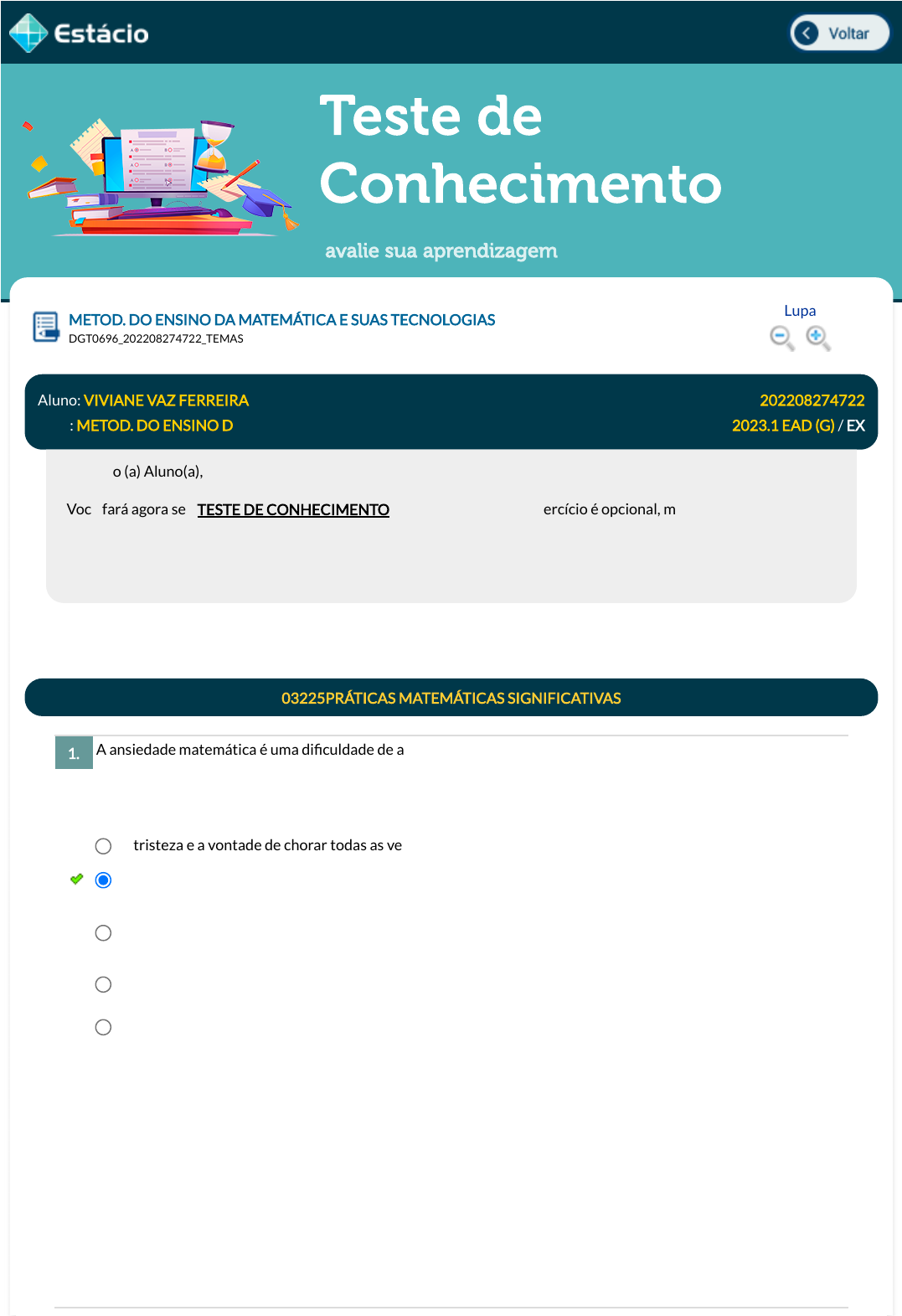 25/03/2023, 10:38 Estácio: Alunos https://simulado.estacio.br/alunos/ 1/6 Teste de Conhecimento avalie sua aprendizagem A ansiedade matemática é uma di�culdade de aprendizado que causa problemas sistêmicos ao ensino da disciplina. Qual das sentenças a seguir é a de�nição operacional de ansiedade matemática, segundo Gris, G., Palombarini, L. d., & Carmo, J. d. (v. 33, n. 64, ago. 2019) - "Uma Revisão Sistemática de Variáveis Relevantes na Produção de Erros em Matemática", Bolema, Rio Claro, pp. 649-671)? METOD. DO ENSINO DA MATEMÁTICA E SUAS TECNOLOGIAS Lupa DGT0696_202208274722_TEMAS Aluno: VIVIANE VAZ FERREIRA Matr.: 202208274722 Disc.: METOD. DO ENSINO D 2023.1 EAD (G) / EX Prezado (a) Aluno(a), Você fará agora seu TESTE DE CONHECIMENTO! Lembre-se que este exercício é opcional, mas não valerá ponto para sua avaliação. O mesmo será composto de questões de múltipla escolha. Após responde cada questão, você terá acesso ao gabarito comentado e/ou à explicação da mesma. Aproveite para se familiarizar com este modelo de questões que será usado na sua AV e AVS. 03225PRÁTICAS MATEMÁTICAS SIGNIFICATIVAS 1. A tristeza e a vontade de chorar todas as vezes que tem de lidar com matemática. Reações comportamentais, cognitivas e �siológicas frente a situações em que o indivíduo é requisitado a apresentar um desempenho matemático adequado. Reações como taquicardia, sudorese, enxaquecas, alterações no sono, entre outros sintomas. Essas manifestações ocorrem, geralmente, às vésperas ou no dia da prova ou quando o uso de matemática é requisitado. Alta intensidade da estimulação aversiva, alta frequência do uso de controle aversivo; baixa controlabilidade da estimulação aversiva. Pensamentos descoordenados; sensação de "deu branco" sensação de impotência. Auto atribuições negativas, baixa autoestima e baixa autoe�cácia erros frequentes. Data Resp.: 25/03/2023 10:20:57 Explicação: A constante exposição aversiva em ambientes de ensino e aprendizagem, no caso especí�co da matemática acaba gerando este quadro geral de ansiedade, contudo é necessário apresentarmos uma de�nição operacional da ansiedade matemática (AM), o trabalho de Gris, Palombarini & Carmo (2019) sugere reações comportamentais, cognitivas e �siológicas diante de situações em que o indivíduo é requisitado a apresentar um desempenho matemático adequado. javascript:voltar(); javascript:voltar(); javascript:diminui(); javascript:aumenta(); 25/03/2023, 10:38 Estácio: Alunos https://simulado.estacio.br/alunos/ 2/6 A ansiedade matemática é a reação a sensação de não entendimento matemático instalado em nossa sociedade. Aqueles que possuem esse quadro terão di�culdades de concentração ao fazer exercícios matemáticos ou mesmo pode �car agressivo ao ser questionado pelo professor na sala de aula sobre alguma atividade. Qual das reações a seguir é caracterizada como uma reação �siológica de um estudante que está sofrendo de ansiedade matemática? A Base Nacional Comum Curricular (BNCC) considera o raciocínio, a representação, a comunicação e argumentação, processos de aprendizagem potencialmente ricos para o desenvolvimento do Letramento Matemático. Considerando esses processos, avalie as a�rmações a seguir como estratégias que contribuem para o desenvolvimento do Letramento Matemático, I. A resolução de Problemas II. A investigação III. Os Projetos e Modelagem IV. A representação e comunicação É correto o que se a�rma em: 2. Taquicardia, sudorese, mãos trêmulas e frias, enxaquecas. Pensamentos descoordenados; sensação de "deu branco". A fuga e a esquiva. Sensação de impotência (quanto mais tenta mais fracassa). Autoatribuições negativas, baixa autoestima e baixa autoe�cácia erros frequentes. Data Resp.: 25/03/2023 09:45:50 Explicação: Reações �siológicas: taquicardia, sudorese, mãos trêmulas e frias, enxaquecas, gastralgias, alterações na pressão sanguínea, alterações no sono (pesadelos; insônia, sensação de que não descansou; náusea). Tais manifestações ocorrem geralmente às vésperas ou no dia da prova ou quando o uso de matemática seja requisitado. 03226LETRAMENTO MATEMÁTICO 3. I, II e III I e IV II, III e IV III e IV I e II Data Resp.: 25/03/2023 10:24:03 Explicação: As estratégias que podem abrir espaço para o desenvolvimento do Letramento Matemático vão muito além do cálculo e estão intrinsicamente relacionadas à construção do raciocínio e da argumentação. Assim, são consideradas grandes estratégias para esse �m a resolução de problemas, a investigação e os projetos de modelagem. A representação e comunicação são competências e não estratégias. 4. 25/03/2023, 10:38 Estácio: Alunos https://simulado.estacio.br/alunos/ 3/6 O aprendizado da Matemática precisa promover experiências e vivências que permita aos estudantes serem protagonistas e criadores. Desse modo, uma questão de concepção de Matemática e de Educação é promover o protagonismo : A matemática e a arte podem facilmente ser relacionadas ao longo da história. O movimento artístico que se pautava na utilização de geometria para suas obras é: Quando jogamos uma bola para um cachorro e percebemos sua trajetória "matemática", podemos ter dúvida se o cão calculava a distância ou não. Mas o mistério não é o buscar a bolinha, mas a nossa capacidade de ver um modelo matemático que descreve esse ¿mistério¿ pode ser representado conforme a �gura a seguir: Reconhecendo a Matemática como cálculo; Considerando os procedimentos matemáticos pautados na constatação; Considerando a aprendizagem da matemática a partir das vivências escolarizadas; Associando a aprendizagem à transmissão e a Matemática aos procedimentos; Relacionando a Matemática à prática social e ao mundo do trabalho; Data Resp.: 25/03/2023 10:24:45 Explicação: Uma questão de